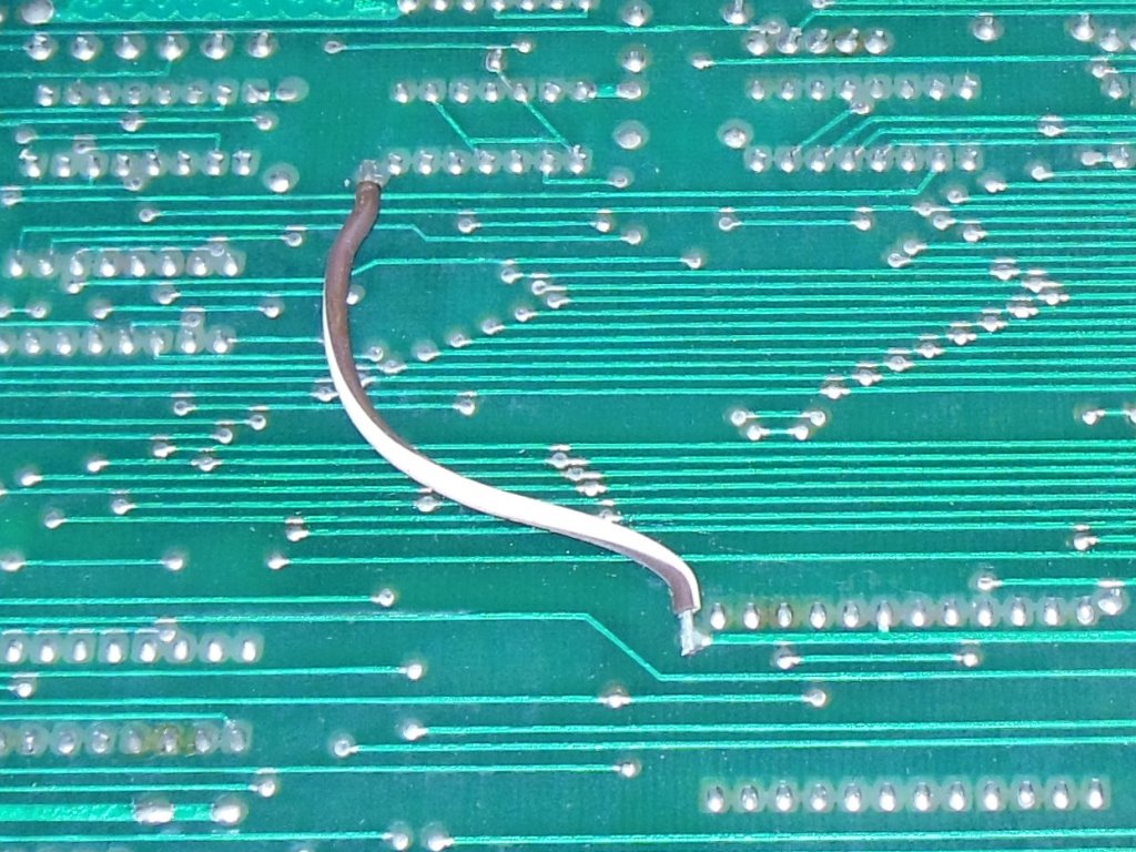 The first problem to sort out was that the video connector couldn't be plugged in because a broken pin was wedged into the PCB socket. This type of socket is long since out of production and I hadn't found any source for NOS ones. Since the broken pin was in the last socket of the row, I decided to try to open up the side of the socket to remove the pin. Using a craft knife I removed a small section of the side wall and was able to retrieve the broken pin. The socket appeared to be otherwise undamaged.