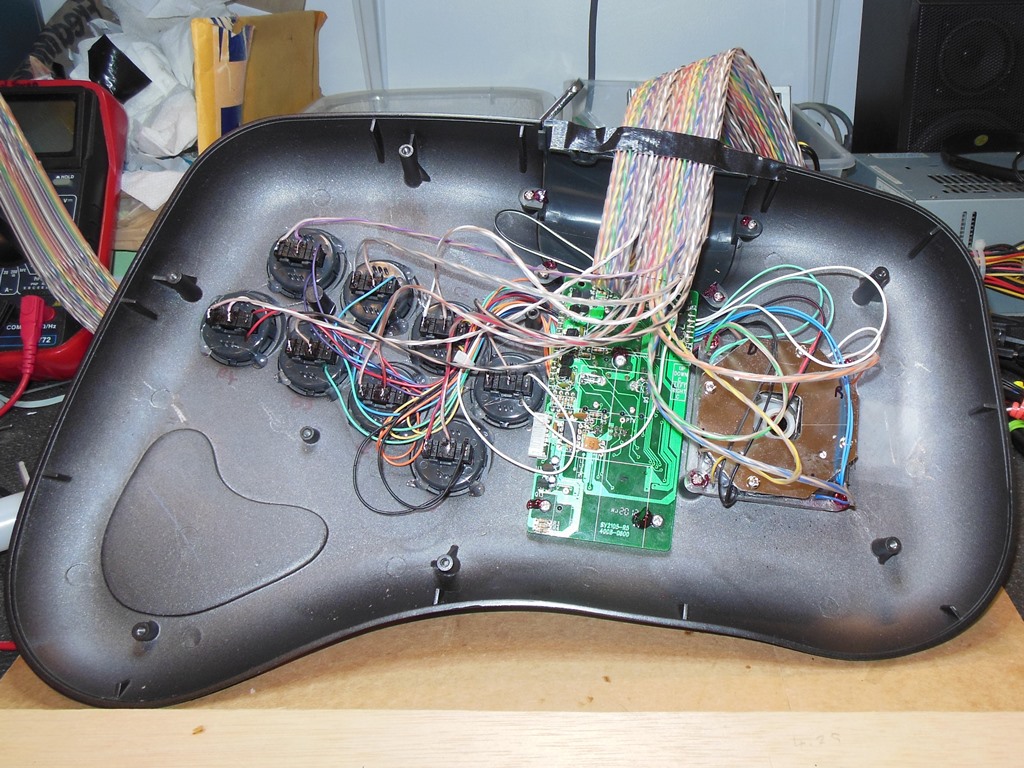 Up to now I'd managed to avoid building a control panel for the Zaccaria matrix input configuration. Since I was bringing up a new game PCB and I would otherwise have to put in the cabinet for final play testing I decided to bite the bullet and convert an unused PlayStation arcade control panel for use with matrix games. The idea was to route out both sides of every switch via a wide ribbon cable to a finger board that would hold the diodes. Each game would then have a simple adaptor to connect them to the matrix control panel.