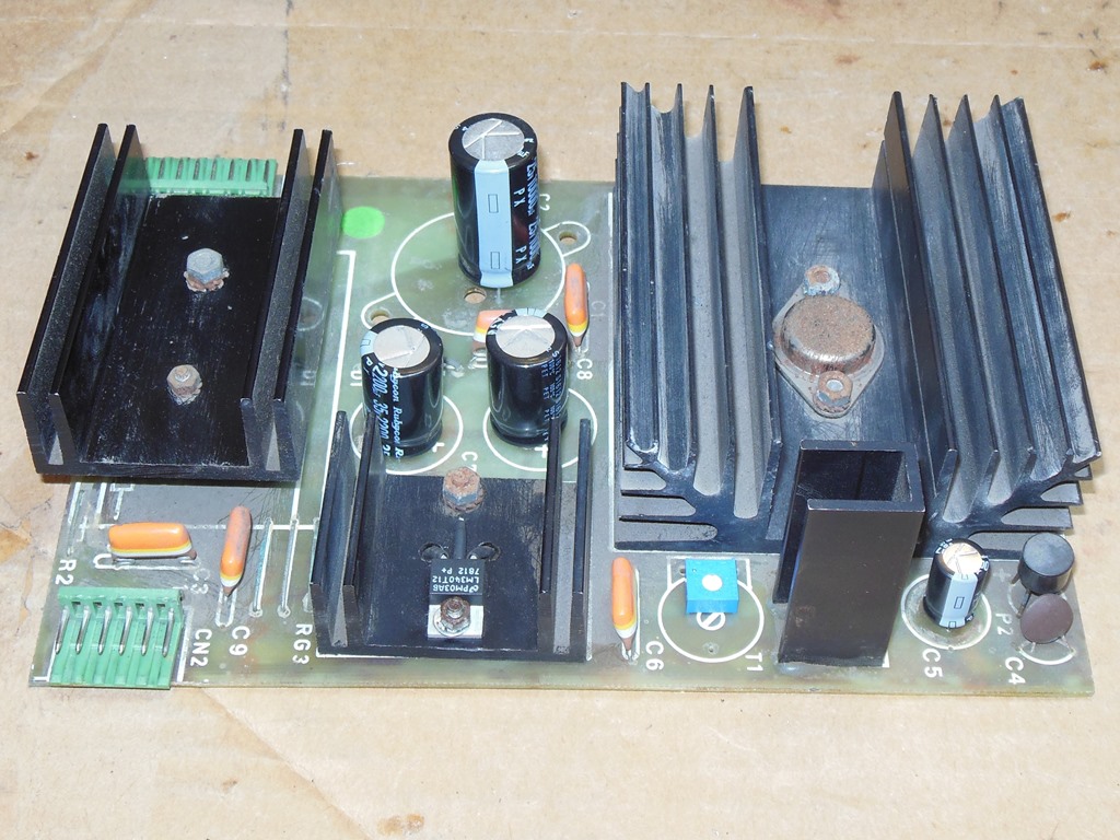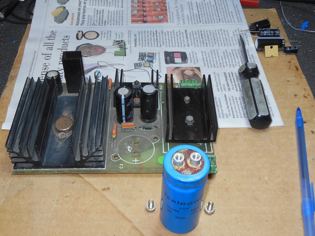 Unscrewing the large +5V smoothing capacitor found it leaking & corroded around the screw terminals, confirming the need for a cap kit.