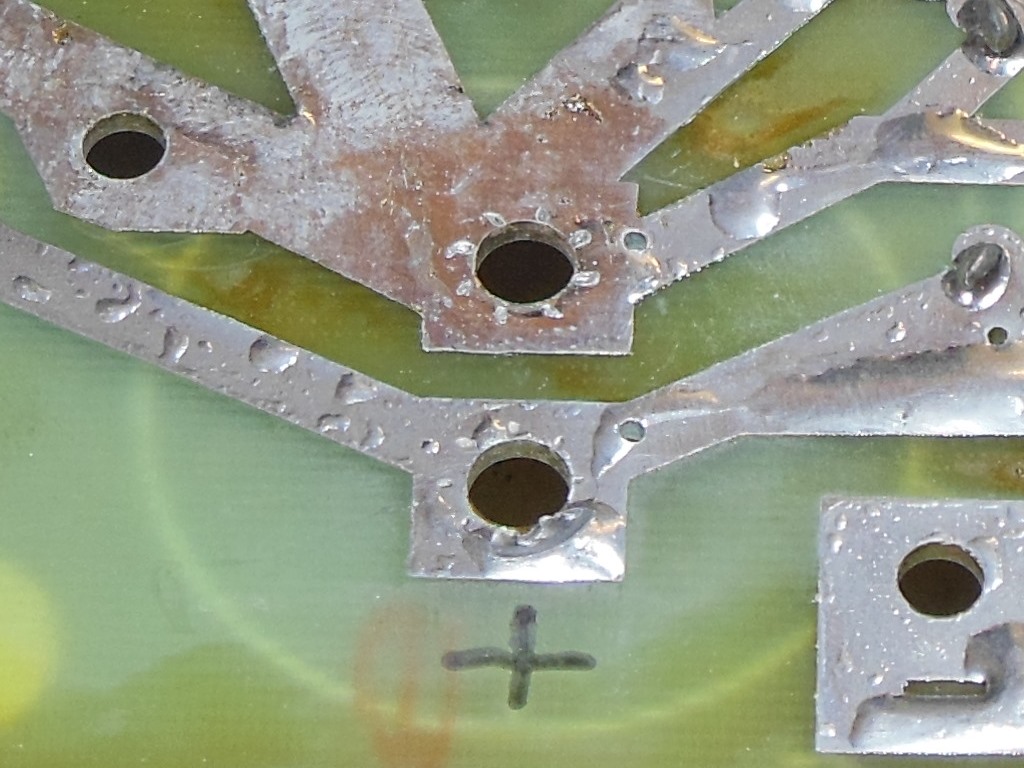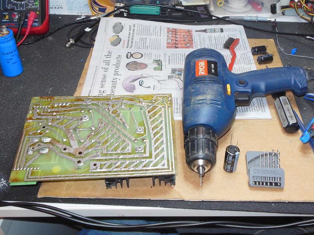 As an early example of the 1B1126 it didn't have the extra holes to allow for a through hole capacitor instead of the screw terminal type. A fine pitch drill bit was used to put in the two through holes and complete the cap kit. The connector pins for power input and output were also gently cleaned with a wire-brush Dremel.