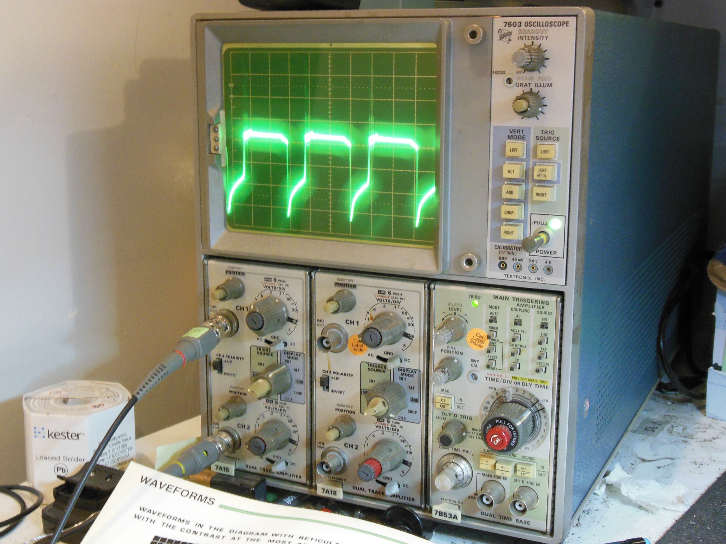 Checking the base drive TP12 of TR17 (BU208A) the Horizontal Output Transistor (HOT) on the scope found a horrible mess. Removing and checking TR17 using a back-to-back diode test found no issue. TR17 was fitted back into its socket but leaving the can (collector) isolated to allow the base drive at TP12 to be checked without the LOPT connected. The signal looked clean and similar to the reference diagram in the manual. I suspected the LOPT was bad.