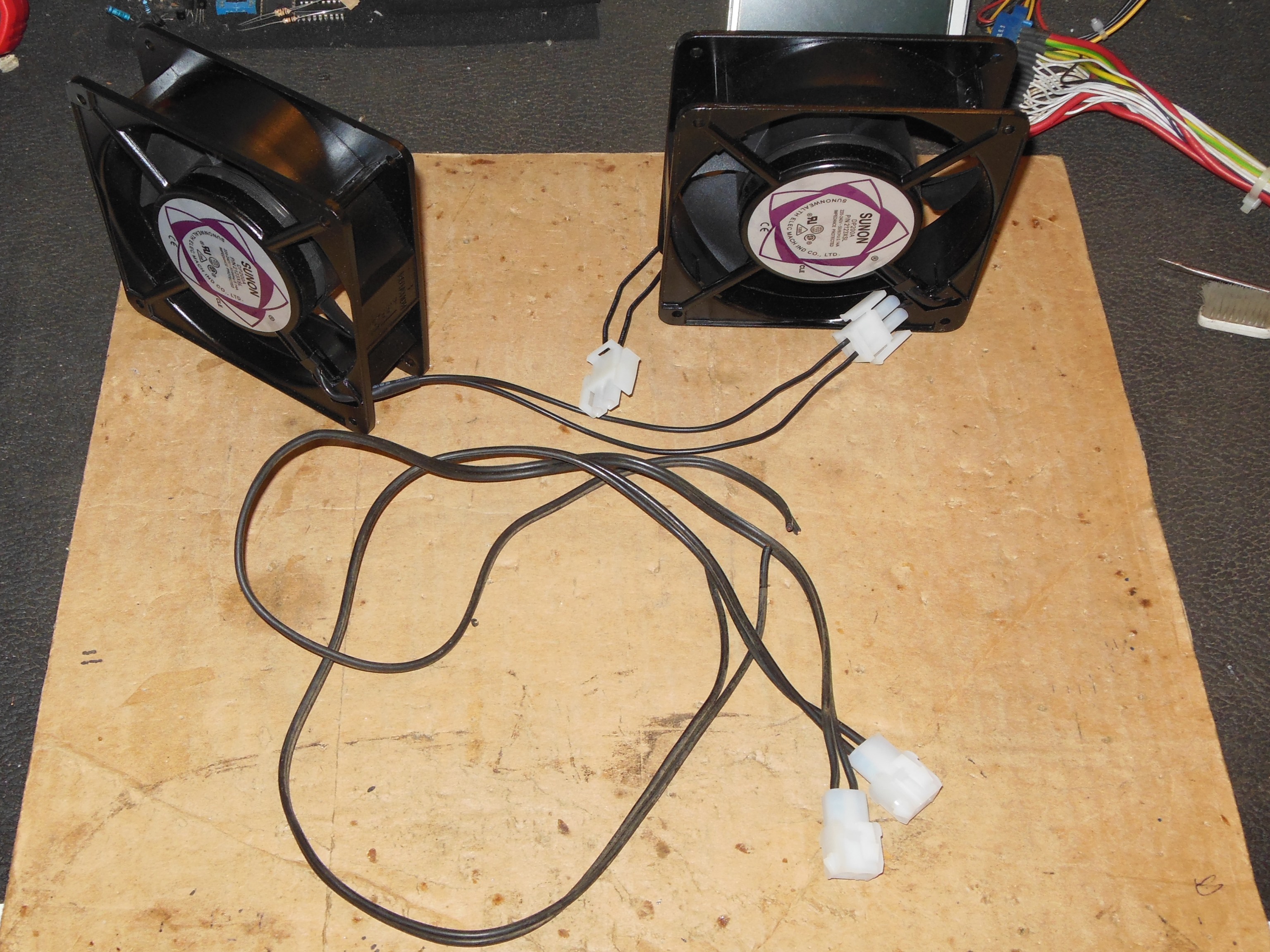 Three games in this style of cabinet, Astro Wars, Super Galaxian (Galaxia) and Sea Scare did not have interior fans that were used in later cabinets. All three had seen regular failures during the show so I decided to evaluate adding a temporary fan using a Sunon DP200A 220V fan, power cable and crocodile clips to attach to the transformer taps.