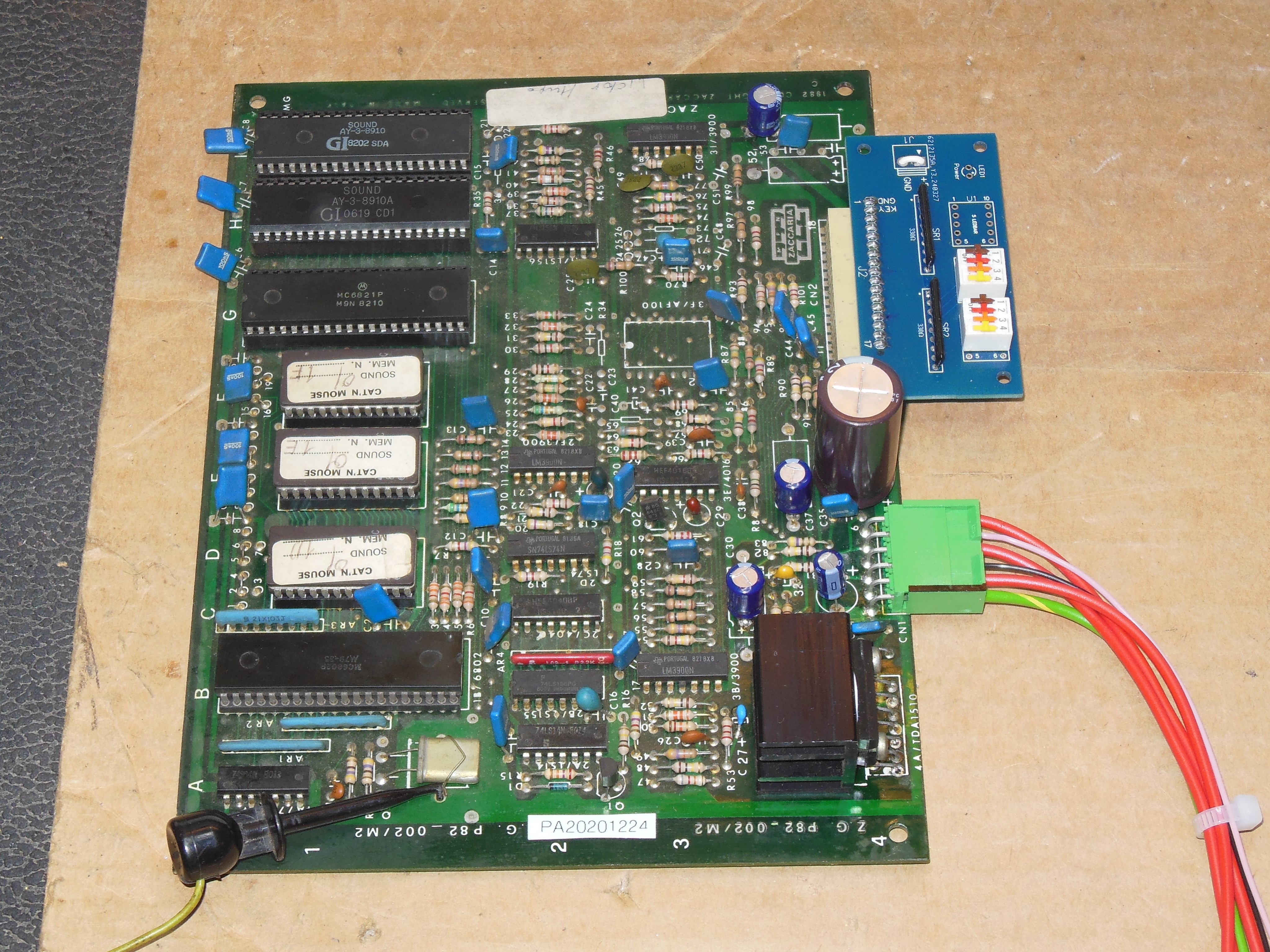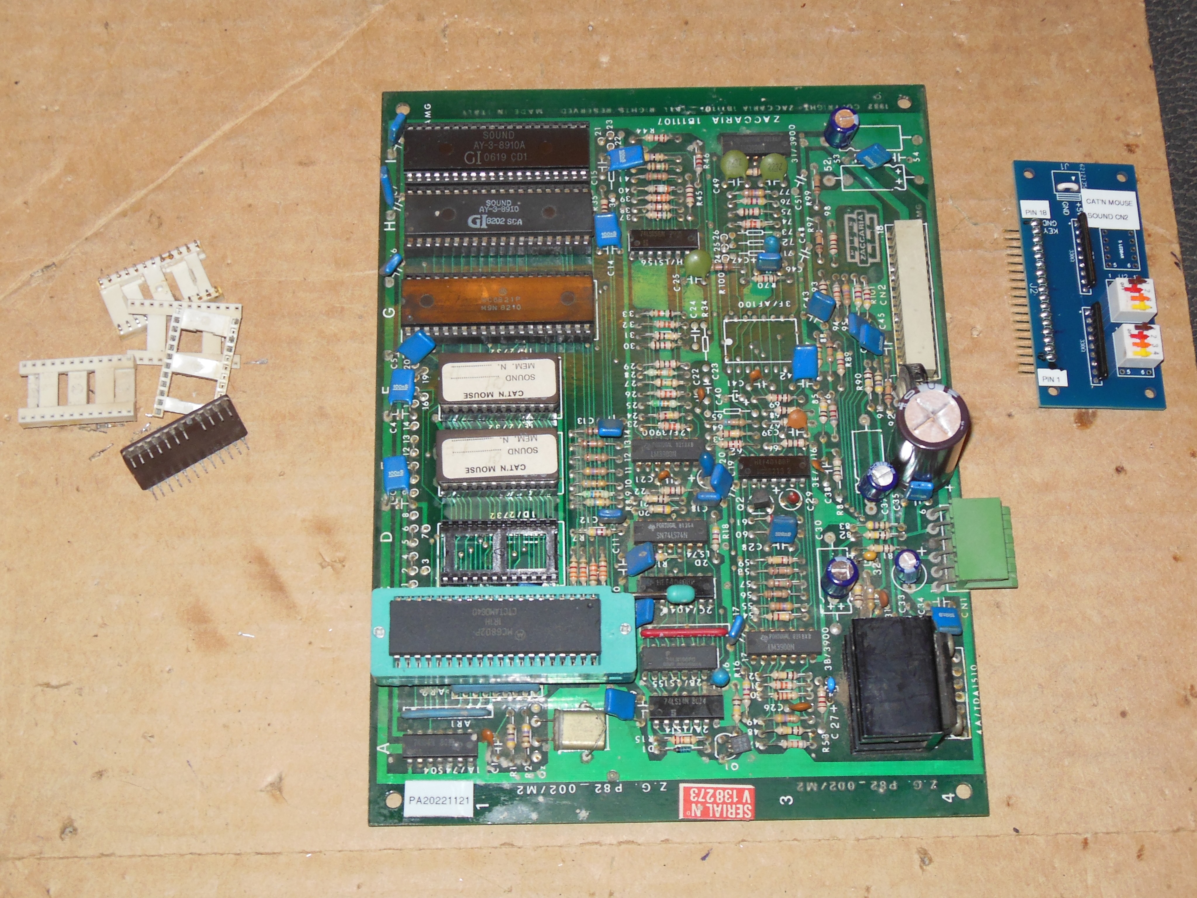 On the bench music stuttered & froze after a few seconds of play and didn't recover. Checking with the Arduino ICT "ROM Check All" failed "E:1E f001 8e ff". Individually checking all of the ROMs confirmed IC 1F, 1D passed and IC 1E failed. Reseating IC 1E caused the test to pass and the "AY Check" also passed. This sound board used the same white IC sockets seen on other early Zaccaria games that were prone to corrosion failure. Whilst cleaning the EPROMs, one pin of IC 1D was rusted through and broke off. All the white IC EPROM sockets were replaced, and a new IC 1D EPROM programmed. On retest, the music played without issue and the board was declared fixed.