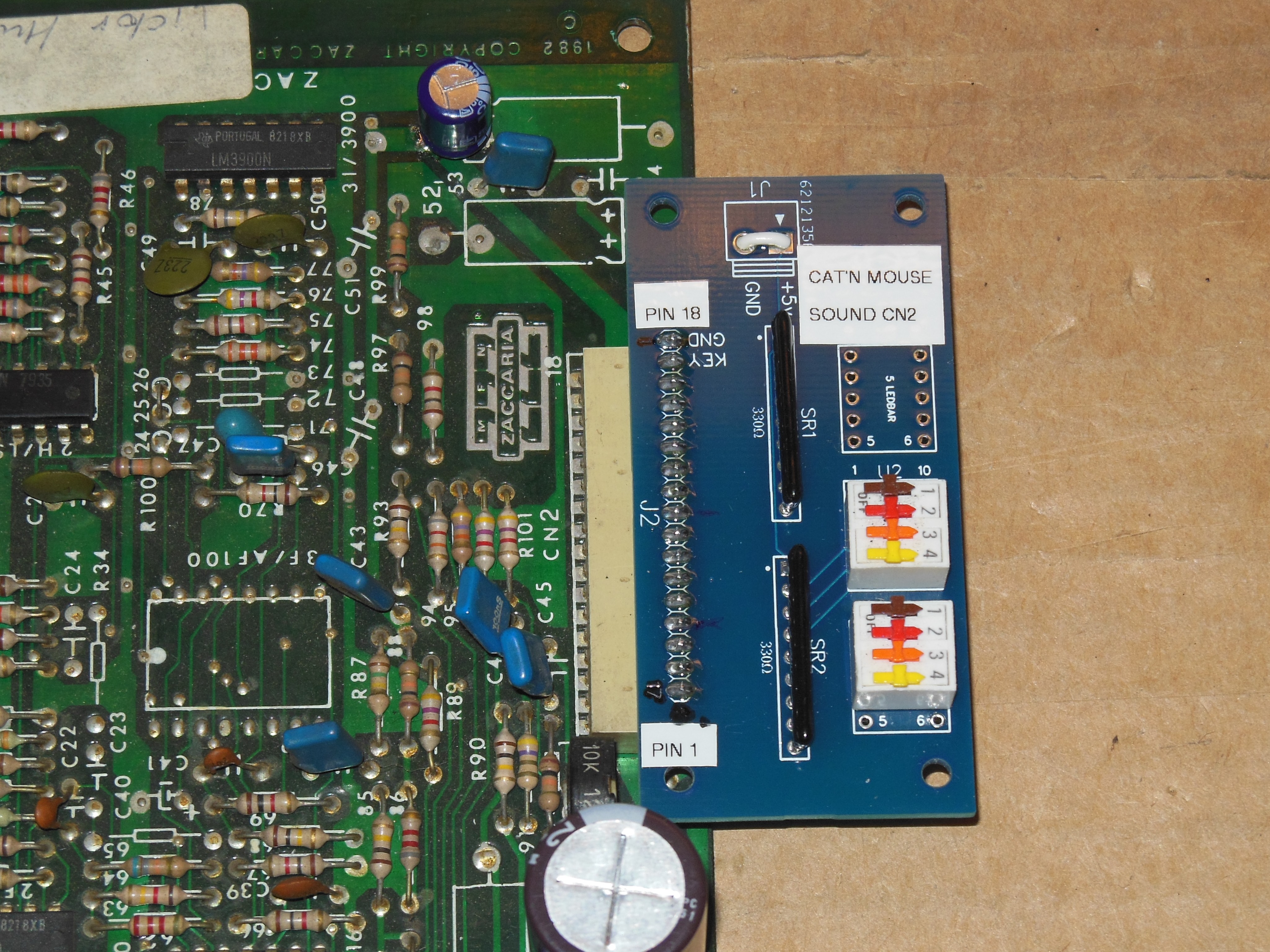 Chris Force from the Northwest Pinball Collective had designed a small learning PCB that was intended as a LED indicator control panel input tester. Swapping the LED bar displays for DIP switches and bridging the power supply connector made it into a perfect sound command input exerciser for this (and other) later Zaccaria sound boards. The AY-3-8910 inputs have a built in 200uA pull up and the original resistors for the LED bar were 330R that calculates to a 0.066V drop still meeting logic low.