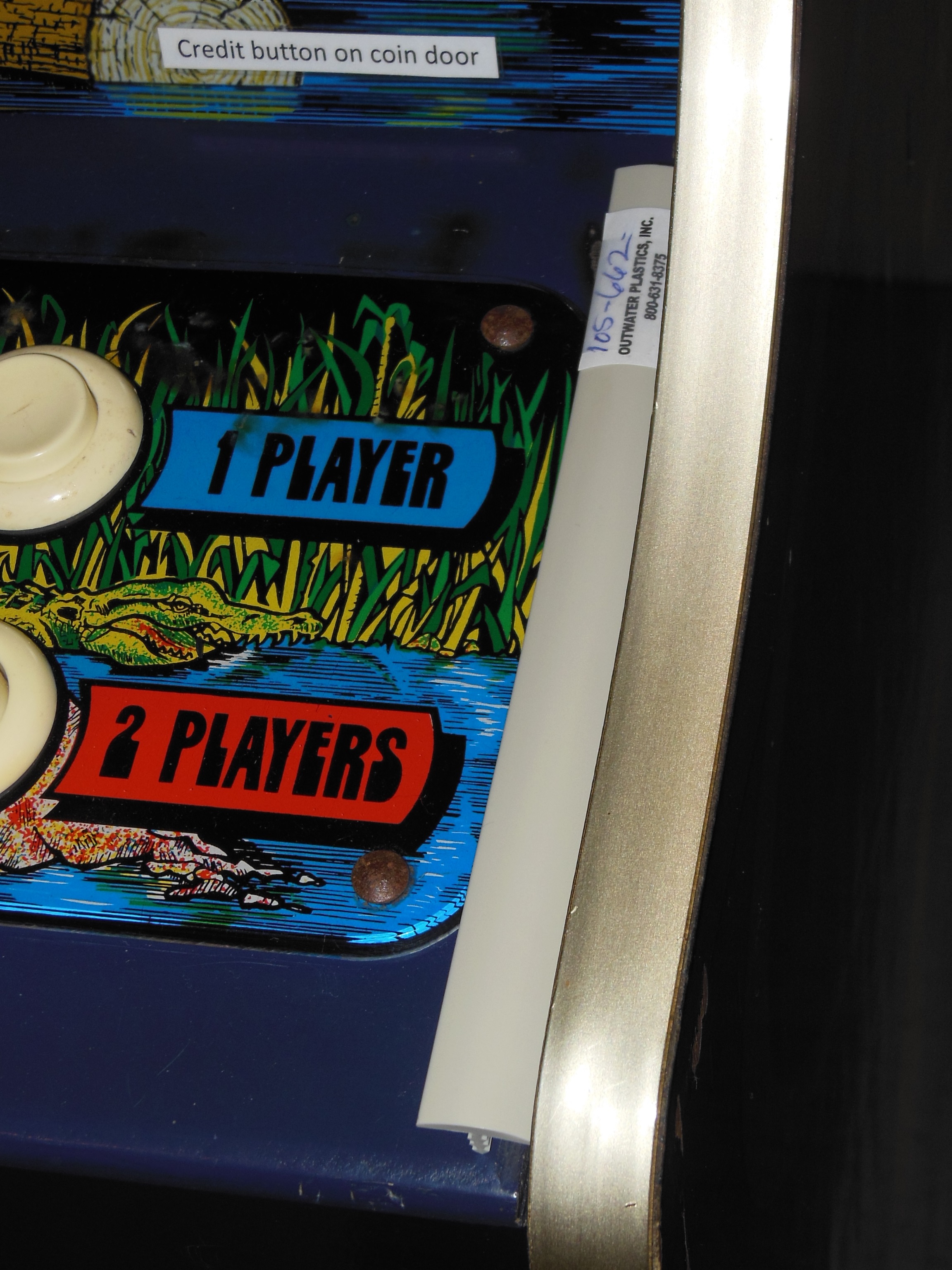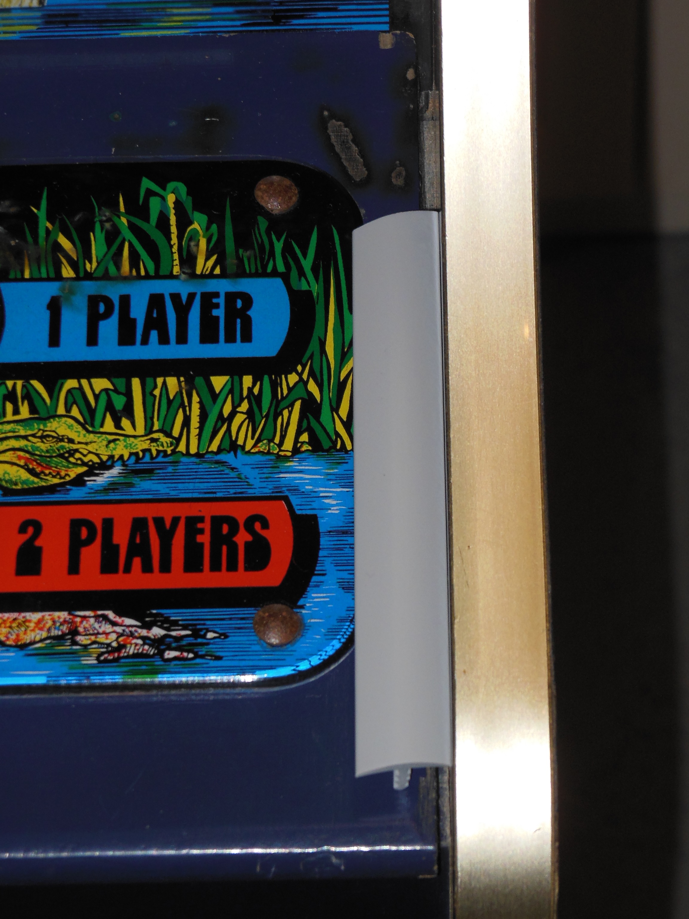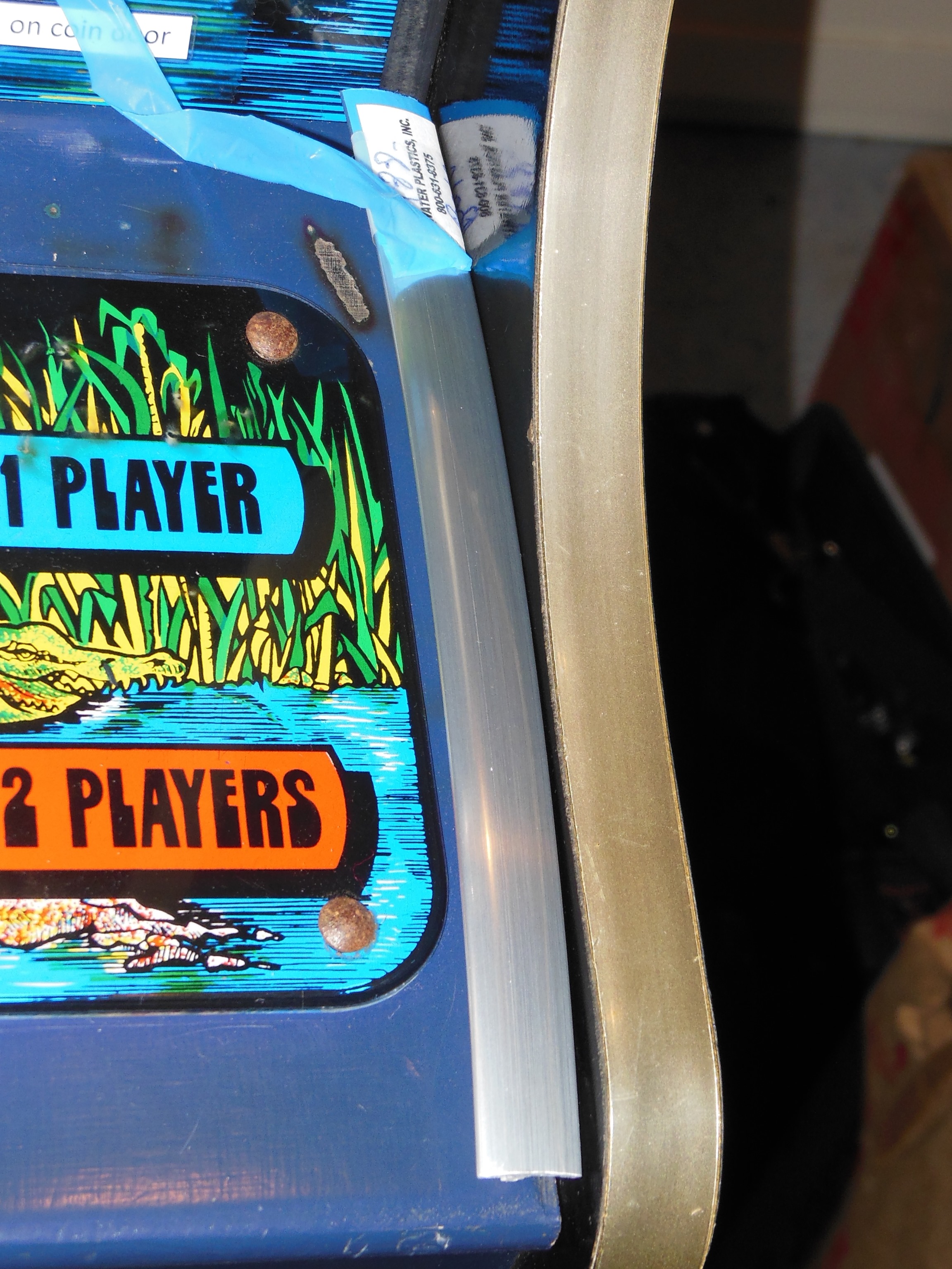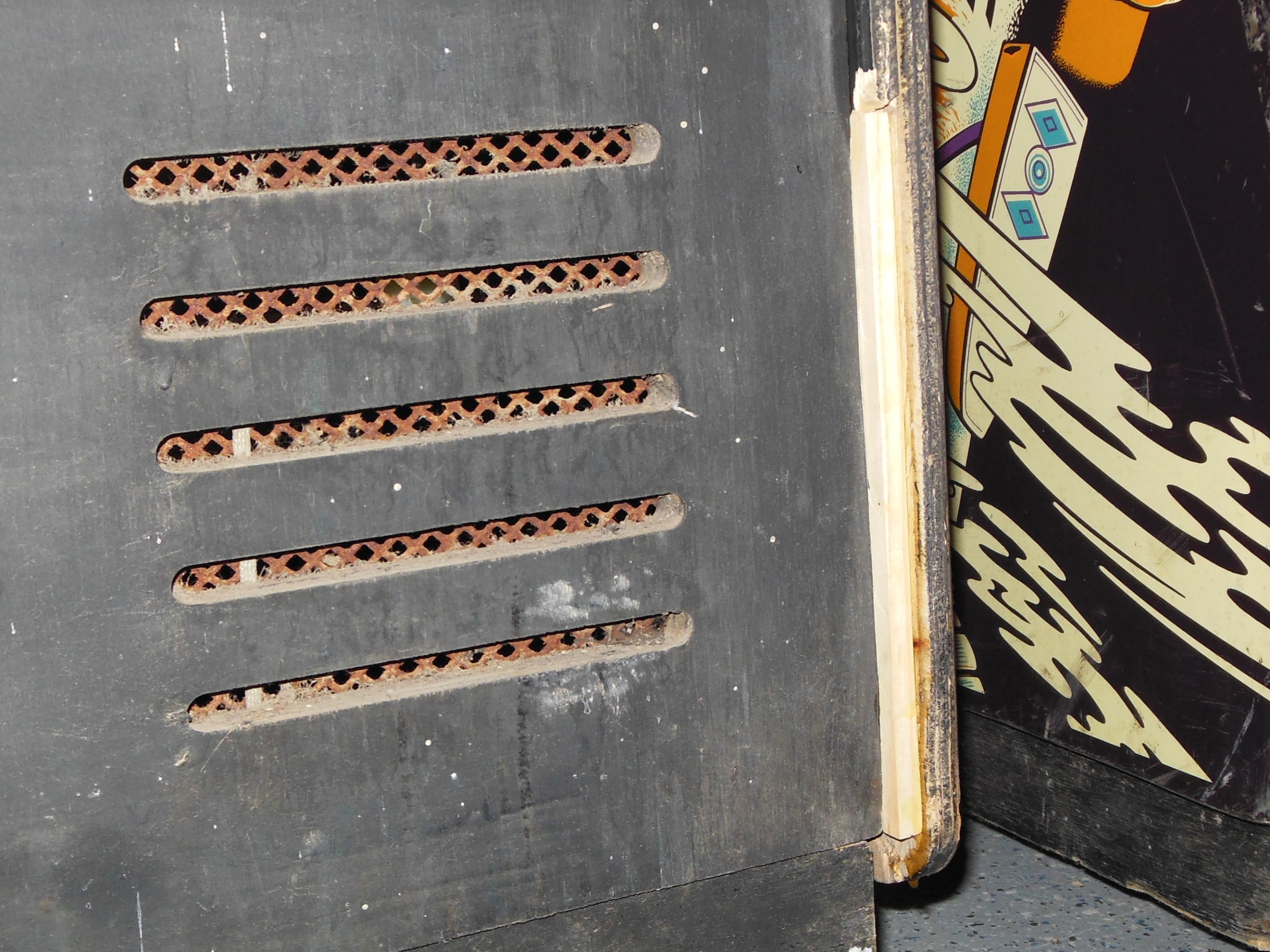 Laminate covered all the original artwork along with chrome dual bead T-molding. As was previously noted, some of the laminate was broken off towards the rear on the left side. Overall, the cabinet was in rough shape with long term moisture damage to both wood and the metal. The coin door had also been replaced with a different non-Zaccaria coin door.