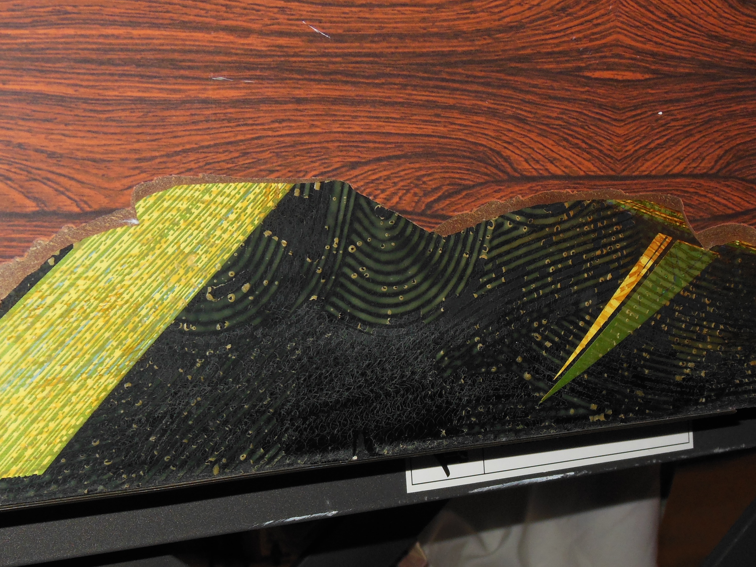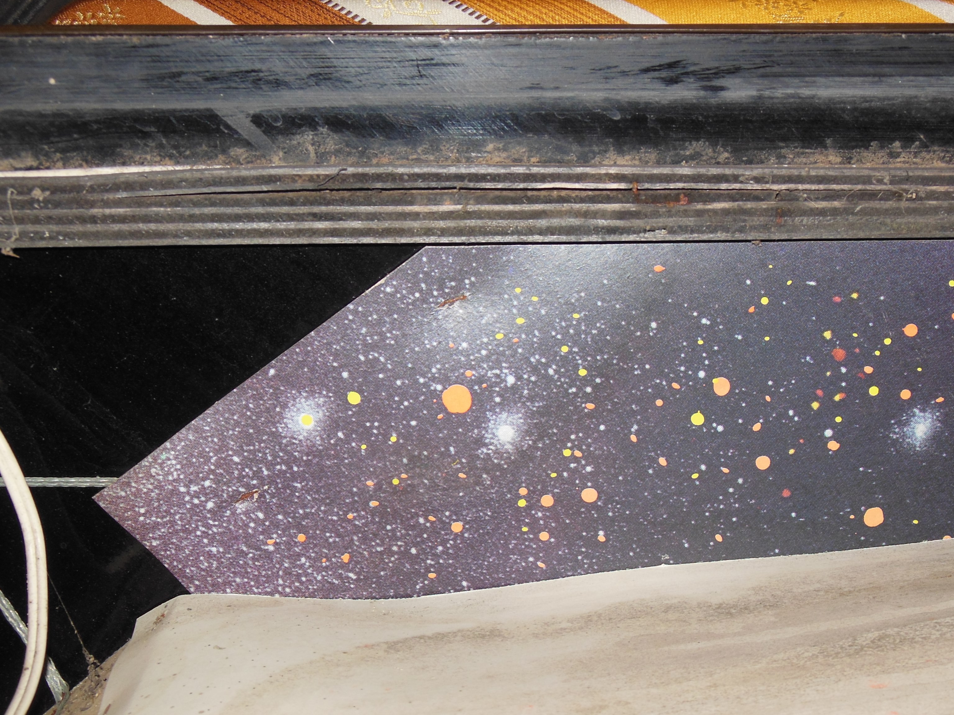 One example of a woodgrain version of the earlier Astro Wars style cabinet had previously been seen. Did Zaccaria make a woodgrain version of Quasar more fitting for pubs? The laminate on this cabinet appeared to have been very well installed and a complete cover. The clue to the answer was on the inside - there were a pair of lock bar holes now covered by the laminate that proved the laminate was after market and this example wasn't Zaccaria factory.