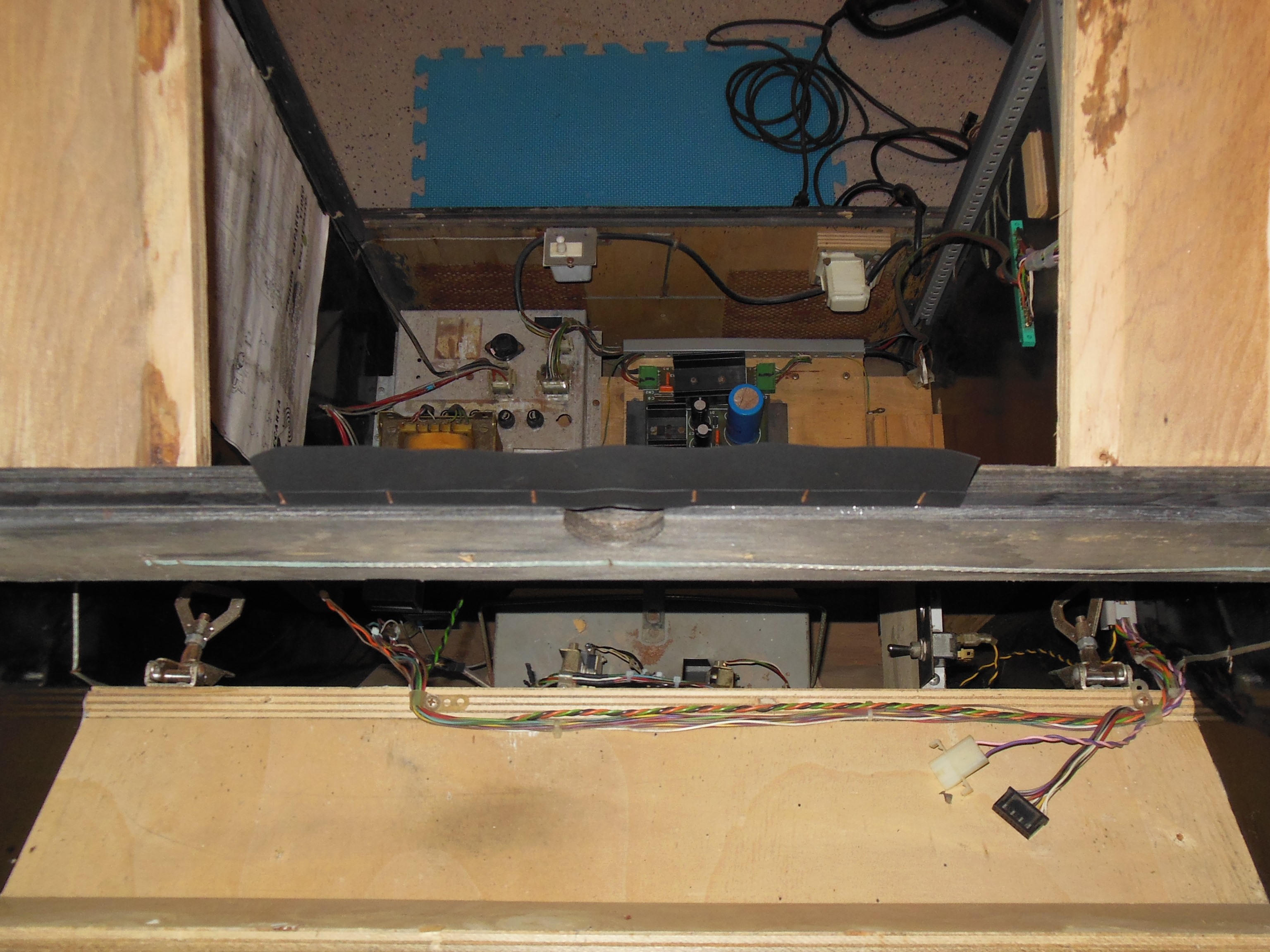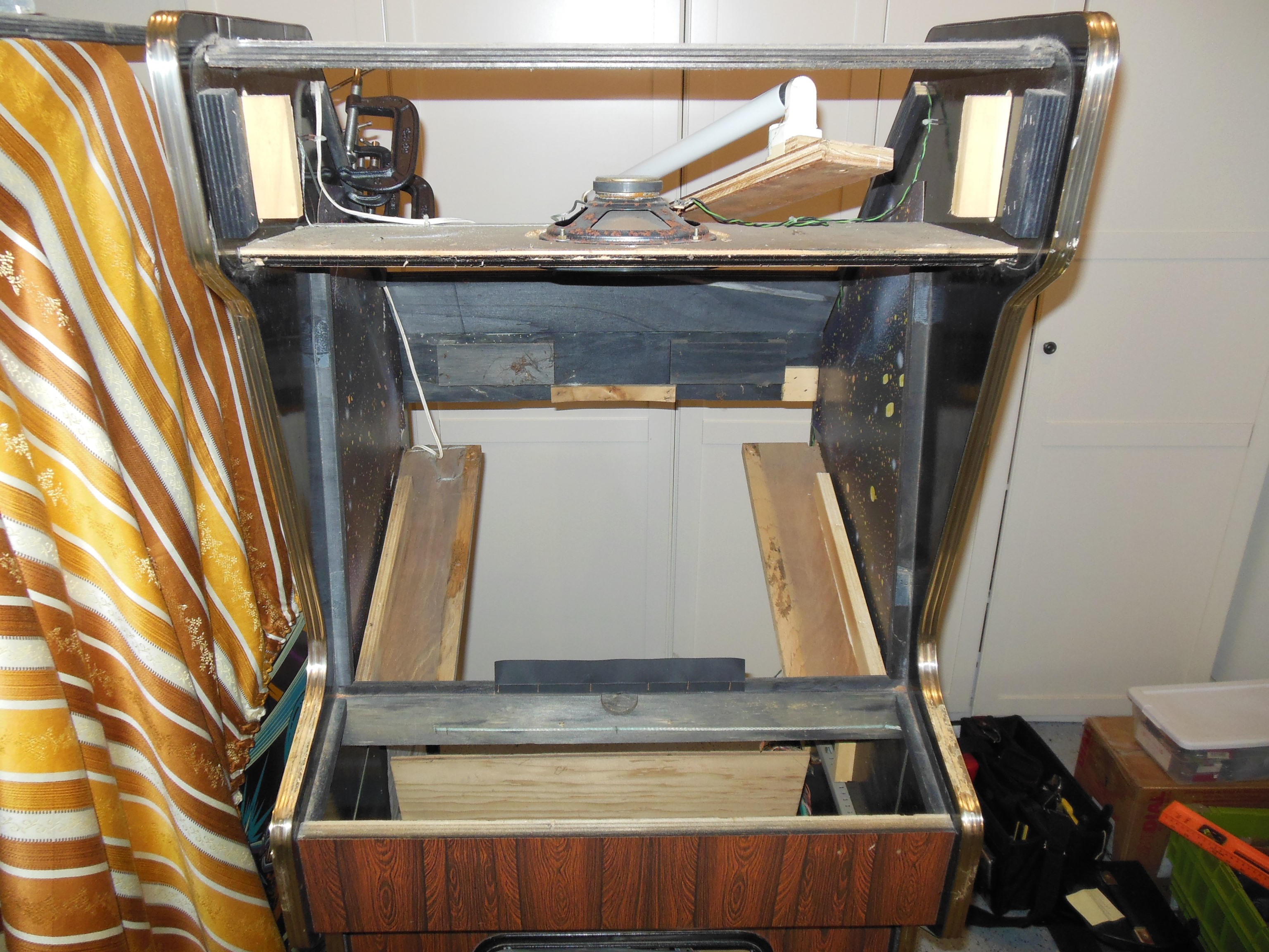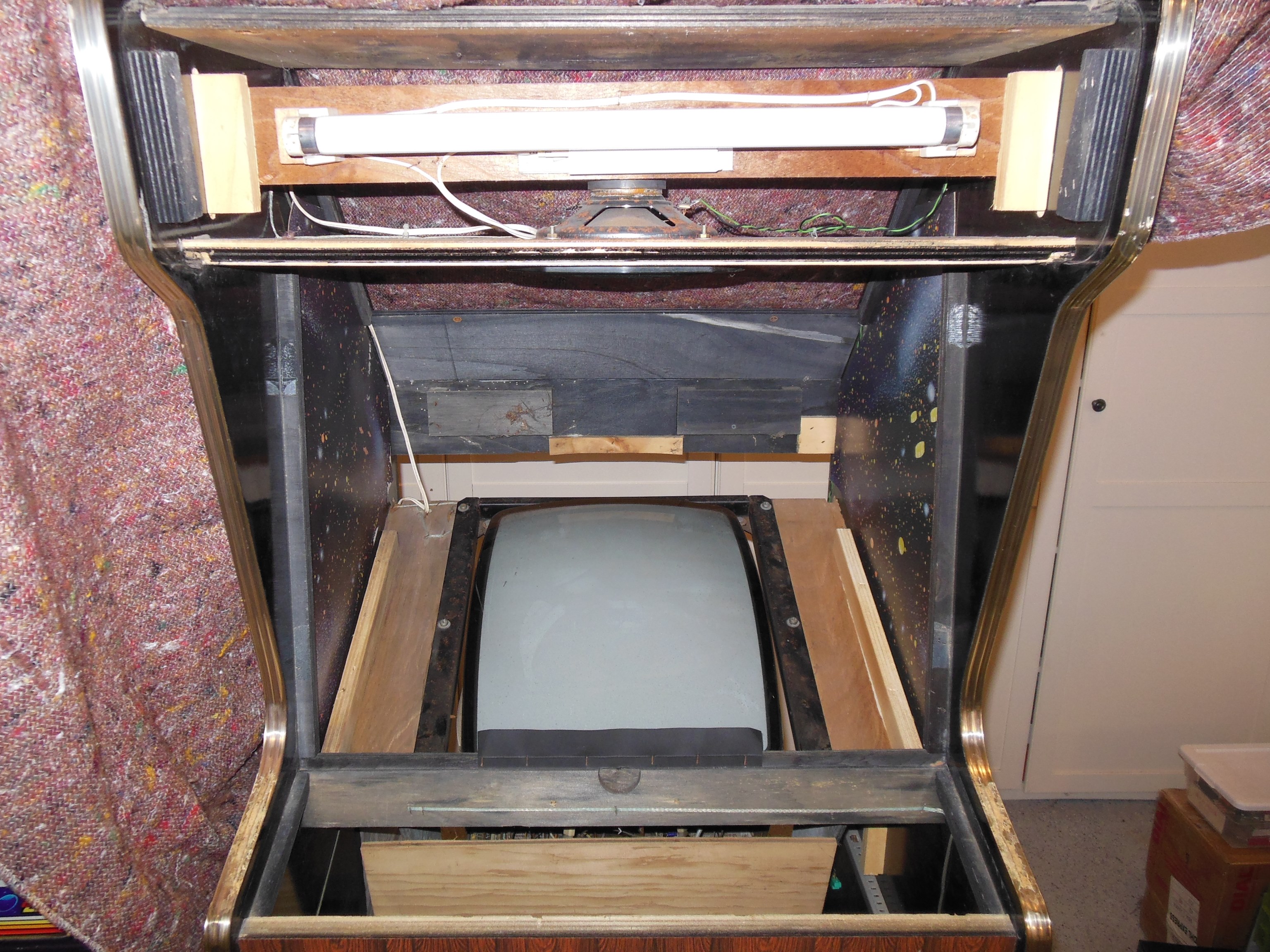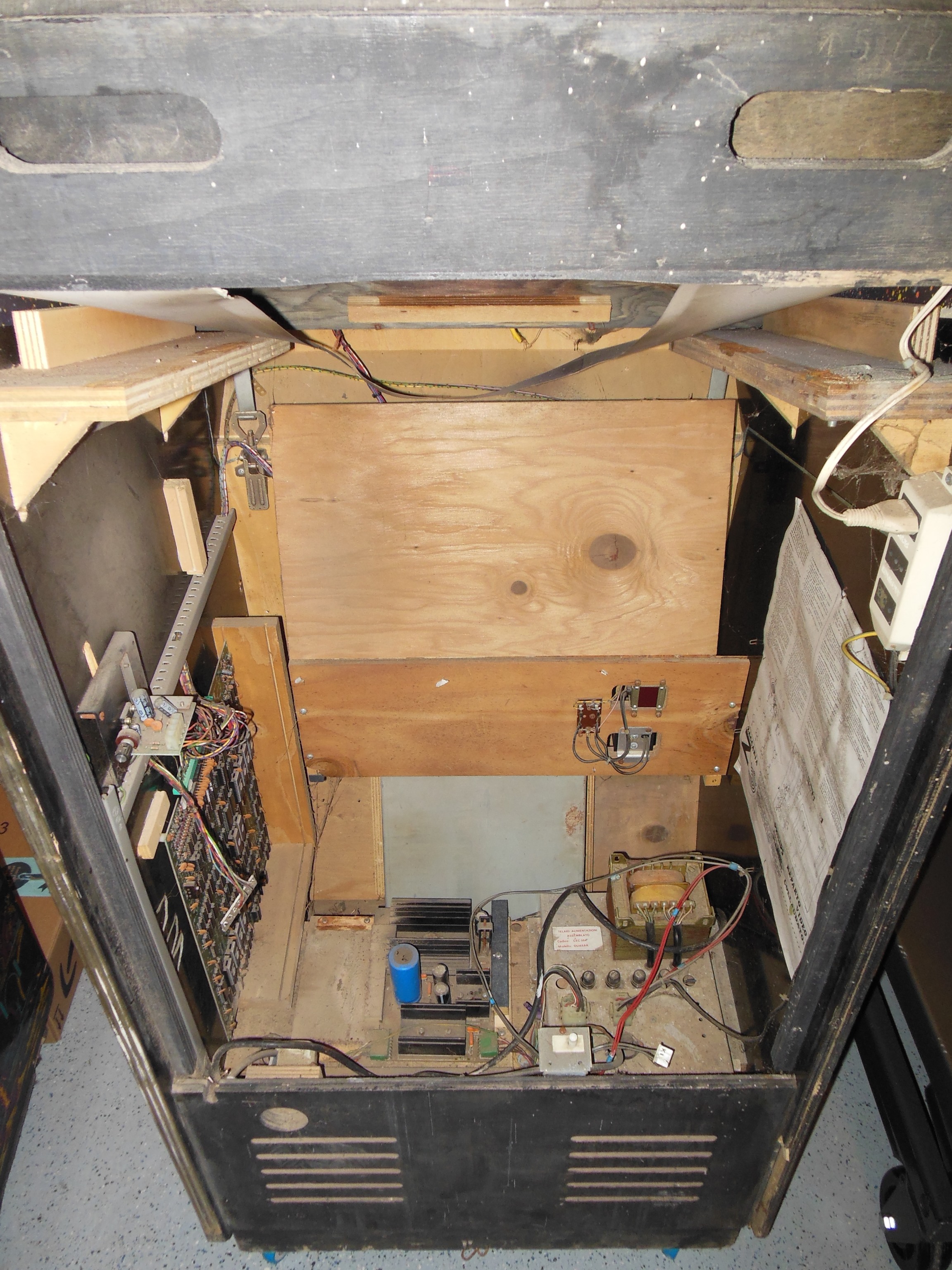 All the remaining wiring & power supply was removed from the woodgrain cabinet. The only cuts were for the coin counters and speaker.