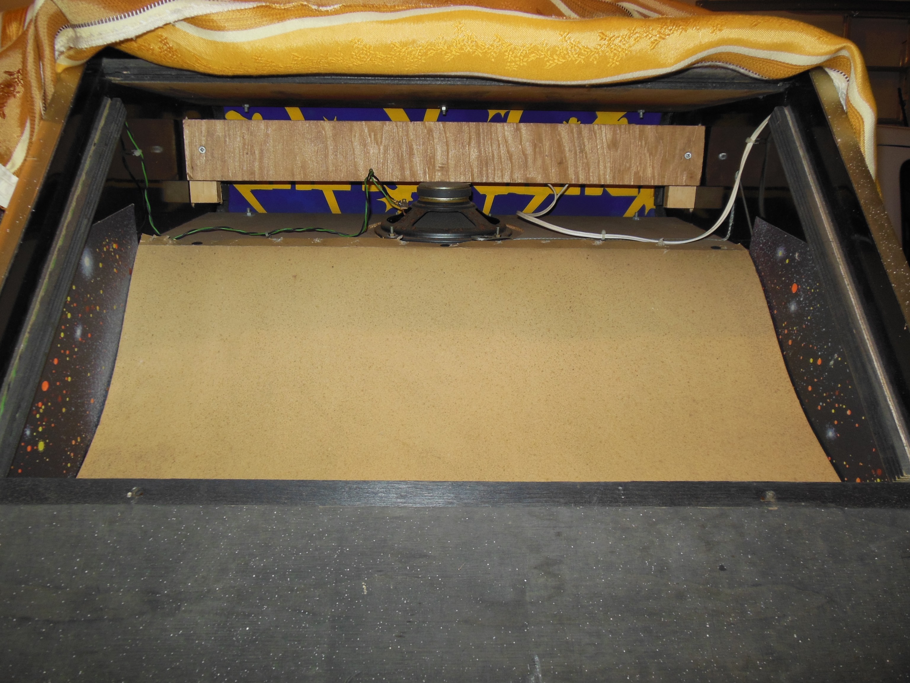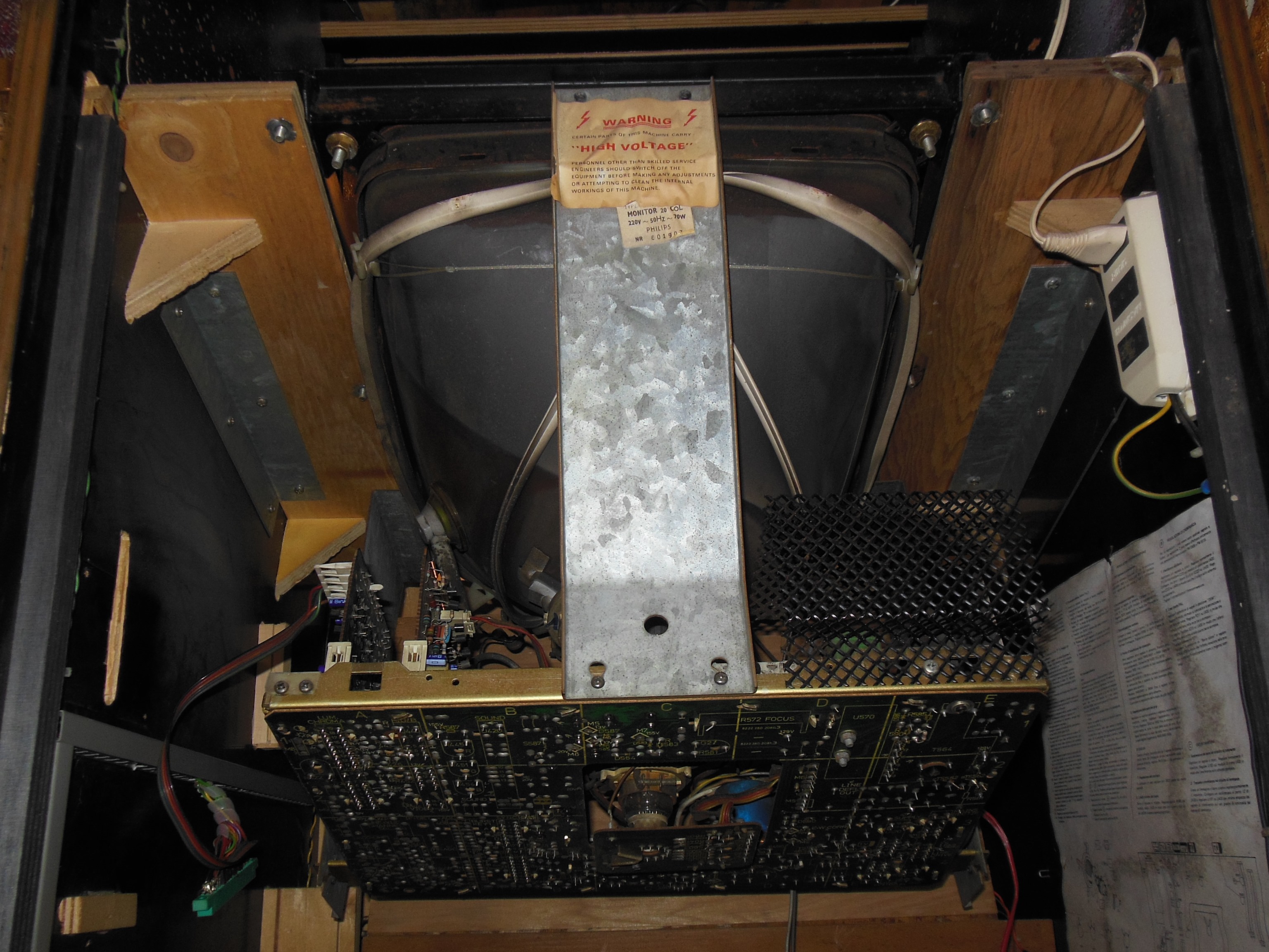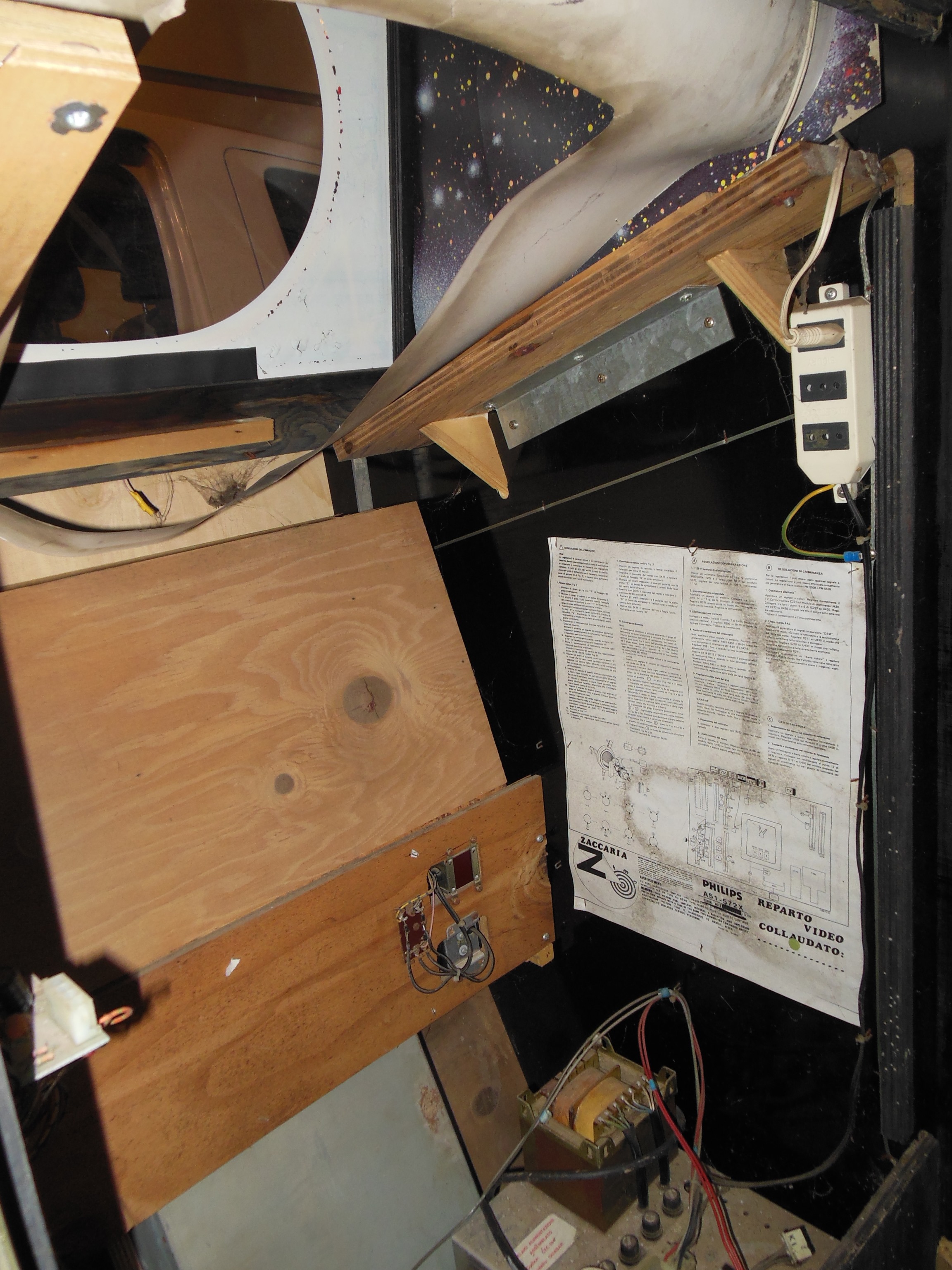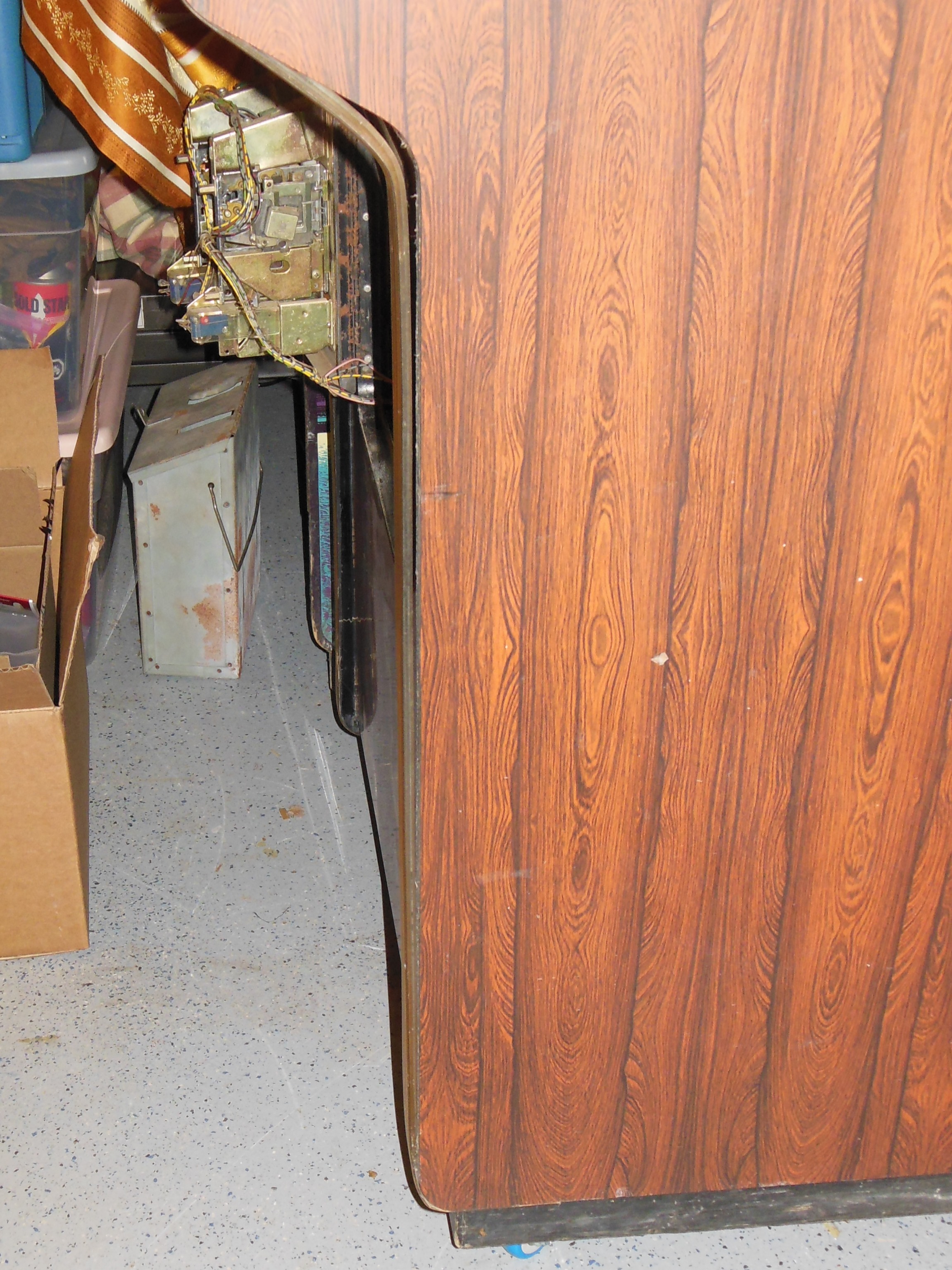 All the remaining wiring & power supply was removed from the woodgrain cabinet. The only cuts were for the coin counters and speaker.