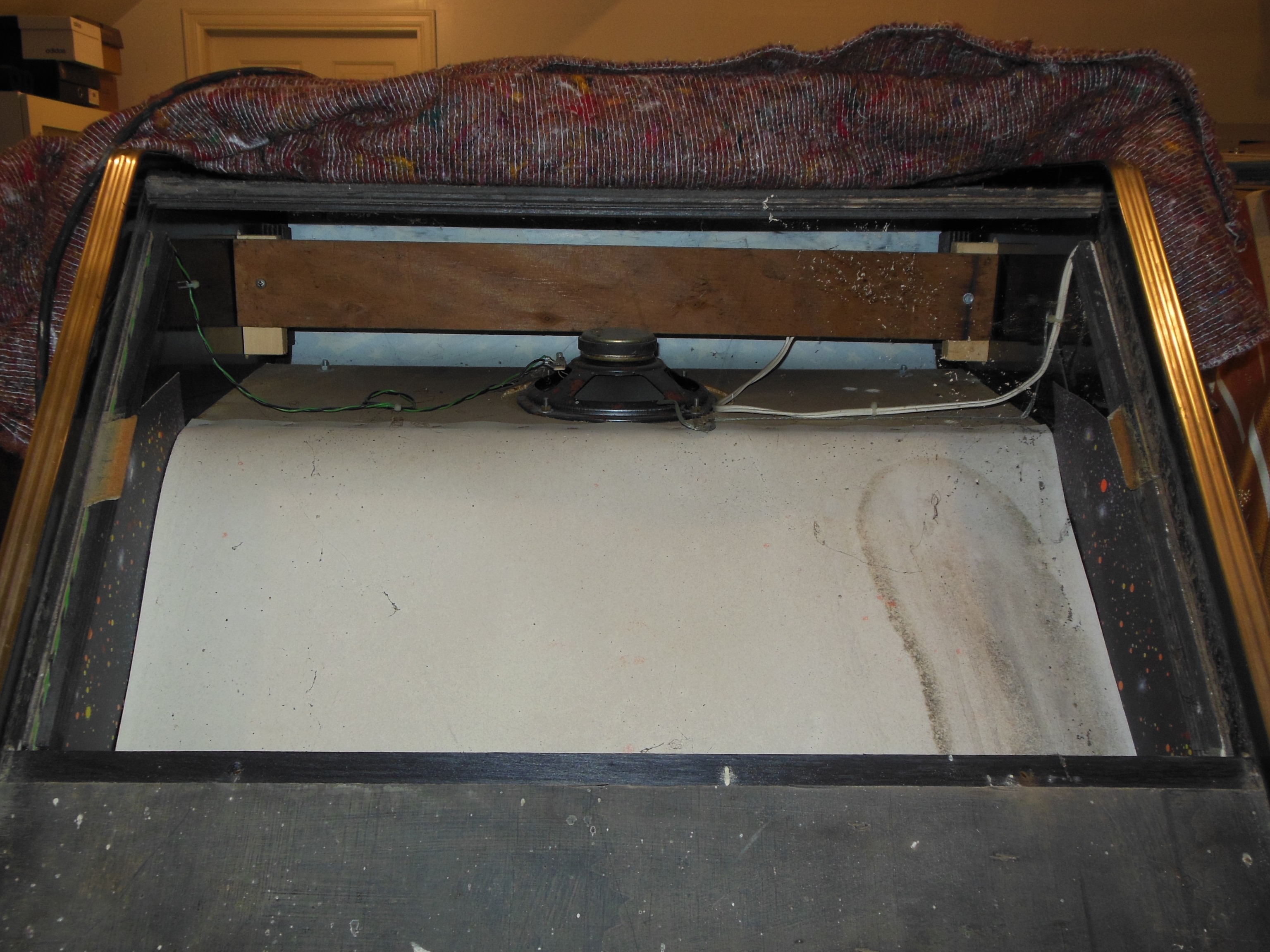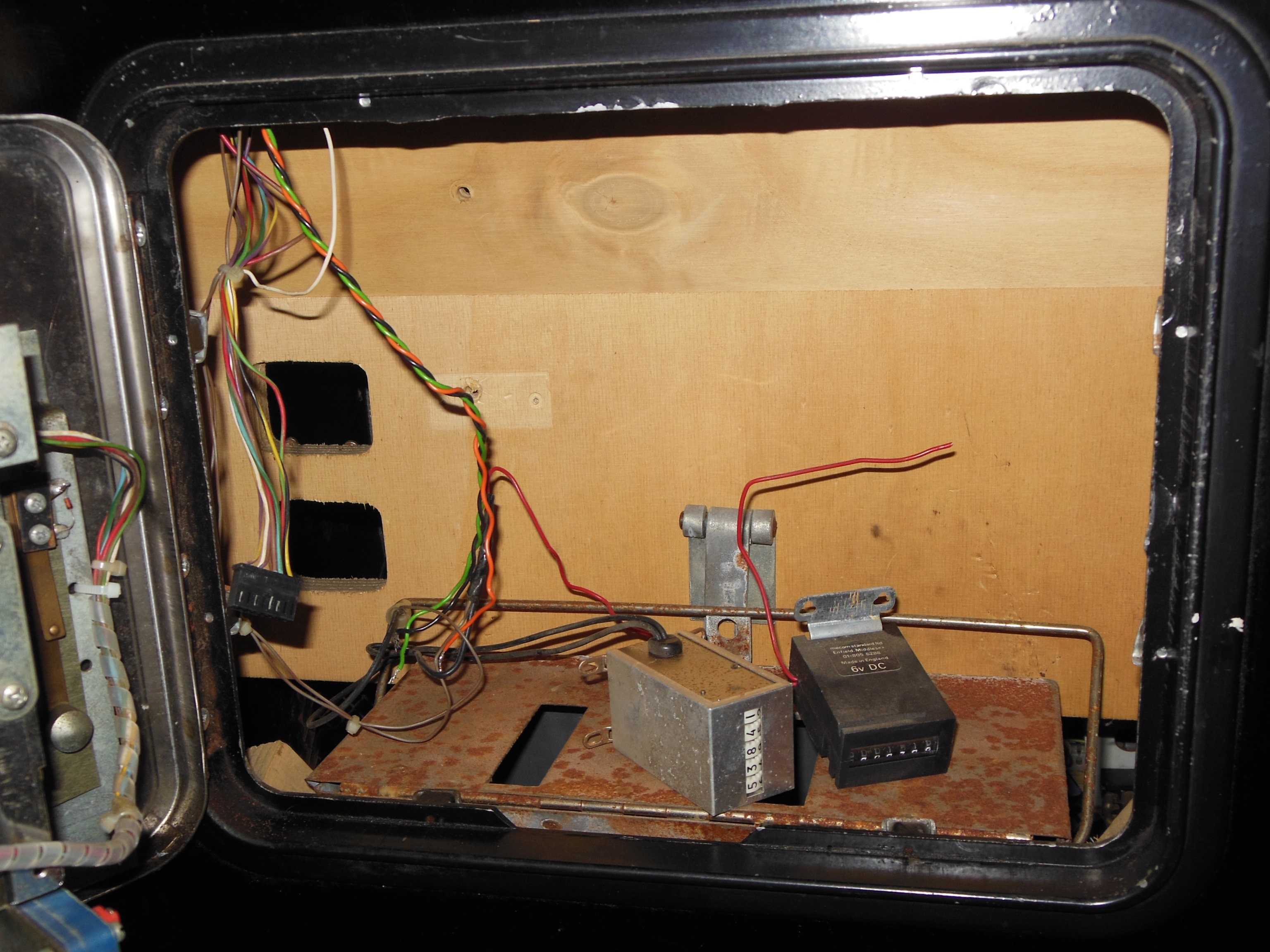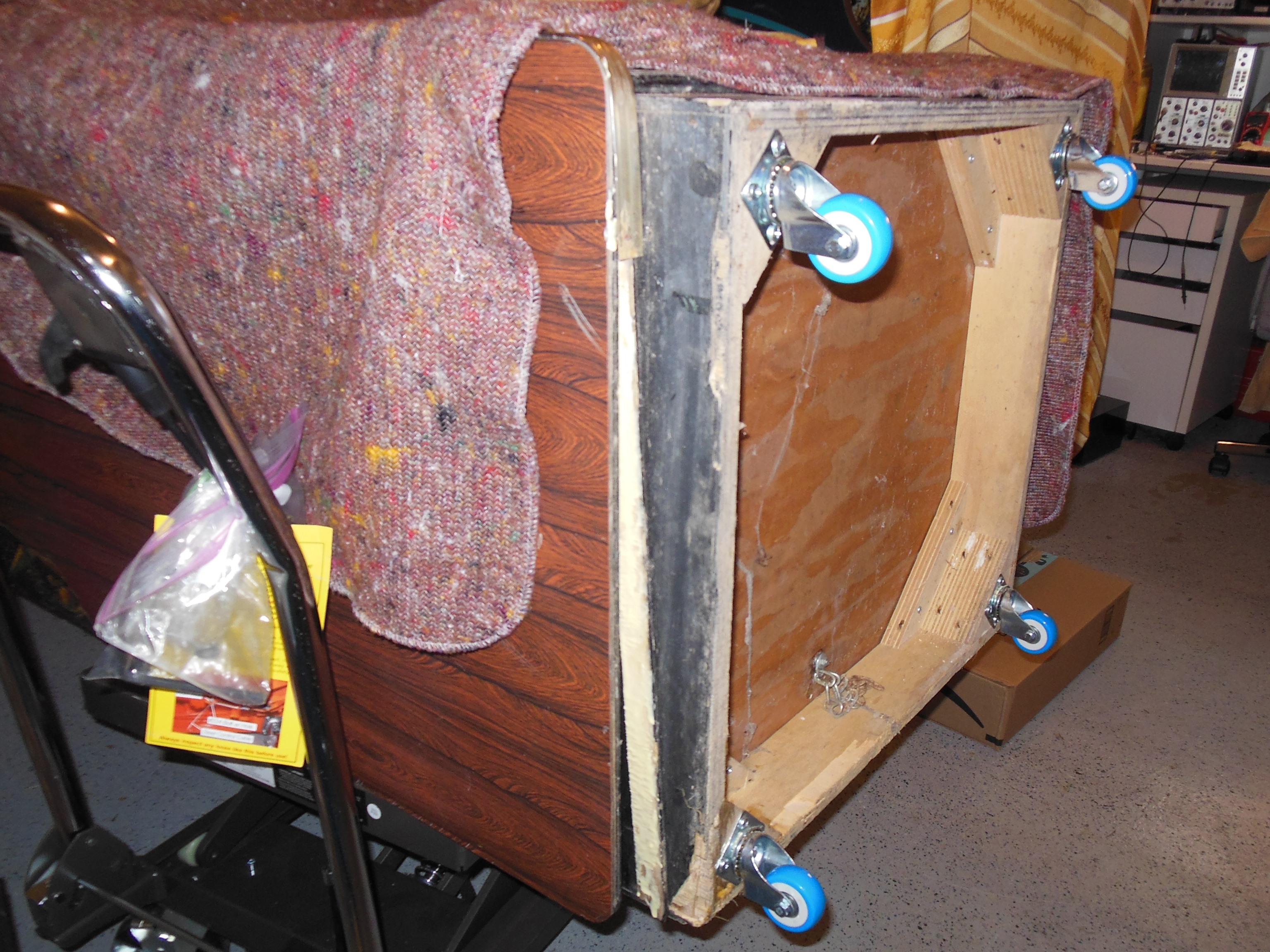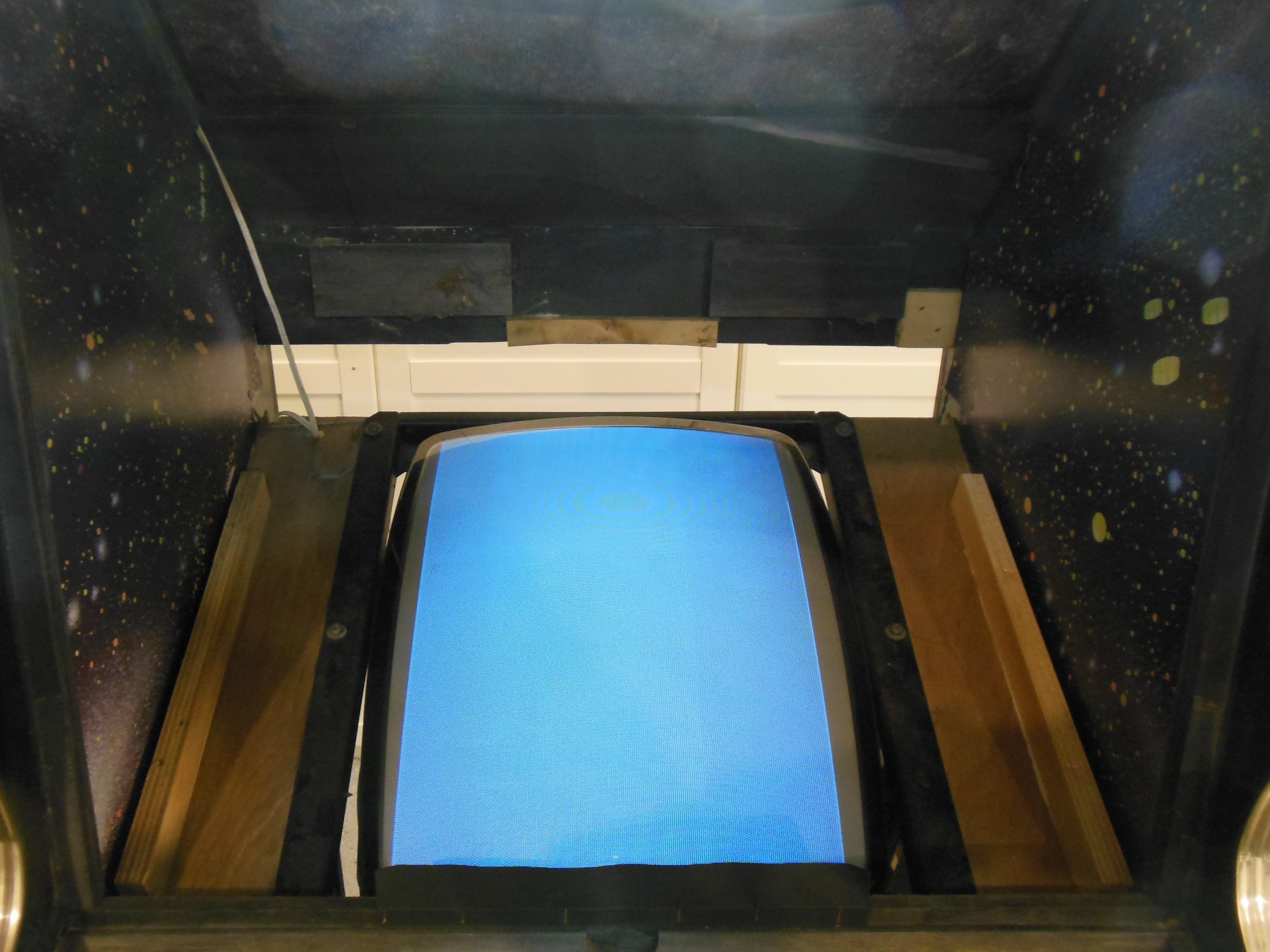 All the remaining wiring & power supply was removed from the woodgrain cabinet. The only cuts were for the coin counters and speaker.