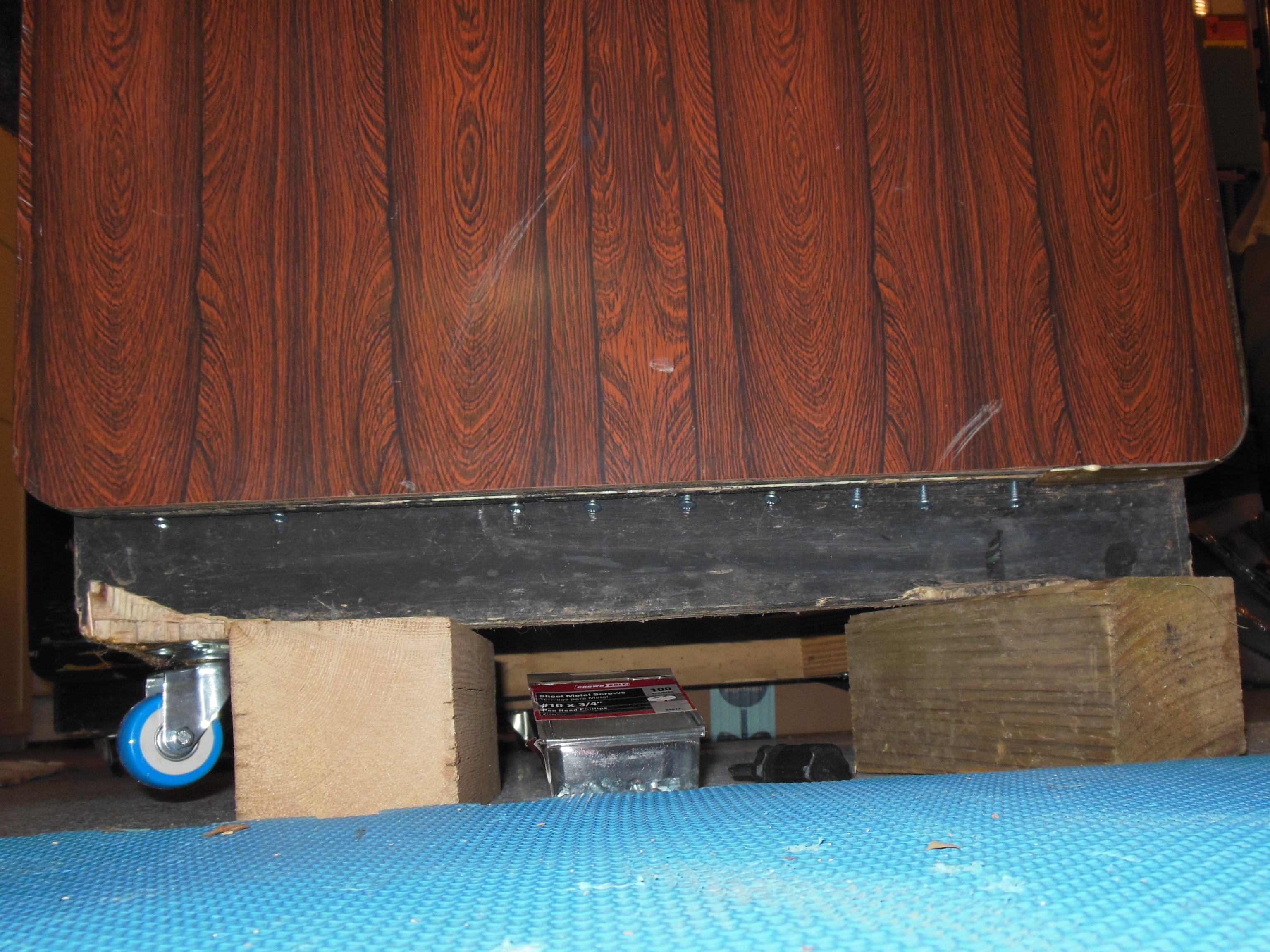 The cabinet base was very loose where the side wall had split through the T-molding groove that needed to be repaired. There was also a section of laminate missing towards the back of the cabinet that would be left as is.