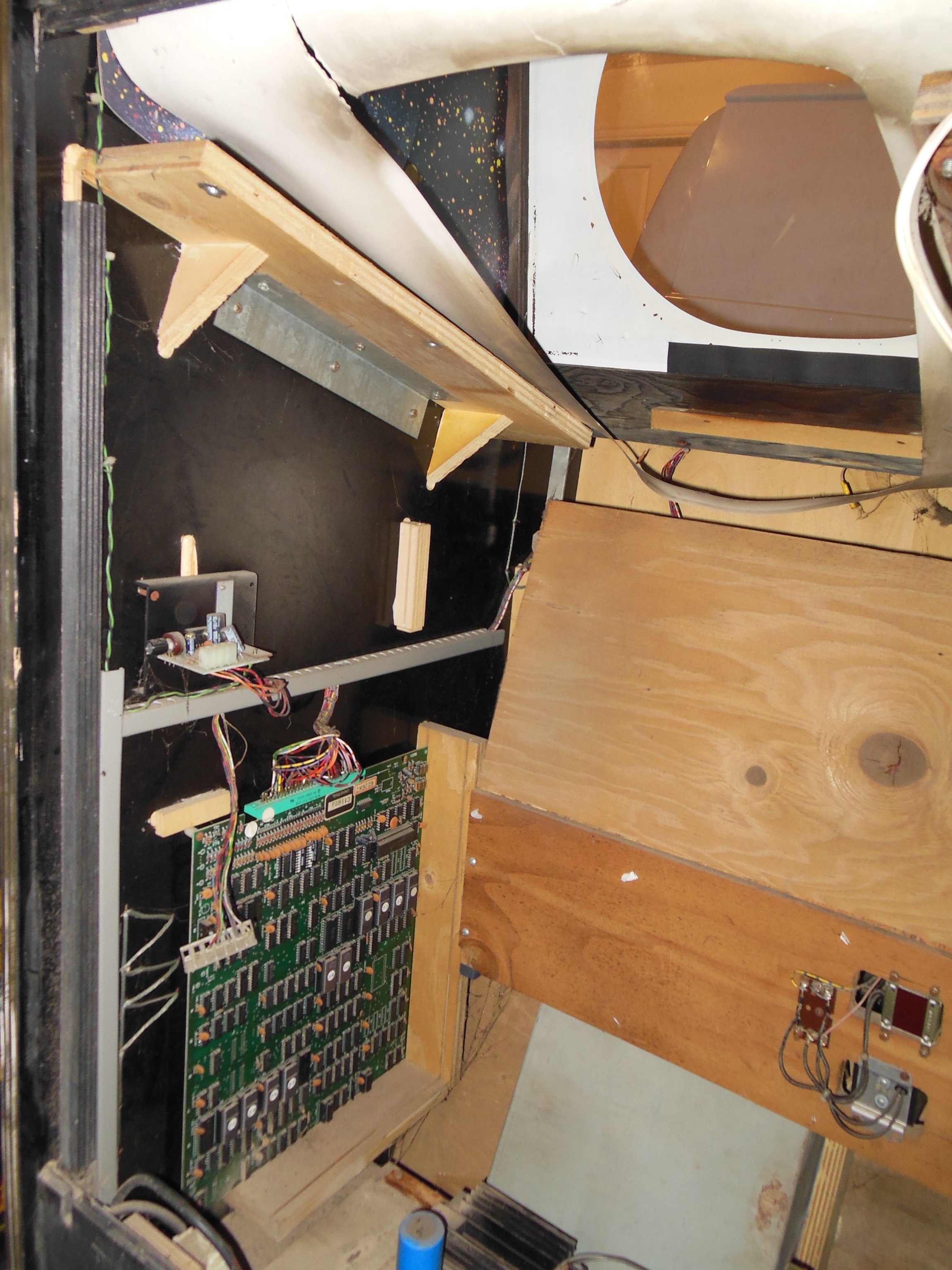 The source cabinet had the game PCB screwed directly into the side wall making it difficult to remove. In the destination cabinet the plan was to use a mounting plate to match the rest of the Zaccaria cabinets. Staging the PCB on the plate in the cabinet revealed that a large axial capacitor caught on the side of the monitor frame, and it was remounted to the underside of the PCB.