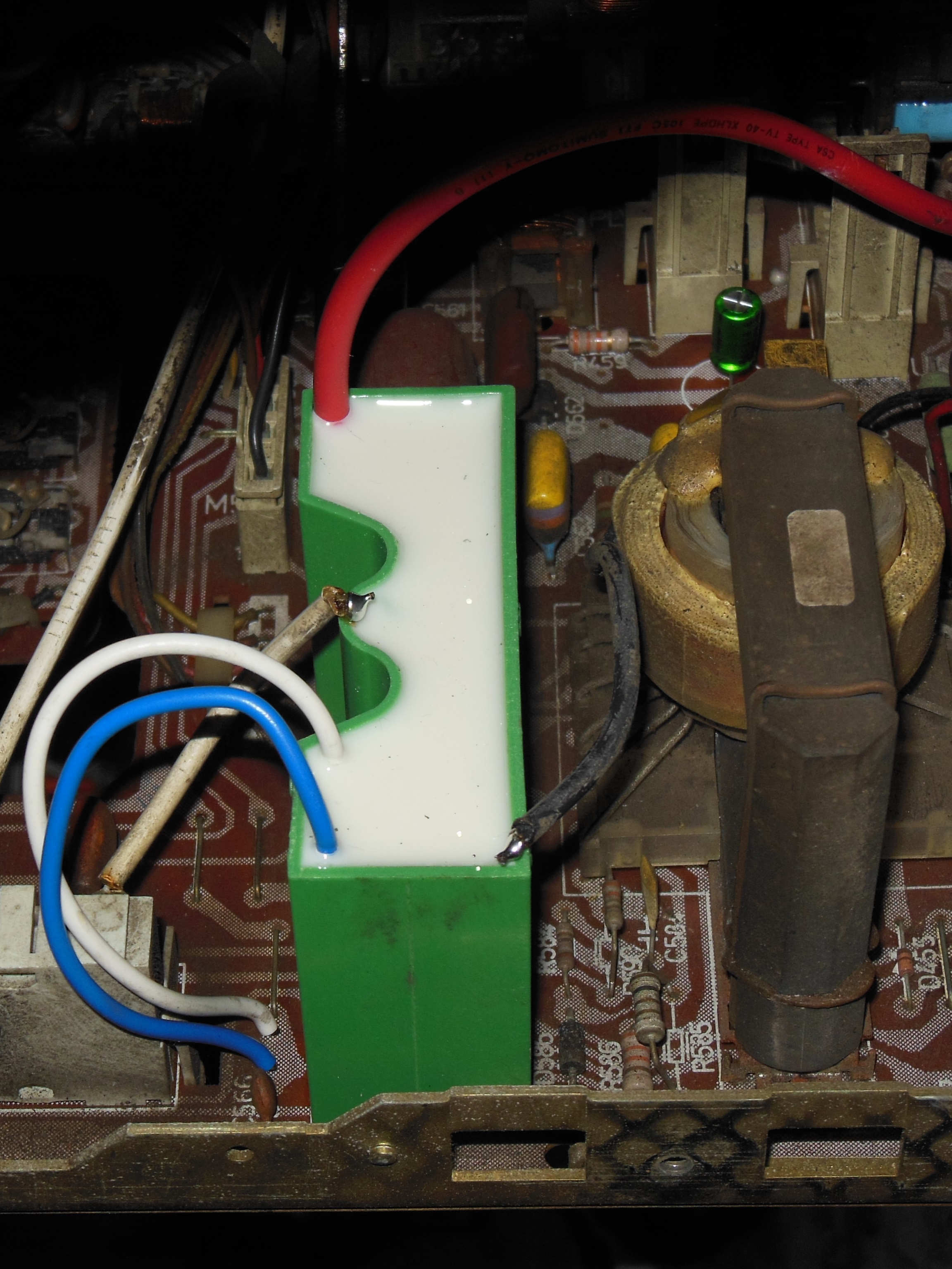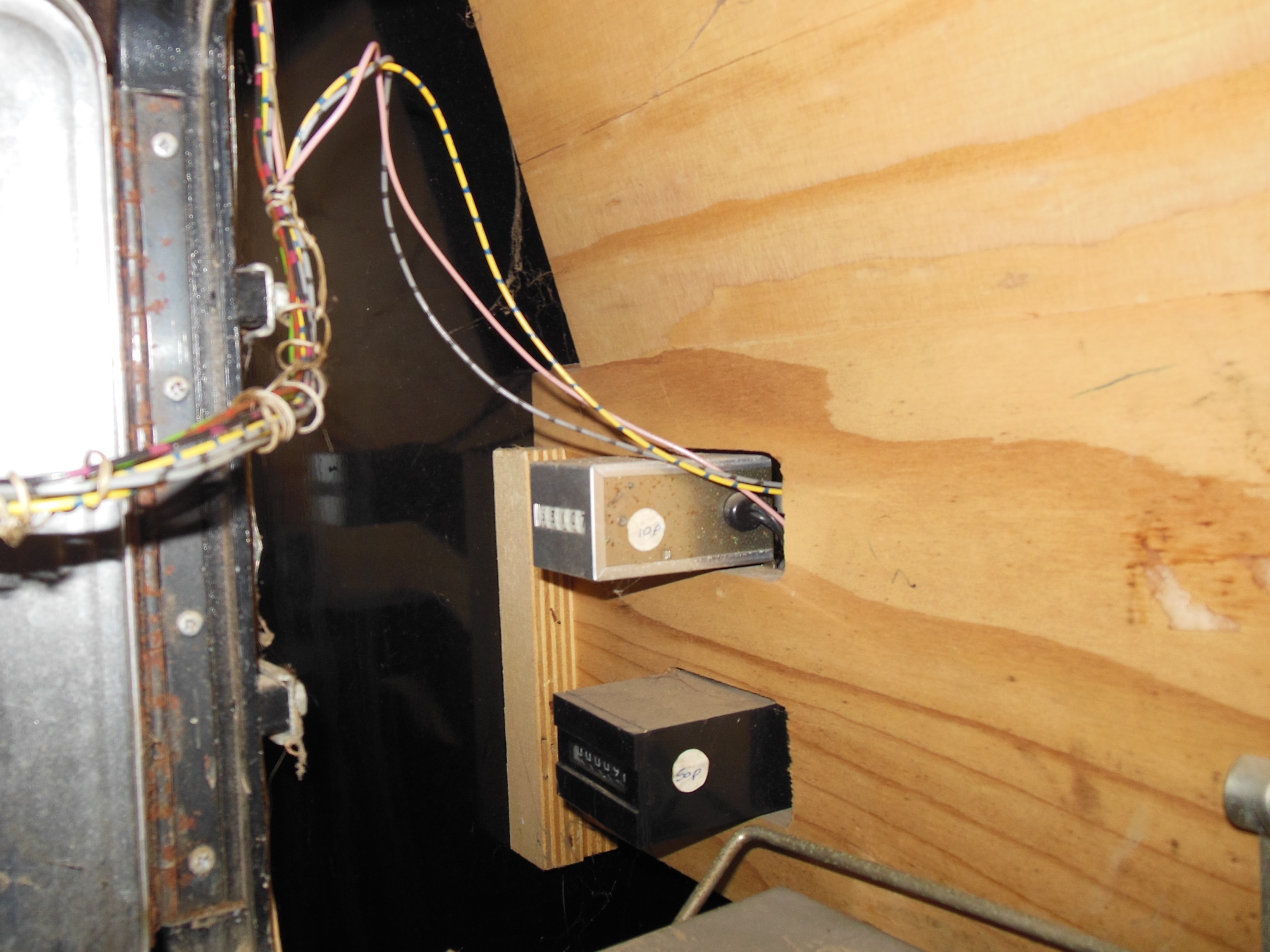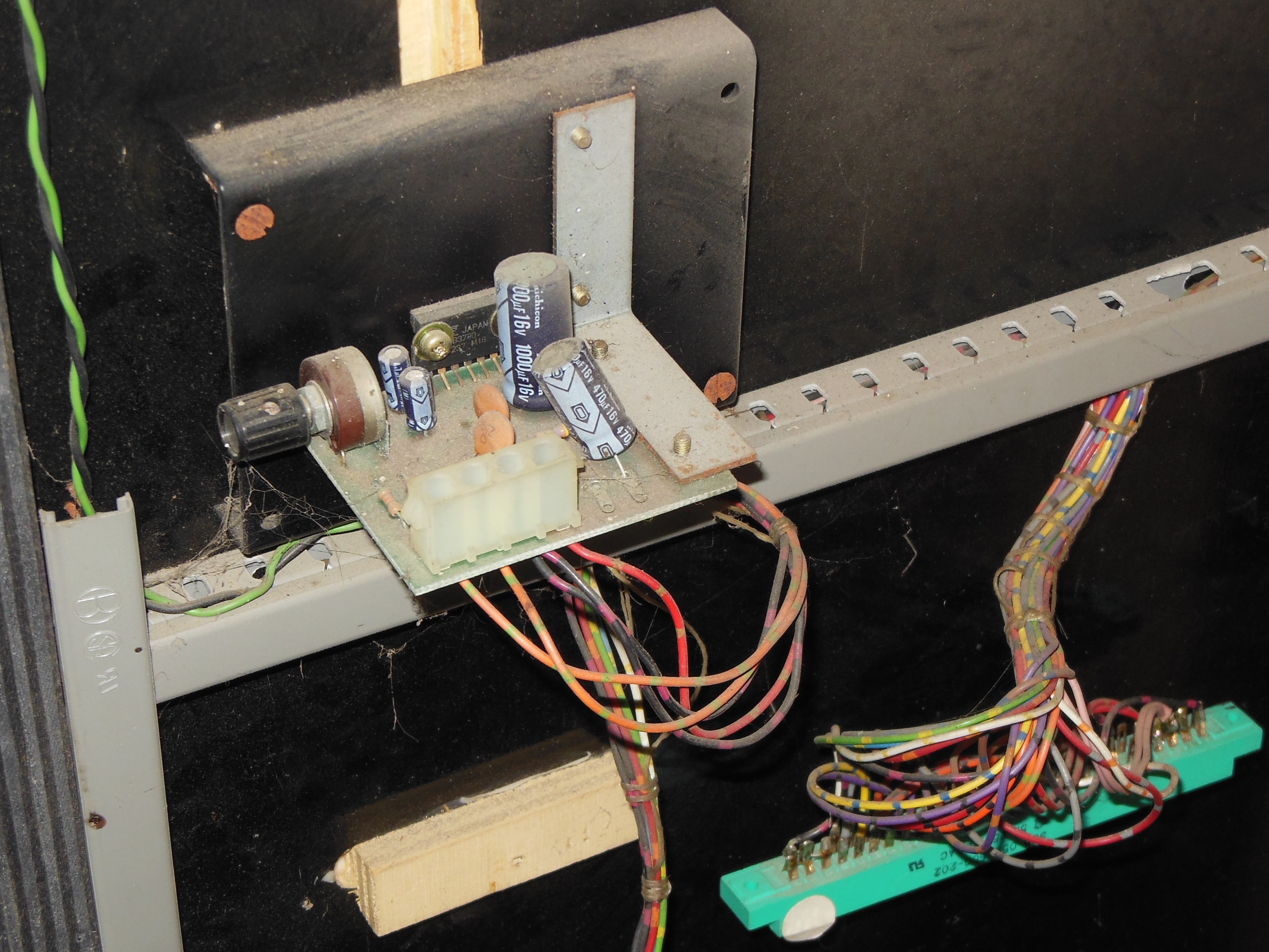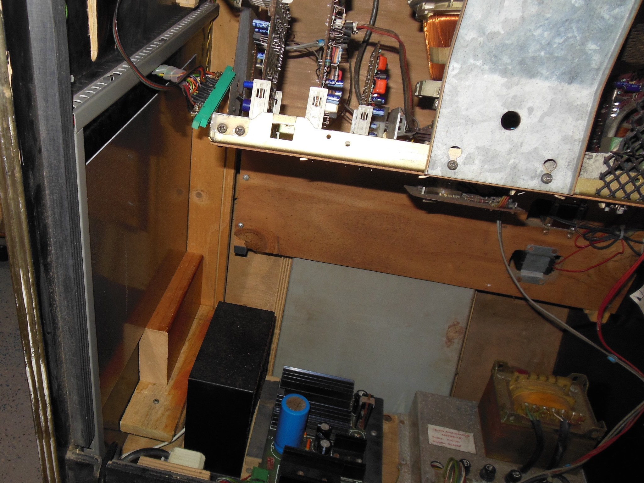 The power transformer & regulation PCB were moved over. Since the Quasar had the coin counter wiring threaded around the woodwork the coin counters had to be disconnected to move them over to the woodgrain cabinet.