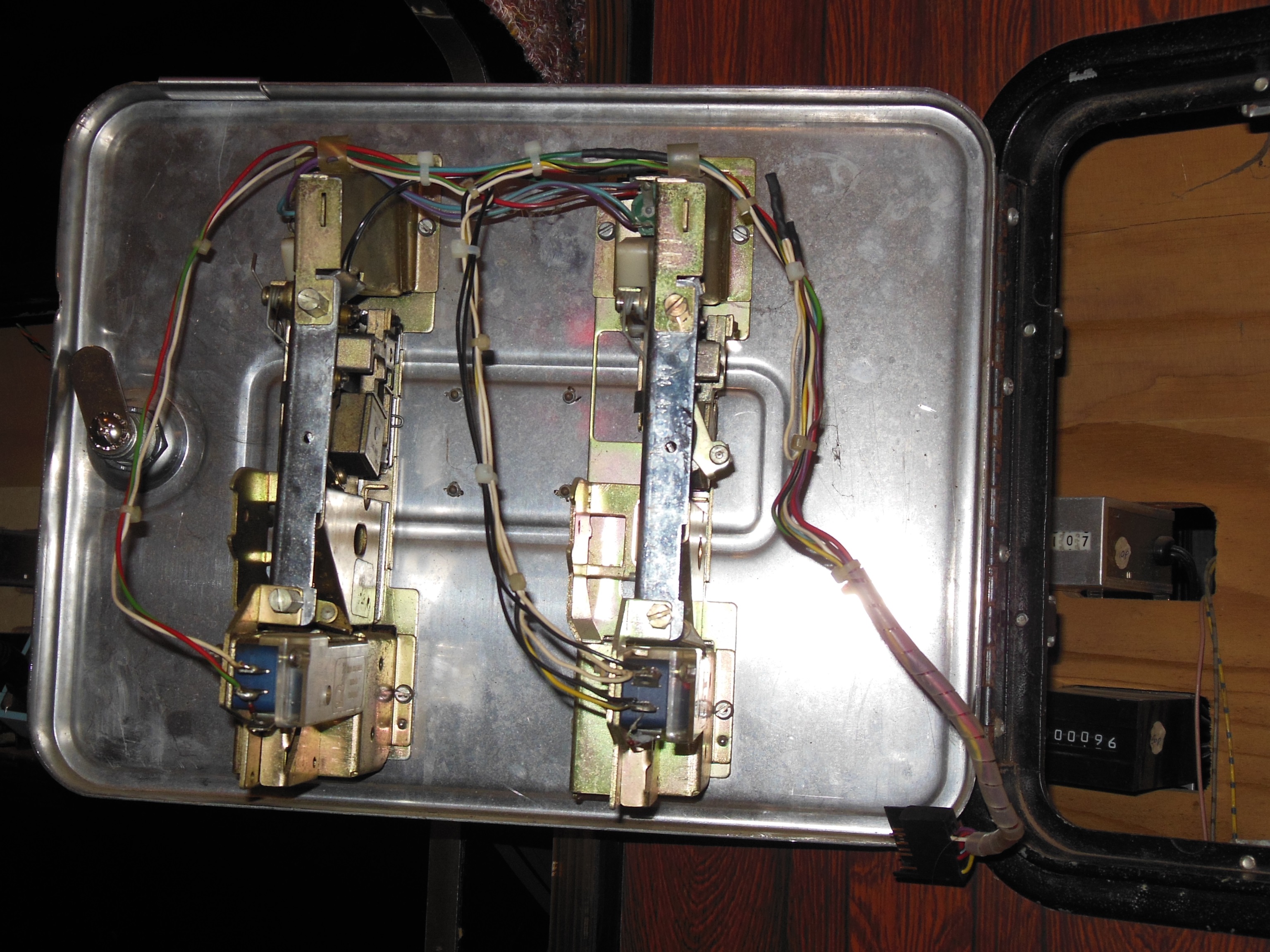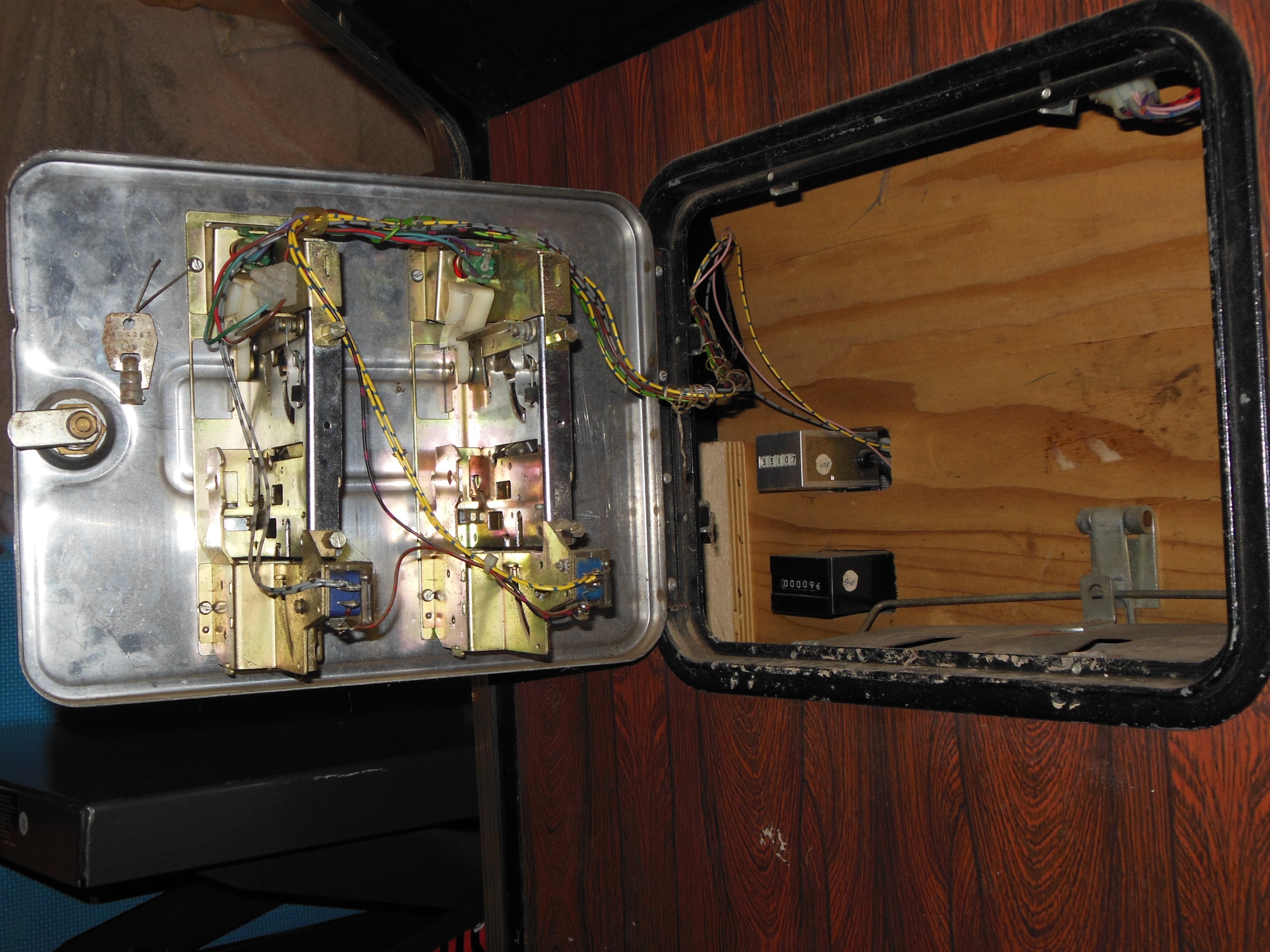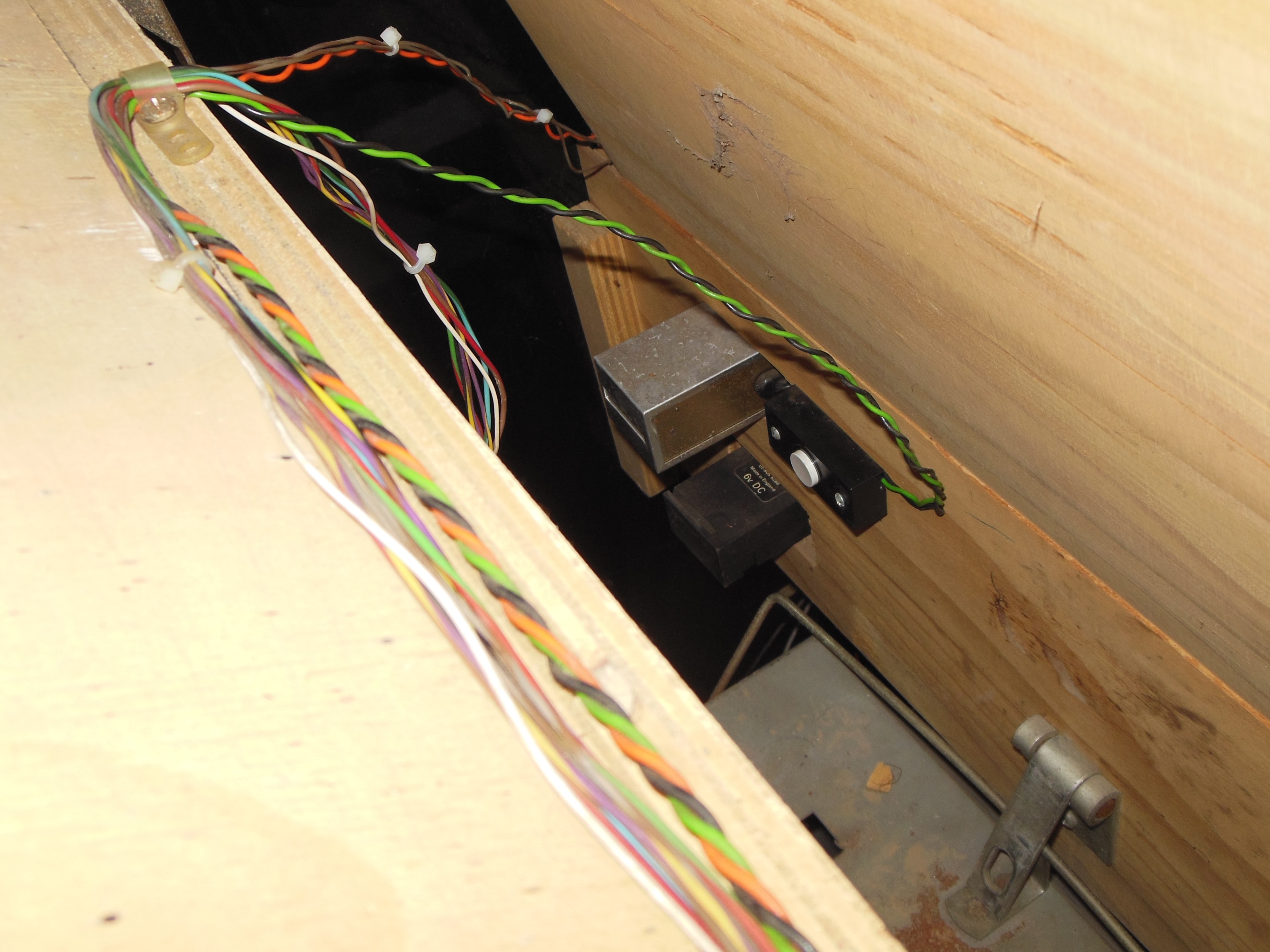 All the signal-side wiring loom was transferred over with two small changes. The doorbell was wired in from the surface to avoid drilling a wiring hole through the cabinet and the test mode toggle switch moved from next to the game PCB to on the right of the coin door for easier access. The coin counters were also reinstalled and wired in.