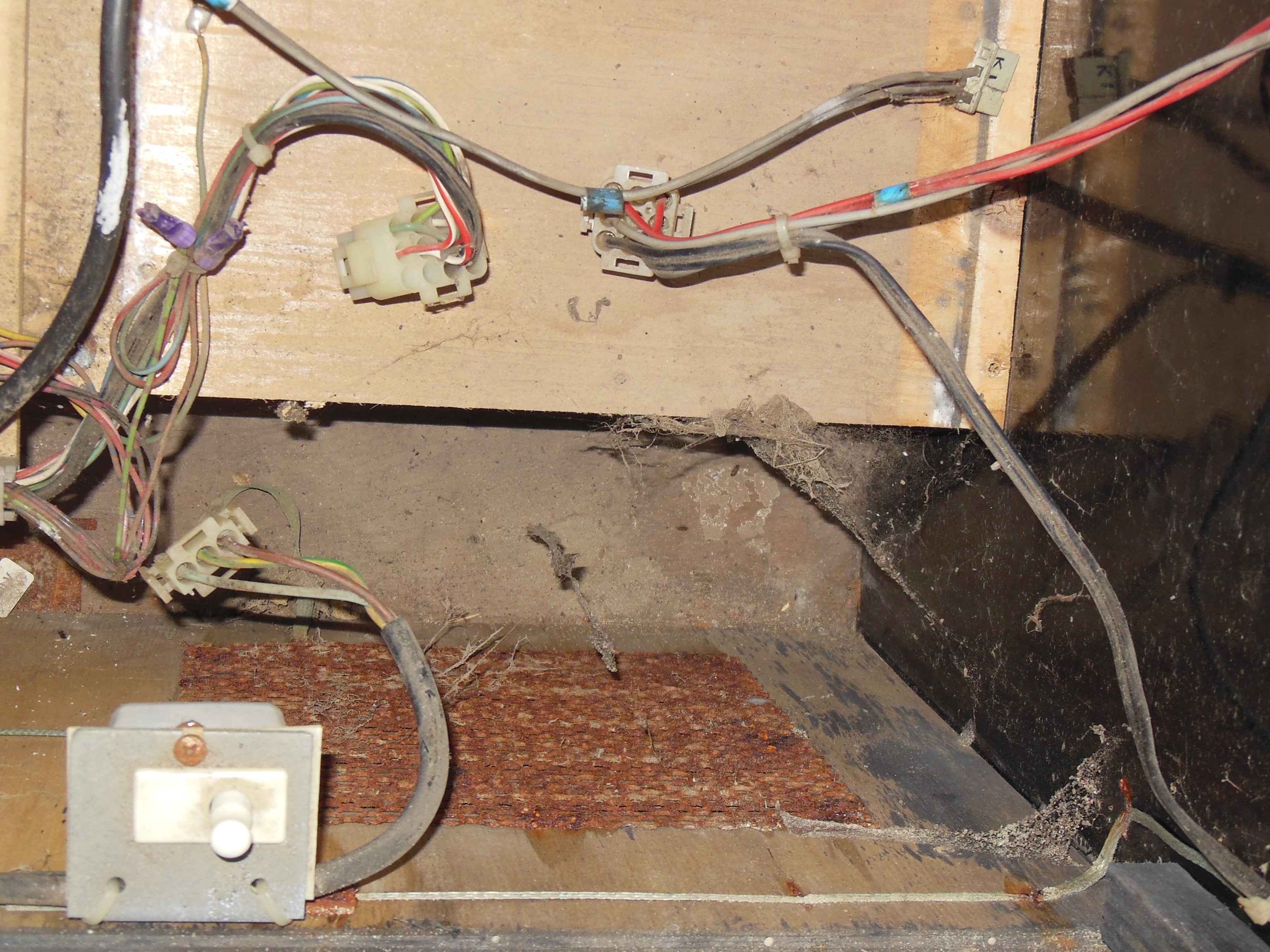 The coin counters were still present, and a generic coin door was fitted that were all connected by the replacement wiring loom. Similarly, the control panel had been completely re-wired and drilled out to accept a joystick, the original Quasar holes covered by the Mr. Do! control panel overlay.