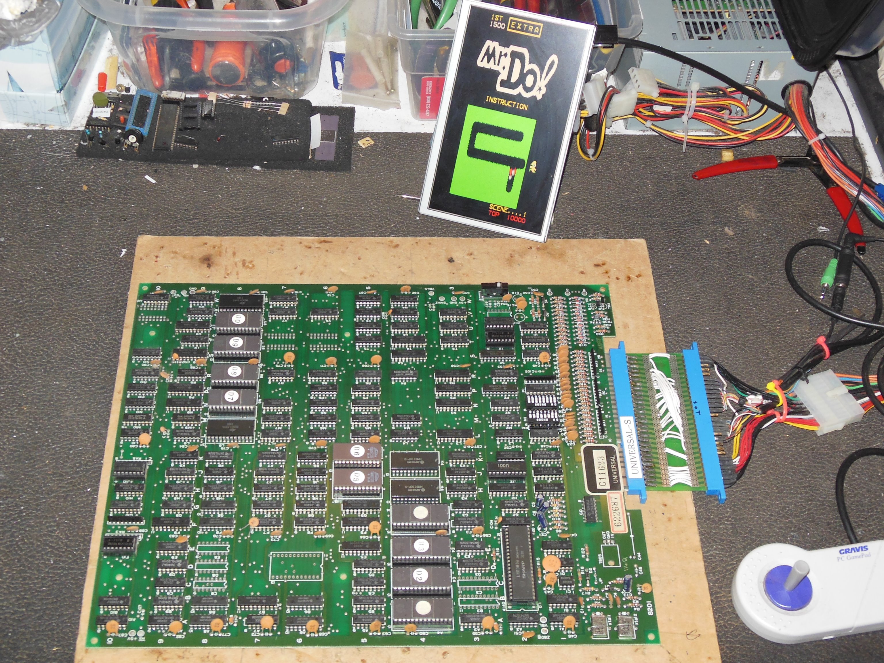 Both the Mr. Do! game PCB and its external audio amplifier were removed from the cabinet. Testing on the bench found the game PCB working without issue and it could be reused as spare game PCB for the Associated Leisure Mr. Do! cabinet.