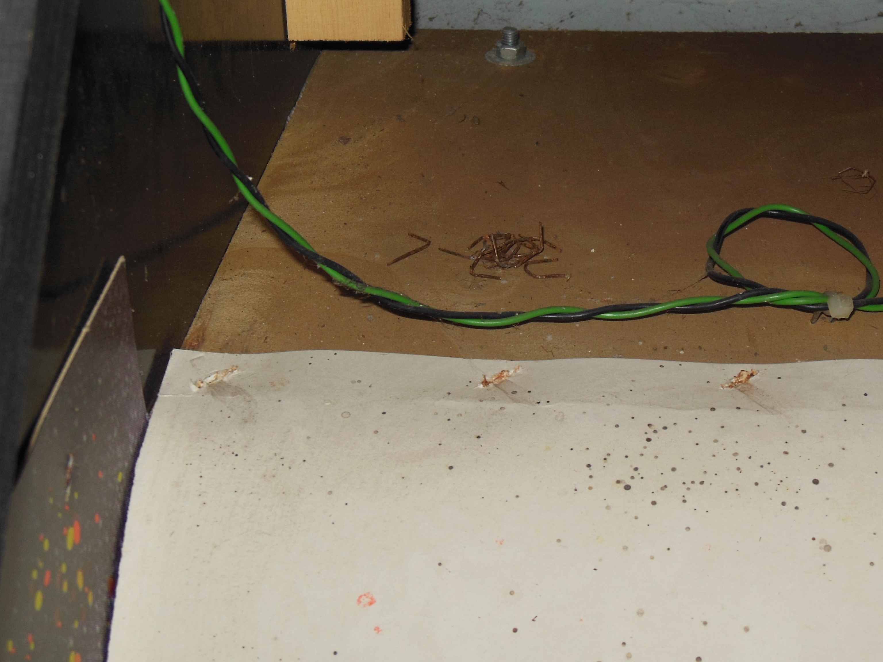 I'd already removed the monitor to re-use in another game but aside from that the interior was complete. The whole of the wiring loom from the DC power supply output forwards had been completely replaced for the Mr. Do! conversion - only the AC side Zaccaria wiring remained original. The lower back panel was loose on the right side where again the side wall had split down the T-molding groove.