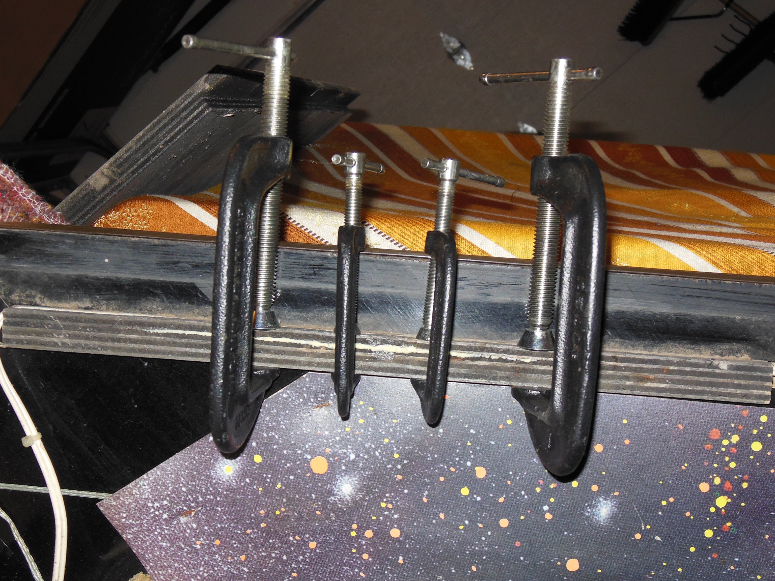 Moisture had also caused the plywood to delaminate on the right side of the hatch bracket. Wood glue was spread into the gap and held in place with a few G-clamps.