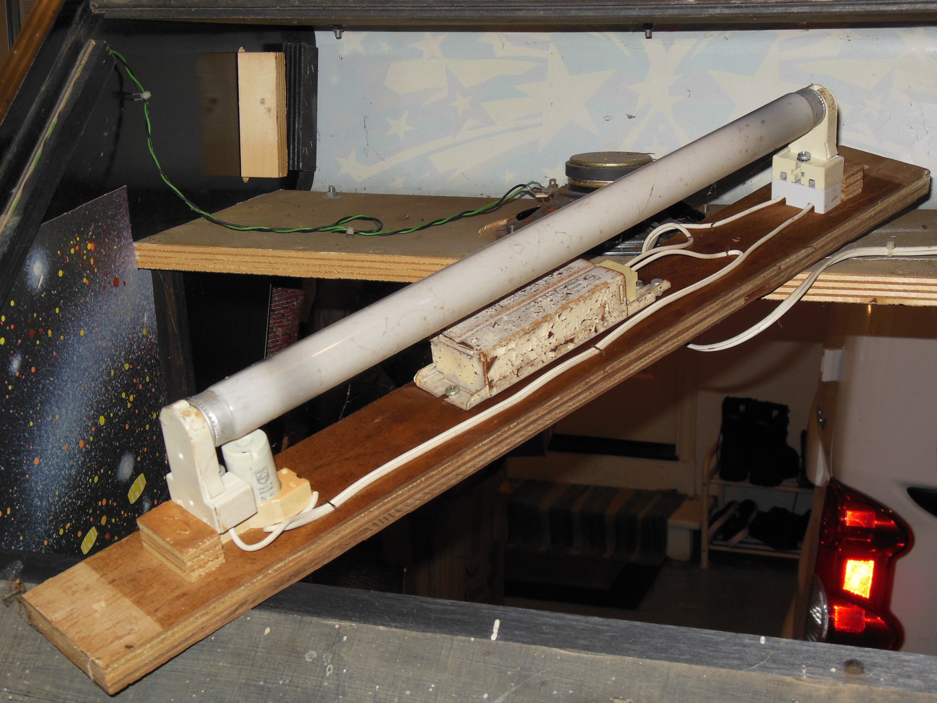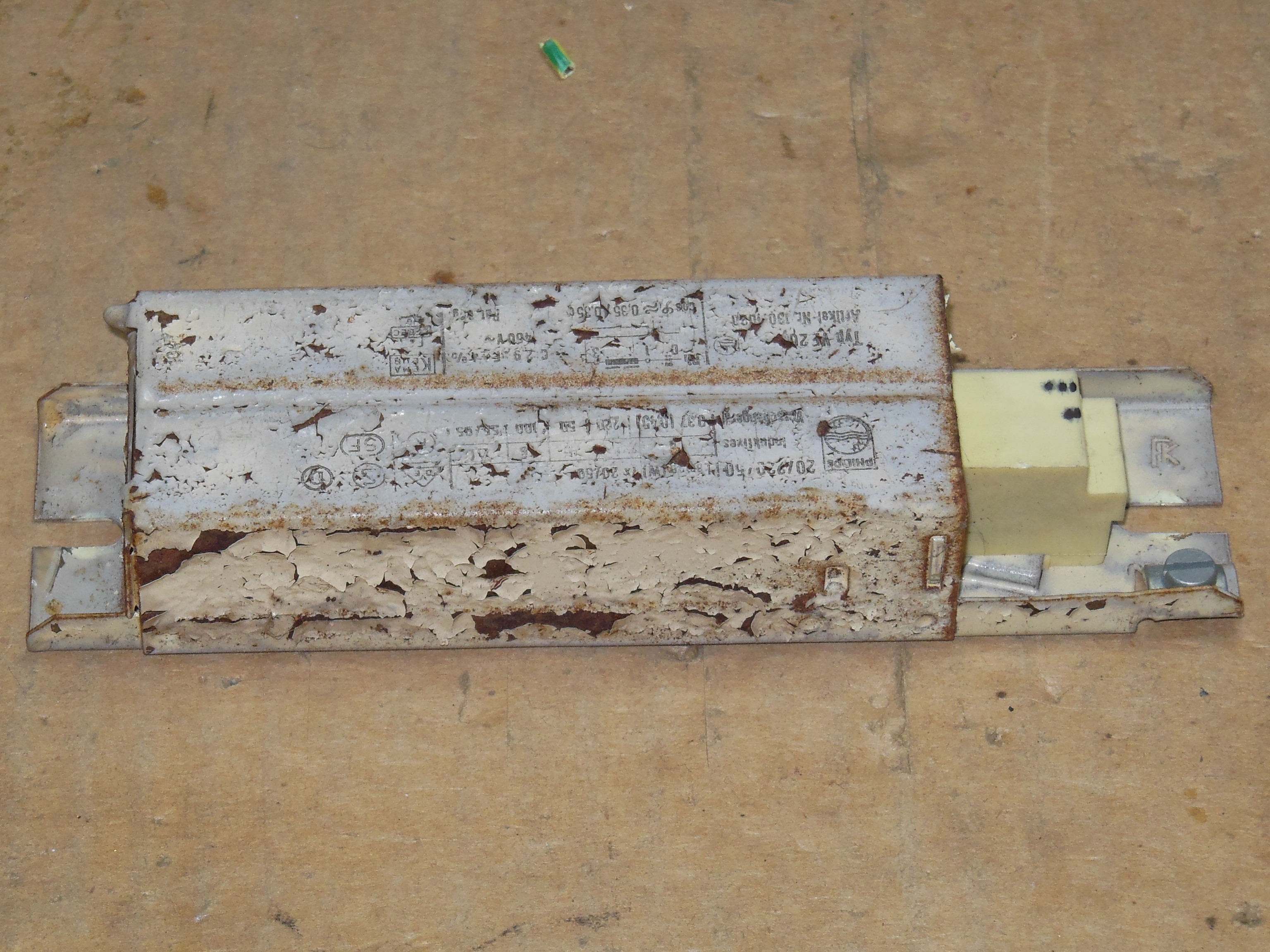 Despite the terrible look of the ballast, a new tube was all it took to get the marque light working. The ballast was removed for physical restoration to prevent flake debris.