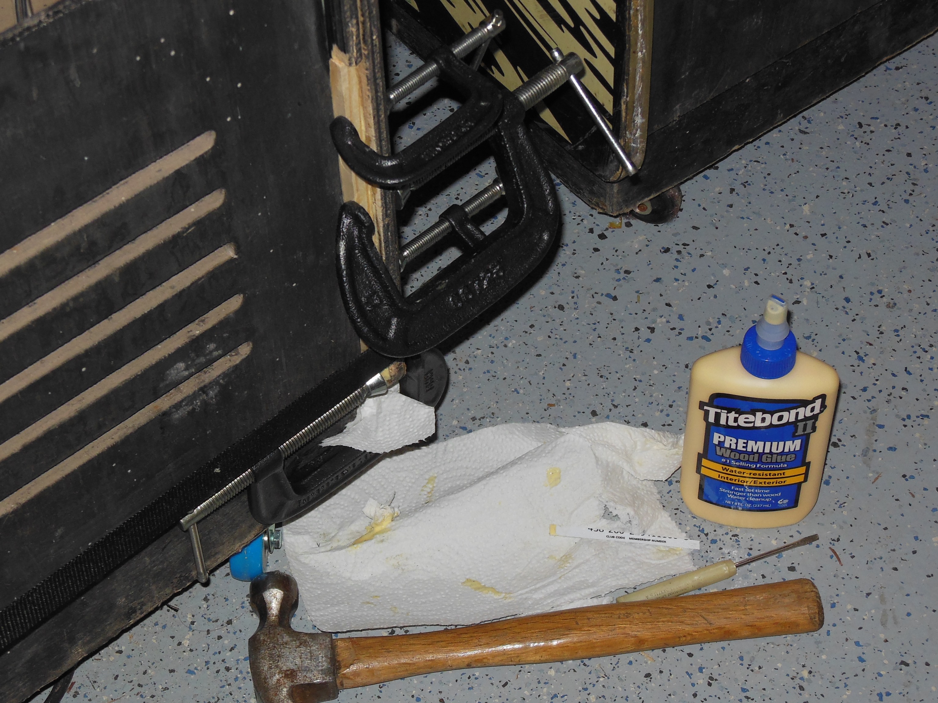 The back panel was loose on the right side because of a missing section of side wall. Home Depot had several different square dowel sizes and one of them was a very close fit to be able to replace the missing section. A small amount of sanding produced something that fit snuggly. The dowel was glued and set with G-clamps.