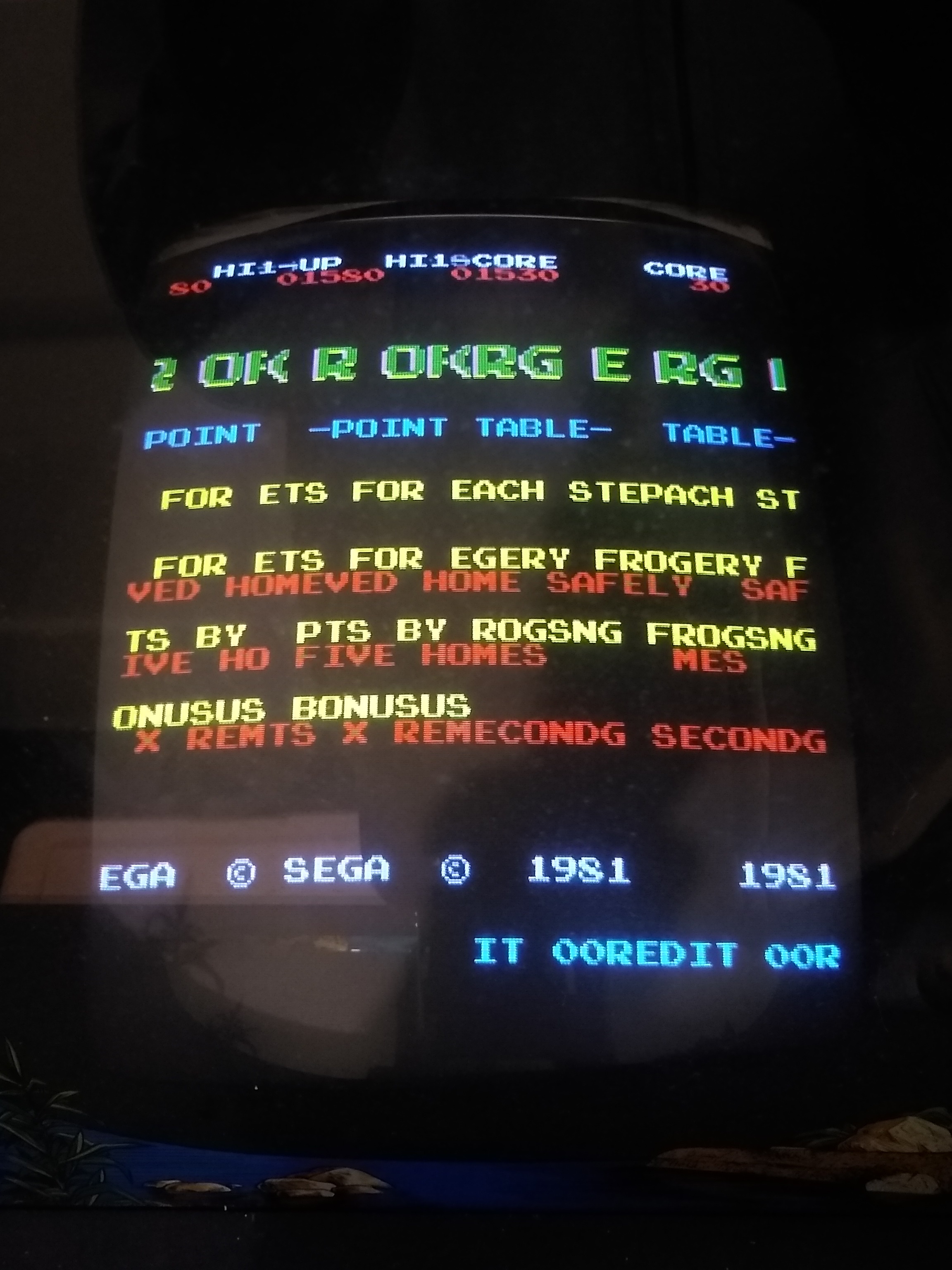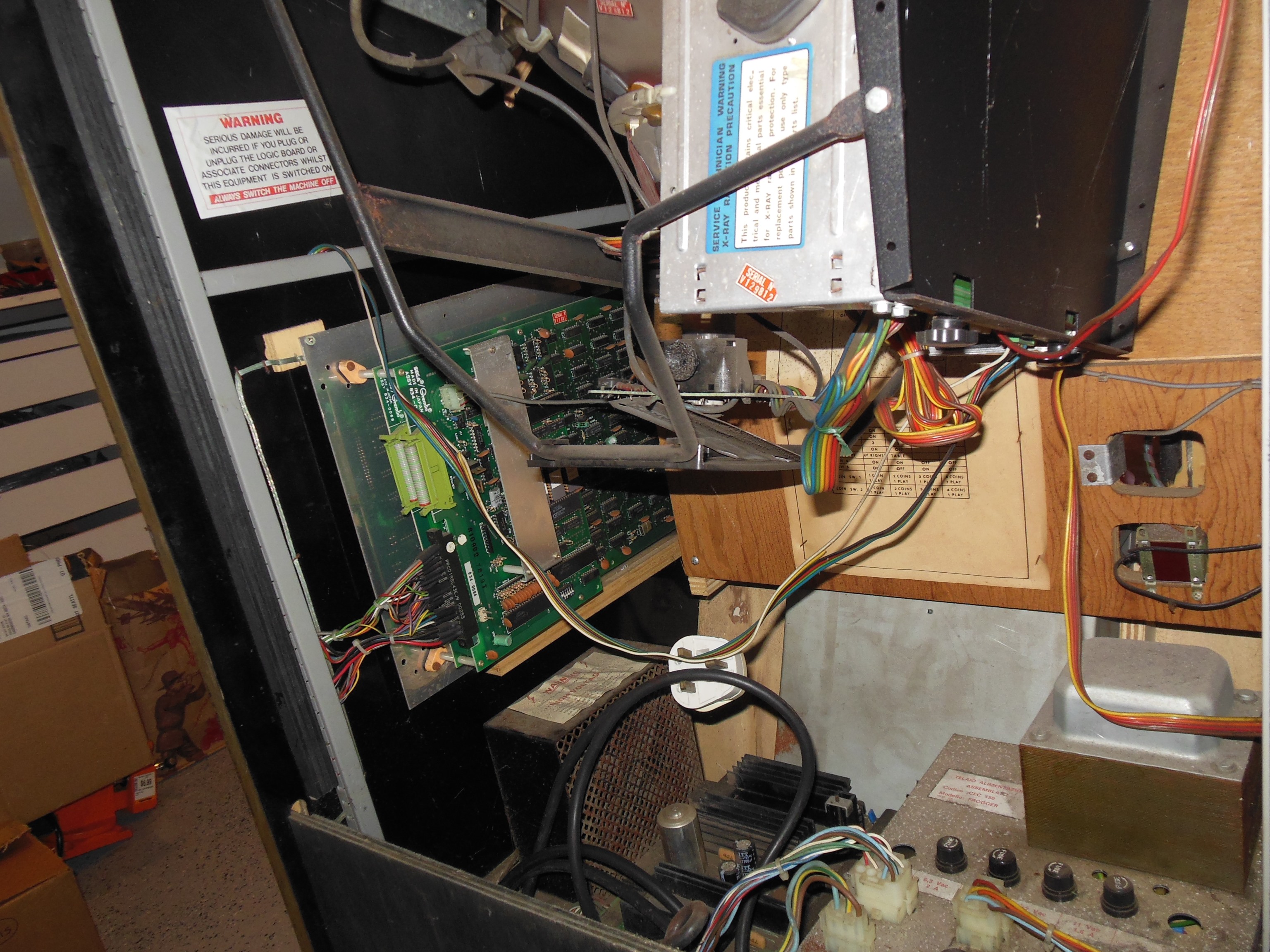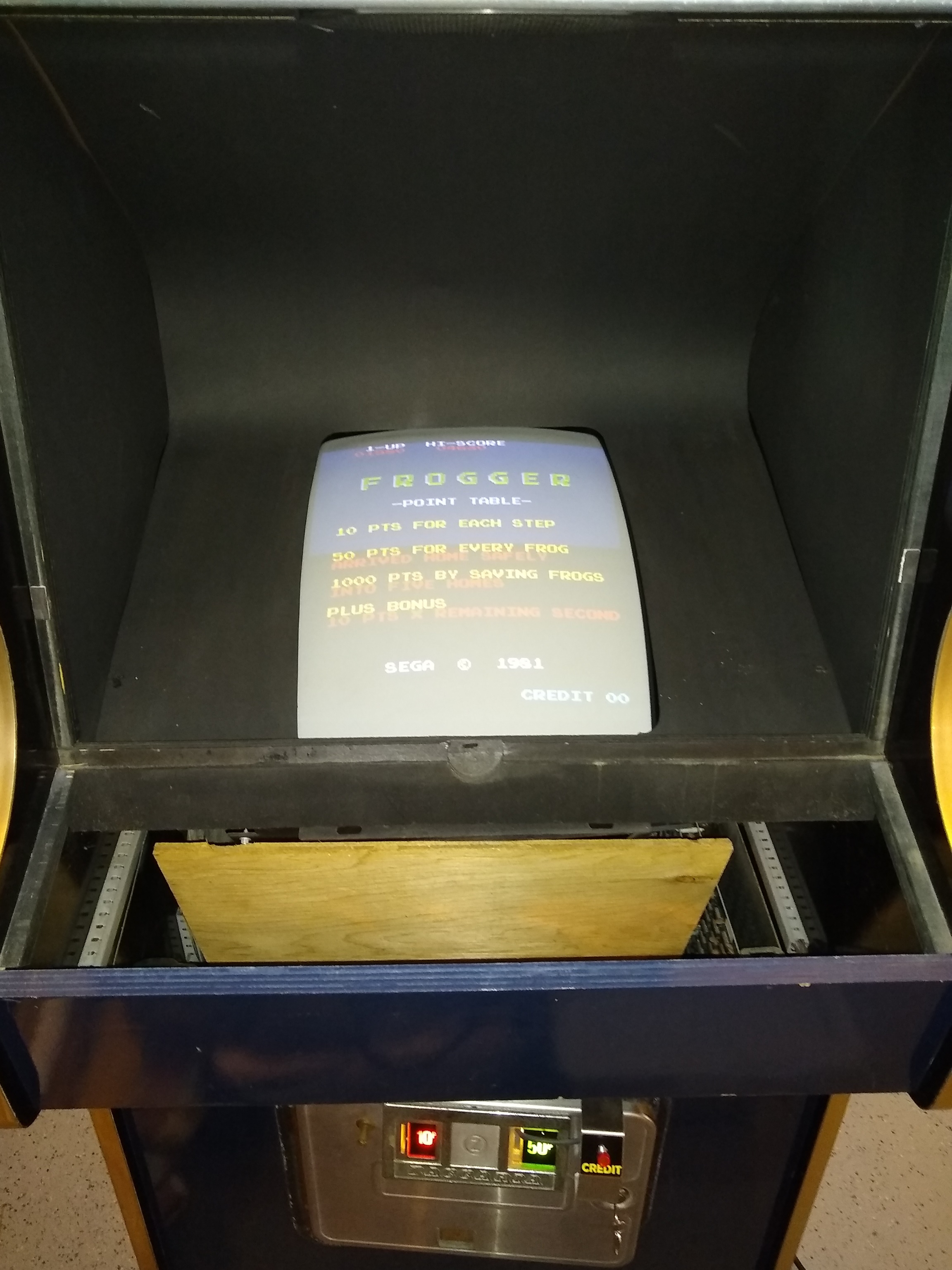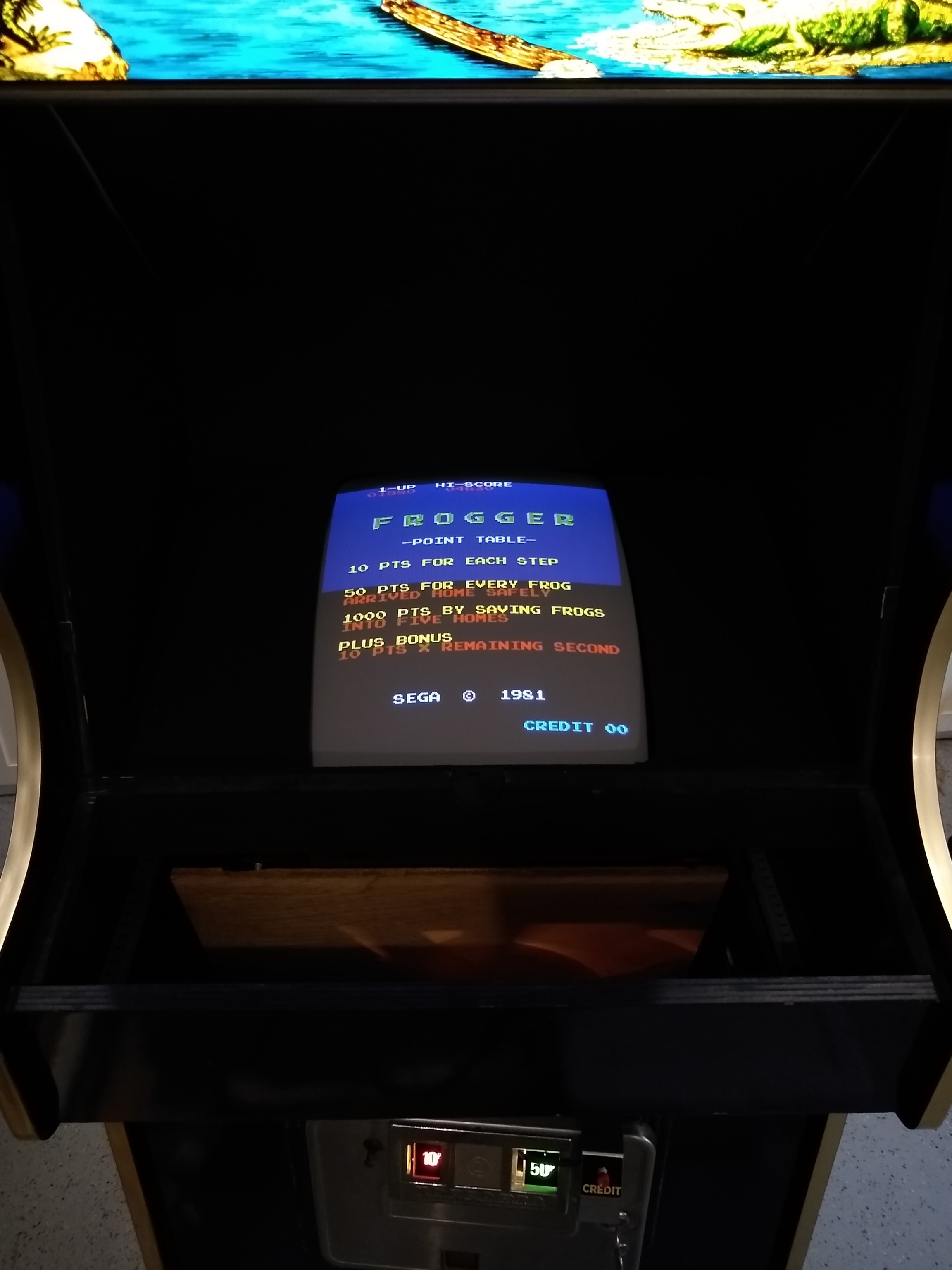 First power on was drama free - the monitor came on with a good picture and the marque light was working. There were a couple of issues - the Frogger game PCB had developed a graphics fault and there were no coin door lights.