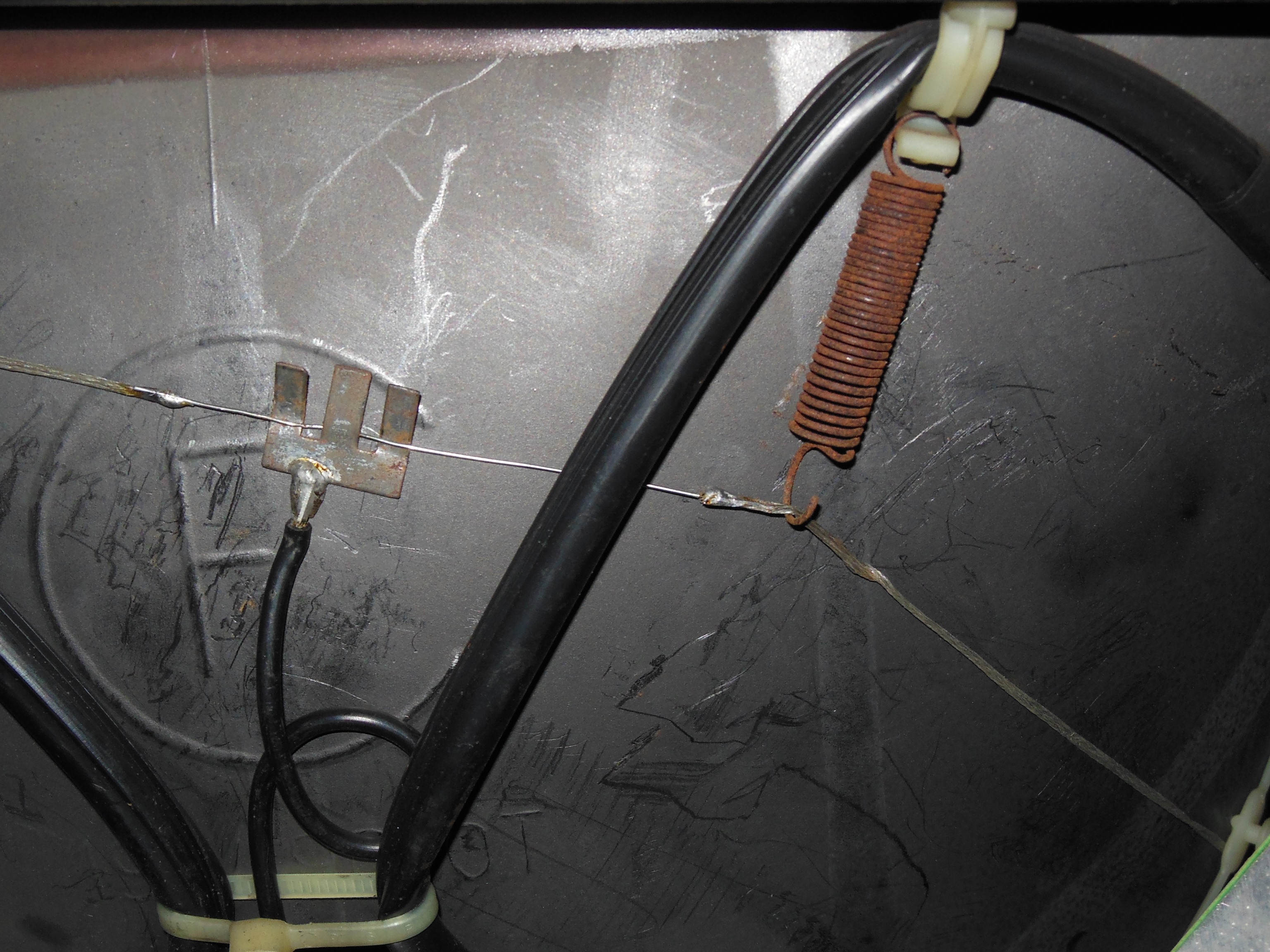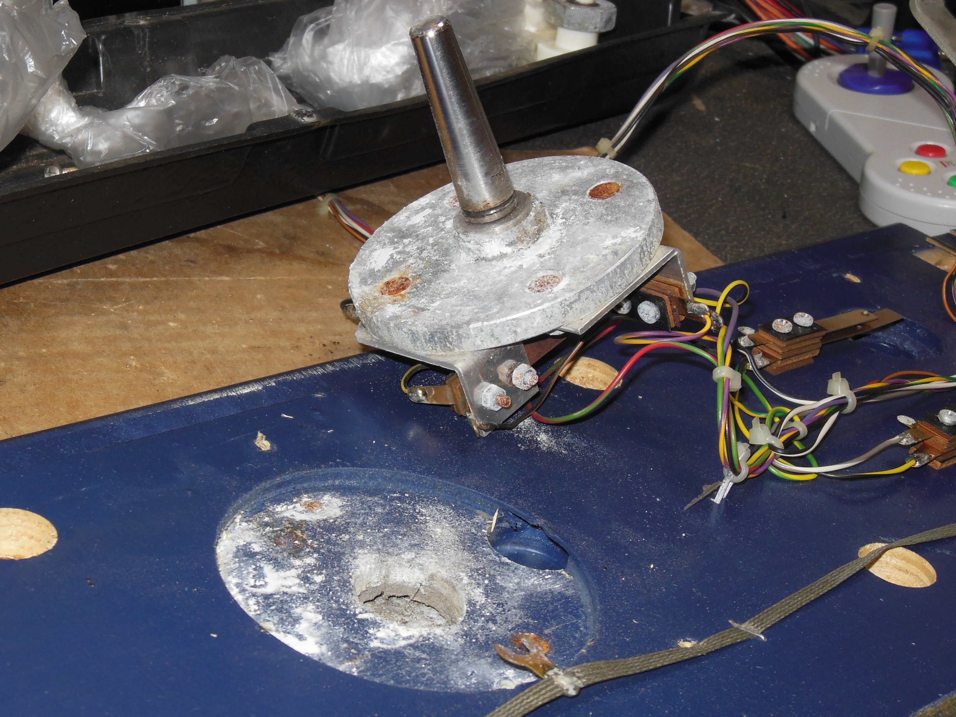 The joystick was disassembled and cleaned. There was a lot of white powdery mold/rust between the joystick frame and panel wood that was cleaned up. The joystick spring was in good condition.