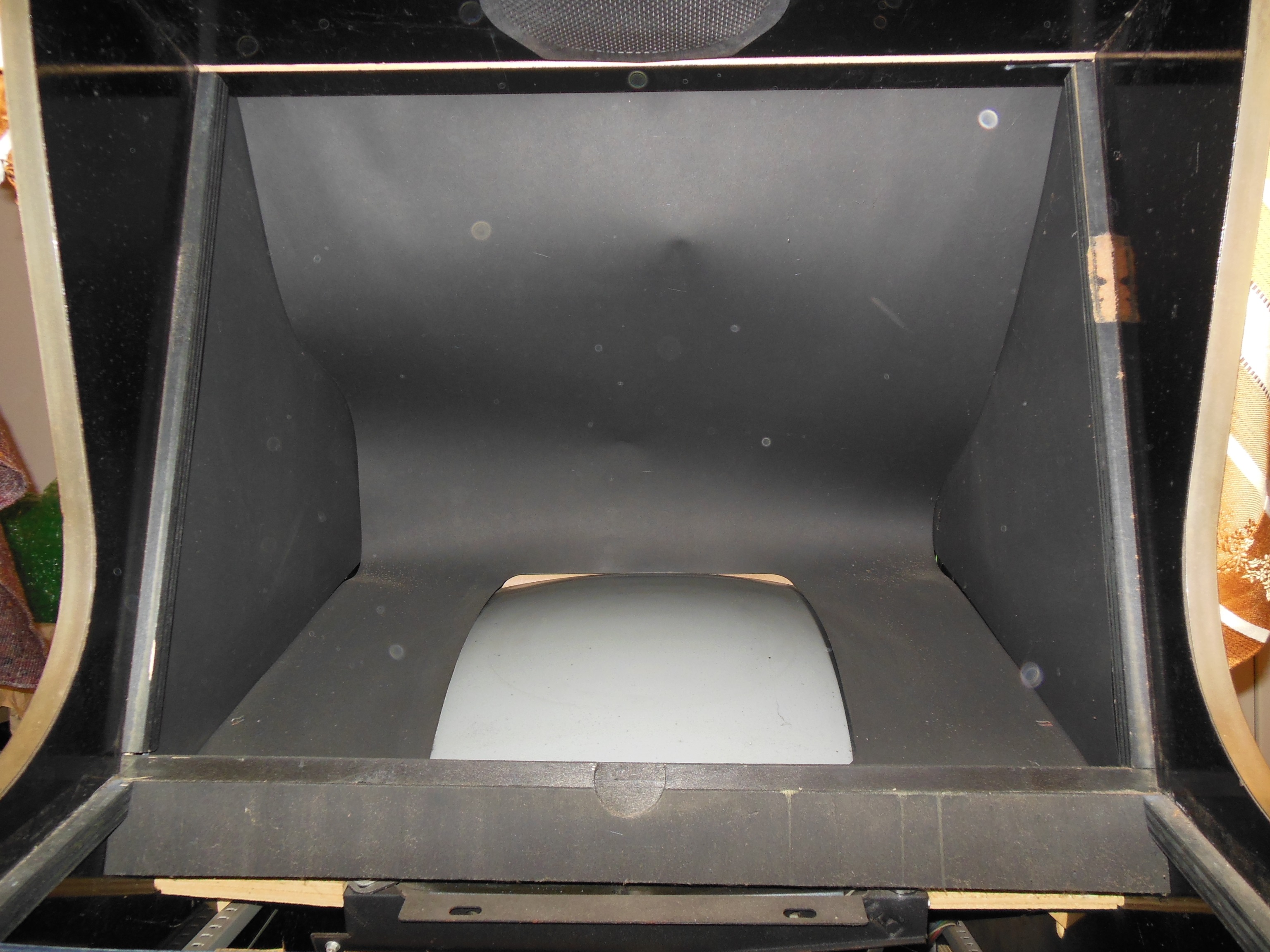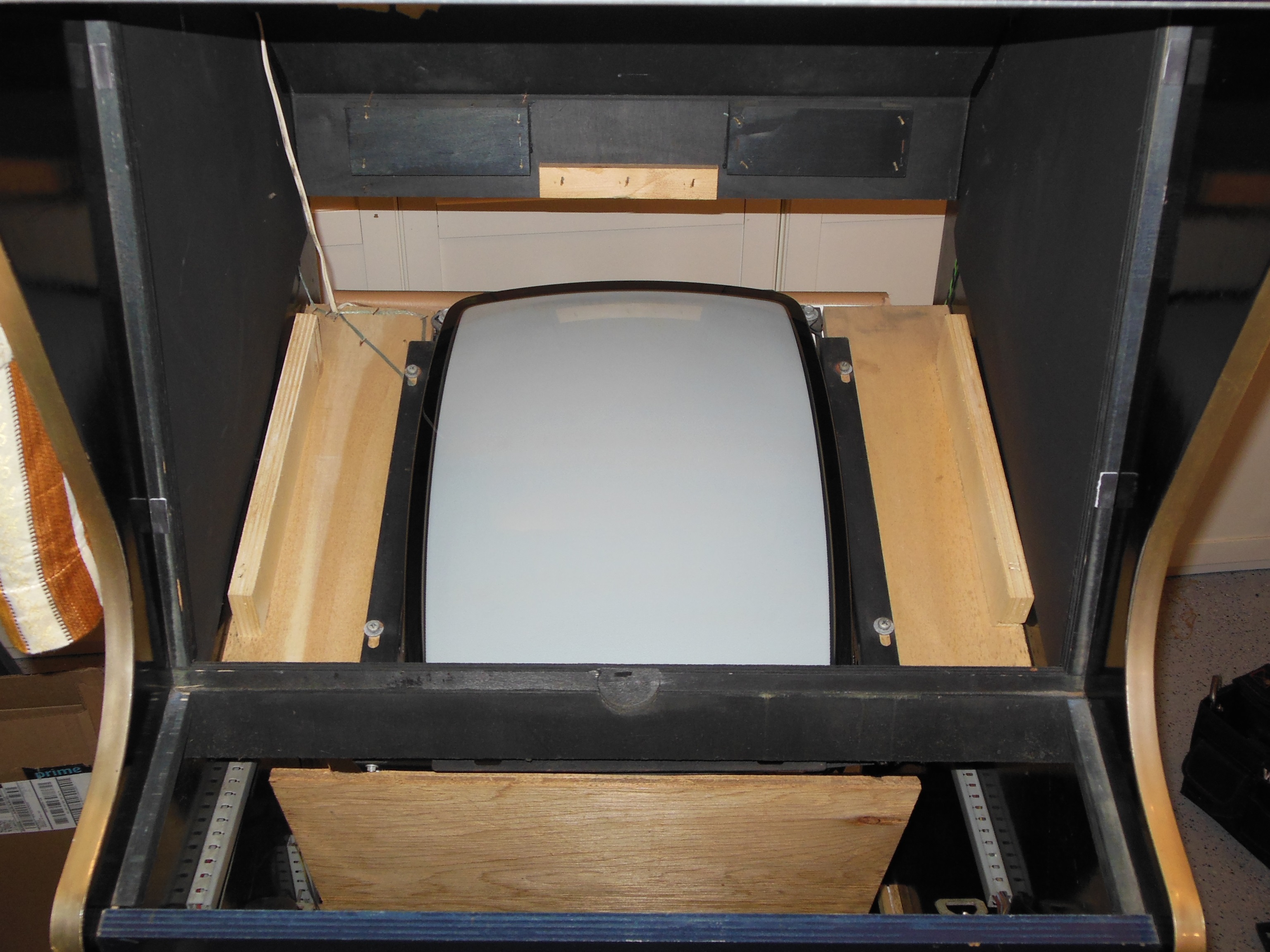 The cabinet was dusted, vacuumed and wiped down with a damp cloth. The CRT & frame was also cleaned.