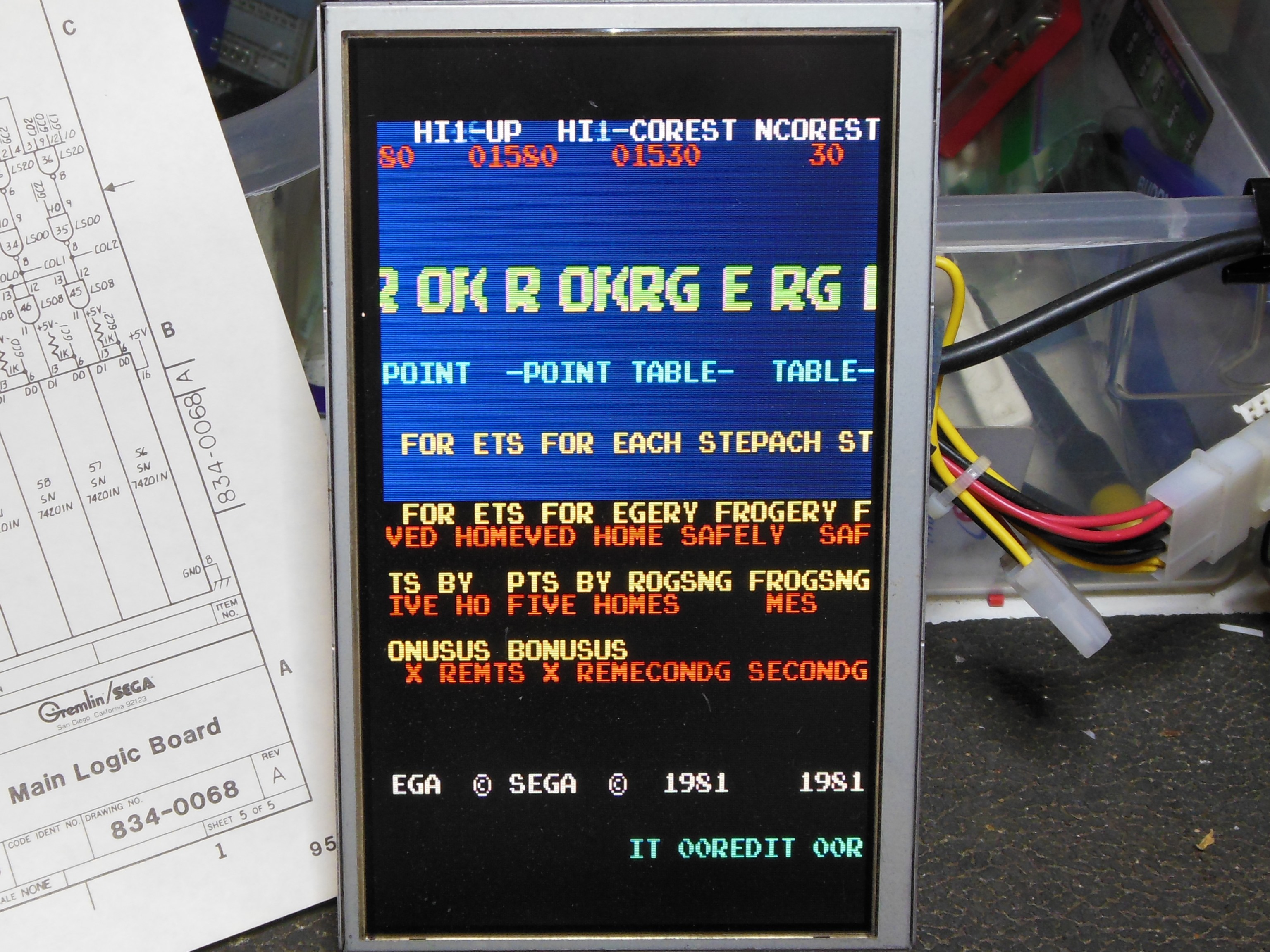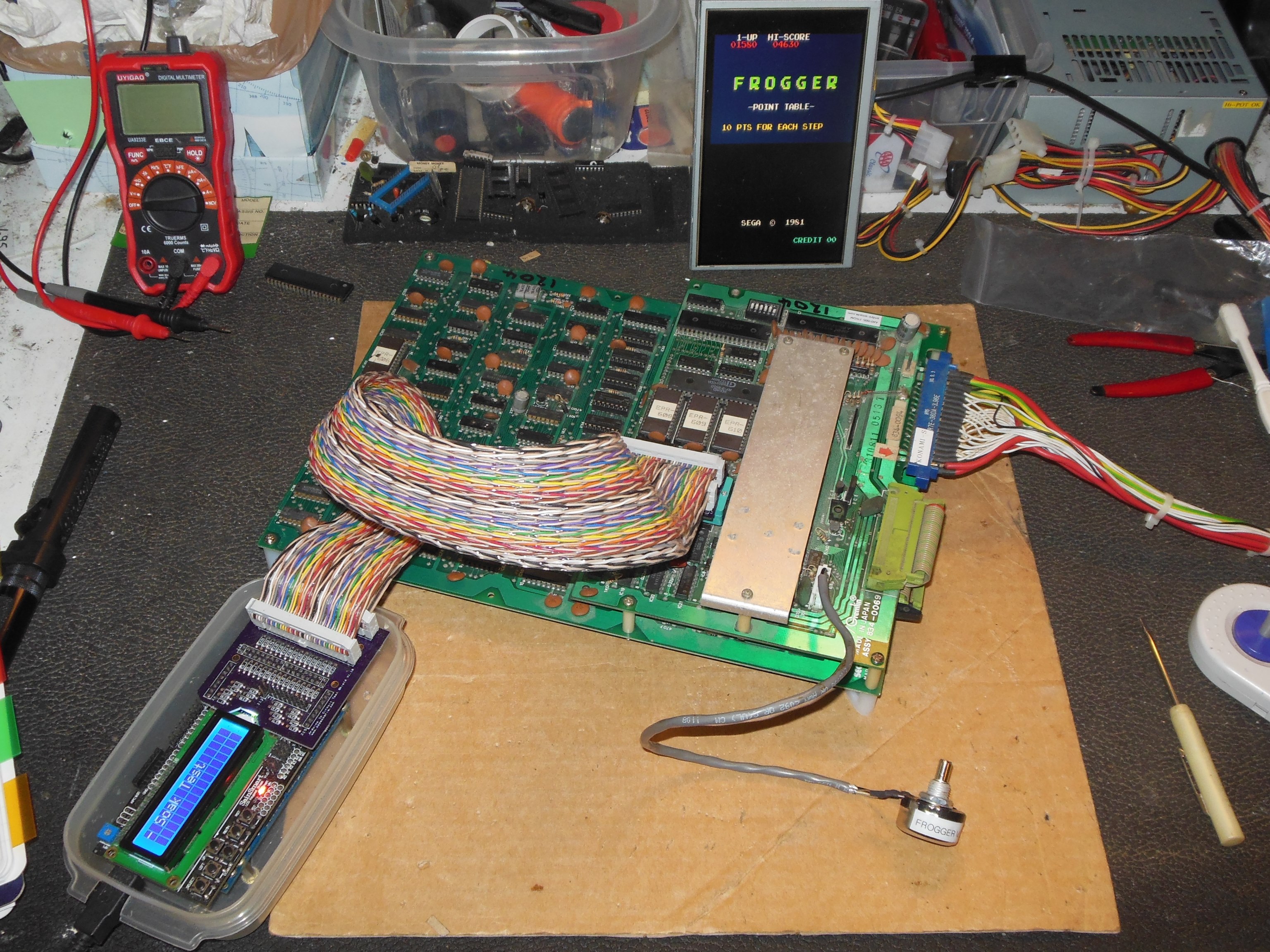 Andy at Andys Arcade sent a spare Frogger PCB to use as the show backup PCB since I had no spare original Konami-style ones. There was a small graphics fault of pixel sparkles on the sprites to fix.
