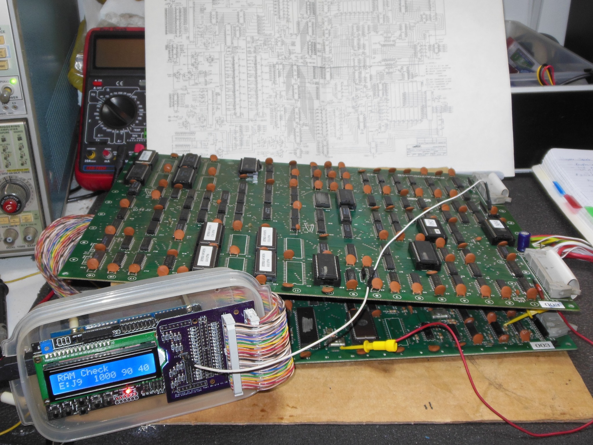Initial testing on the bench found the game PCB exhibiting the same problem as it had in the cabinet at the show. Using the Shoestring Test ROM flagged RAM IC J9 (TMM2114AP-15) as bad. Speculatively I tried a piggyback of a P2114AL-4 (200nS) on J9 that resulted in the Test ROM flagging IC H9 as bad. I decided to move on to use the Arduino ICT to figure out what was going on.