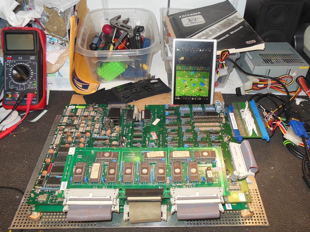 The board exhibited the same problem on the bench - massive graphics corruption. Poking around with a scope found IC 4A (empty 2732, ROMS are on the ROM board) pin 8 floating as was pins 9 and 10. These were signals E0, E1 & E2 from IC 2D (LS157). All the inputs to IC 2D looked OK so I suspected it bad. Replacing IC 2D fixed the graphics.