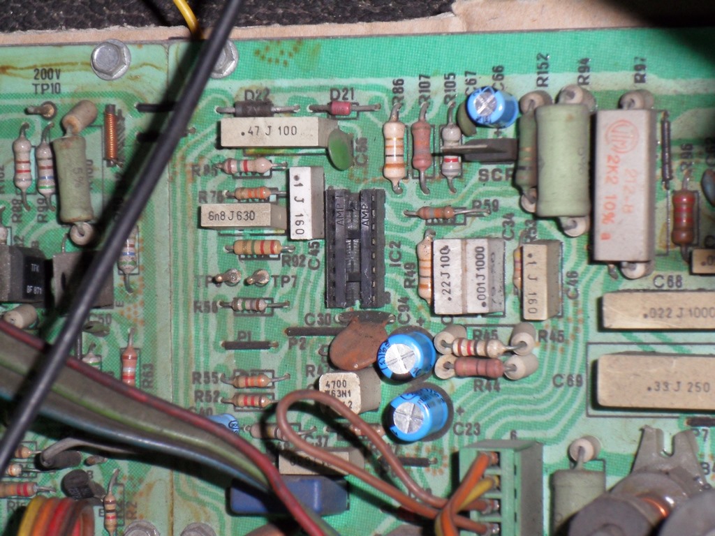 Whilst swapping out the TDA 2593 it became clear that the socket it was in was shot. Changing out the socket brought back HV but a blank screen still. Poking around with the scope there were signals going into the RGB preamplifier IC but no RGB drive coming out. Brightness and contrast didn't bring up scan lines either. The RGB pre-amp is in a socket (that I'd already changed out previously) and a replacement didn't change anything. Back poking around with the scope and comparing the blanking signal shown in the manual hinted that something was up with it on the chassis - diagram 7 looked very poor on the chassis by comparison. The BC237 at TR8 driving it was bad.