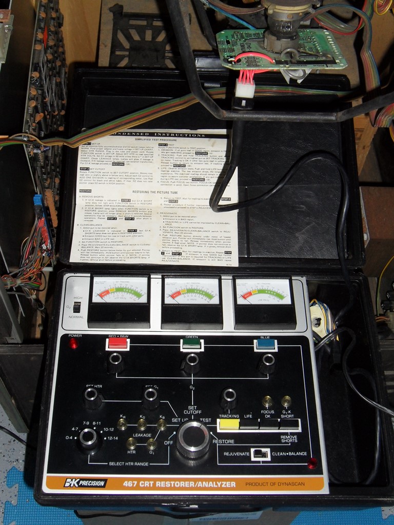 I wasn't able to get any sensible readings from the BK 467 on either the suspect ITT CRT or the Videocolor CRT. In setup the meters were either 0 or off scale. This tester was bought untested off eBay so I've no idea if it works or not - I will have to cross check the tester at a repair party some time and repair it if needed.