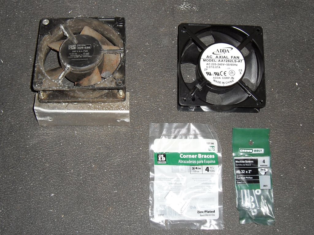 The original fan had already been replaced with a "modern" PC style fan that now too was in need of replacement (rusting, rattling and scraping). The replacement is a standard size 120mmx120mmx38mm 220V-240V 50/60Hz, in this case an ADDA AA1282LS-AT low speed/low noise variation off eBay. The brackets and screws are standard hardware from Home Depot.