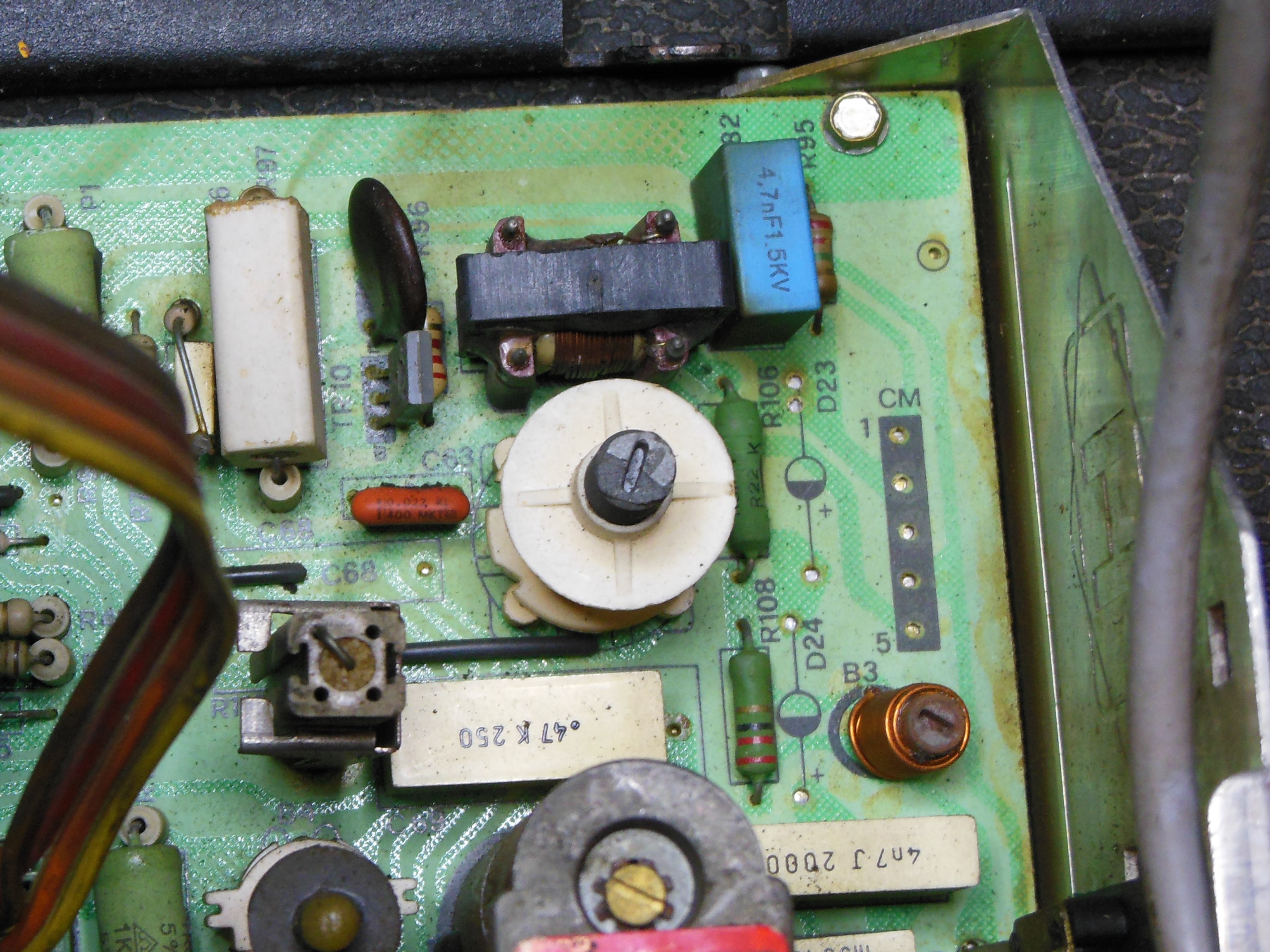 On the bench there was a faint click on power on, but otherwise no signs of life. IC2 (TDA2593) pin 1 supply measured 4.64VDC and pin 2 supply measured 4.74VDC. The bootstrap voltage for the horizontal oscillator IC was a bit low compared with the datasheet. With IC2 removed the supply voltage at pin 2 measured 11.1V. Replacing IC2 had no effect. Using a light bulb load, B+ measured 112.9VDC, slightly low versus 126VDC, but close enough. Suspecting something clamping the supply voltage, R107 was opened to disable the HV overvoltage shutdown circuit but there was no change. Bending out pin 3, horizontal drive, also had no effect. D15 (1N4004) checked out OK and R94 measured 9.99KOhm OK. The voltage drop across R45 was 2mV and across R44 was 170mV, no significant drop in either case and I suspected that the low bootstrap voltage may be by design.