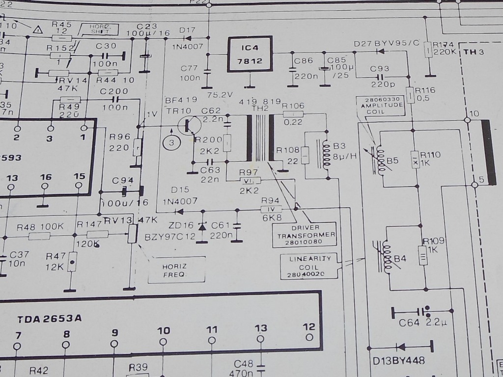 The B+ voltage measured a stable 126V DC and thus seemed OK. The TDA2593 bootstrap voltage on pin 2, notionally +12V, measured 6.8V and from prior measurements during previous chassis repair seemed to be the "normal" bootstrap voltage.