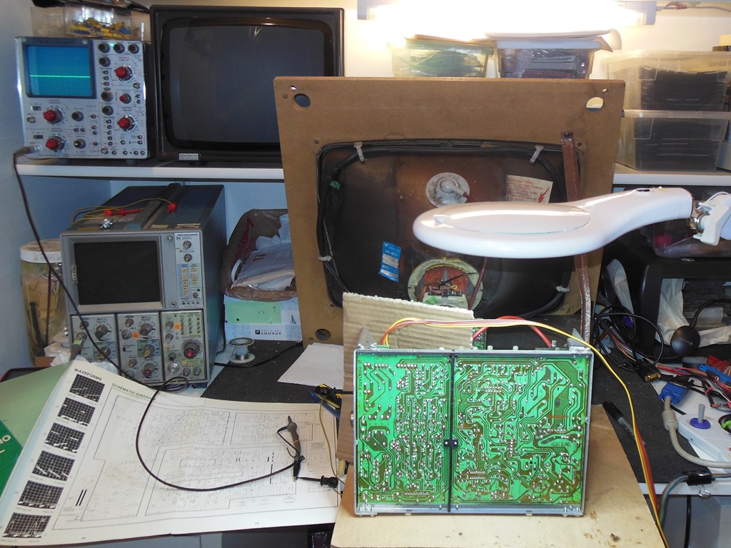 There was one additional issue with the picture having unstable red brightness. I'd seen this problem on the 900E series a few times now, typically caused by a bad transistor in the colour pre-amplifier stage. I decided to try a drop of freezer spray on each transistor in the red circuit and got a hit on TR20 (BC547 == BC237). Replacing TR20 fixed the red drive and the chassis ran on the bench for a few hours with no further issues.