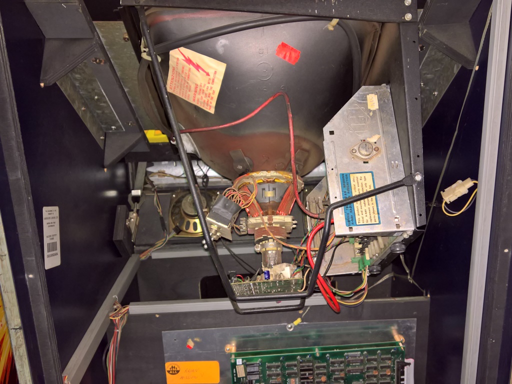The game ran for a few minutes during pre-show testing before the monitor died. Suspecting an HV shutdown, after a power cycle the monitor came back on but after a few minutes it shut down again. Subsequent power cycles didn't bring the monitor back, it was dead. There was no HV or neck glow so I pulled the chassis for repair.