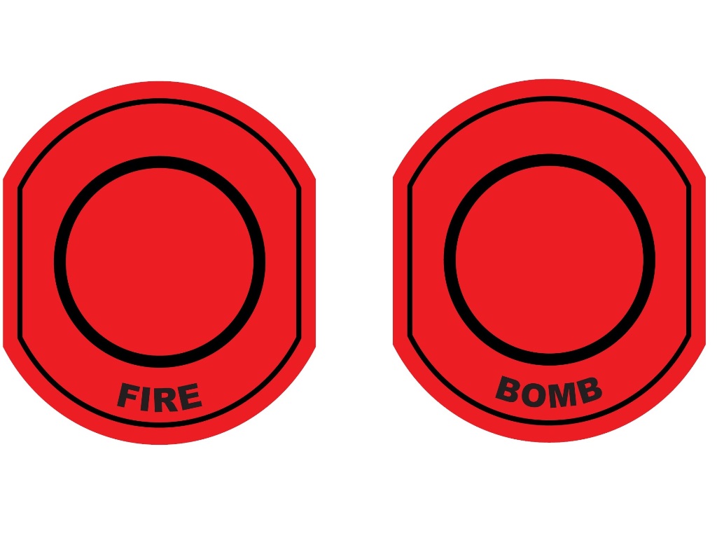Another request for reproduction artwork for these buttons was answered by Ramakers on the Dragons Lair Fans forum who was able to re-create a couple of red "FIRE" and "BOMB" collar images (since the yellow start buttons had yellow collars we theorized that the fire button collars would have been red to match the buttons also).