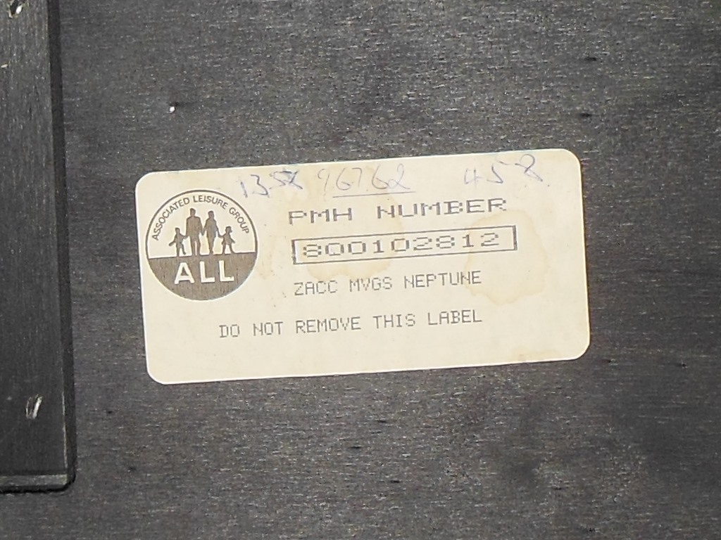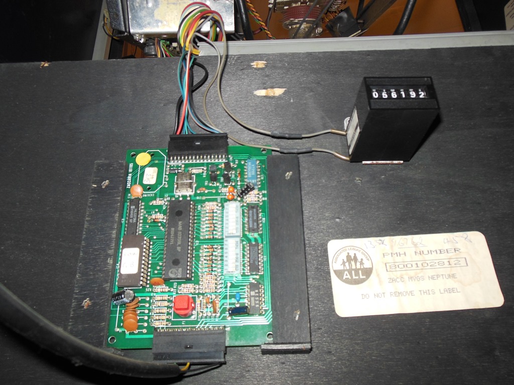 Inside the coin door was a very nice label naming the cabinet/configuration as "ZACC MVGS NEPTUNE", the name that I chose to keep (rather than the generic "Zaccaria Universal" factory name). Inside the coin door the 1B1185 credit PCB was present and unhacked except for an operator modification to move the coin counter from behind the coin door to behind the cash box door.