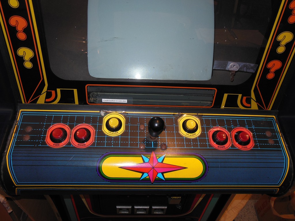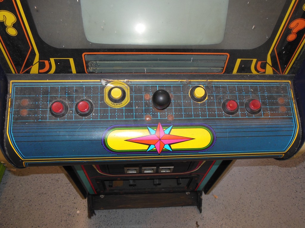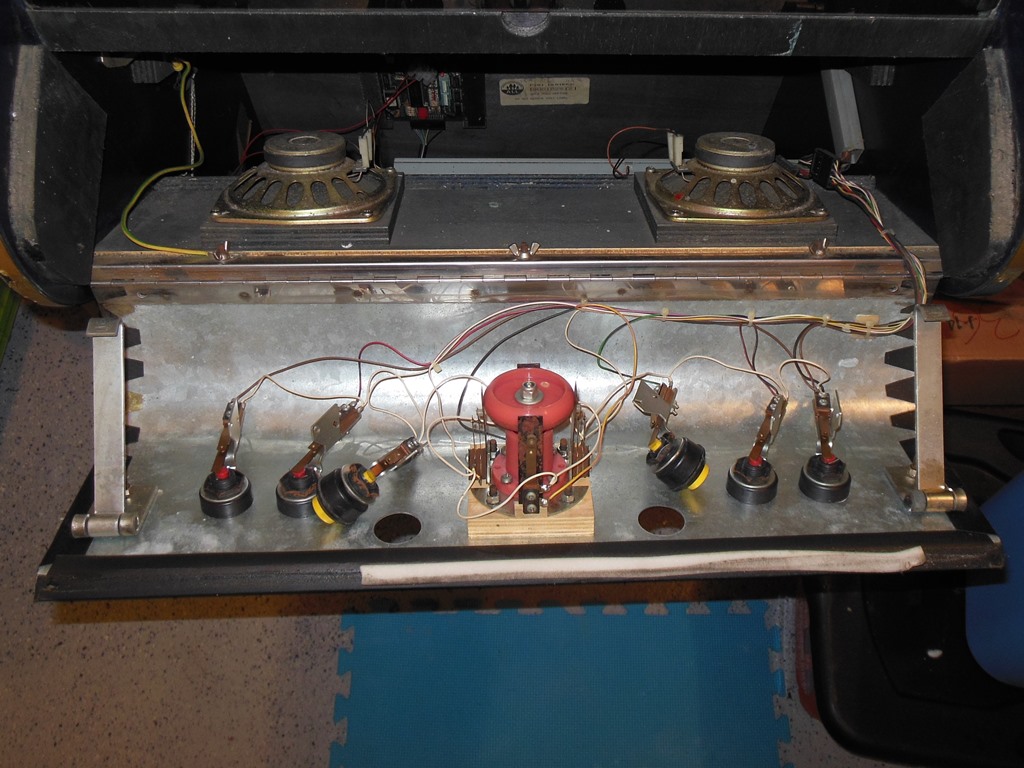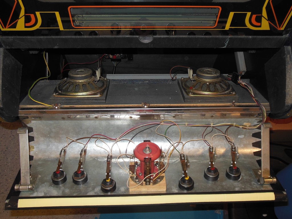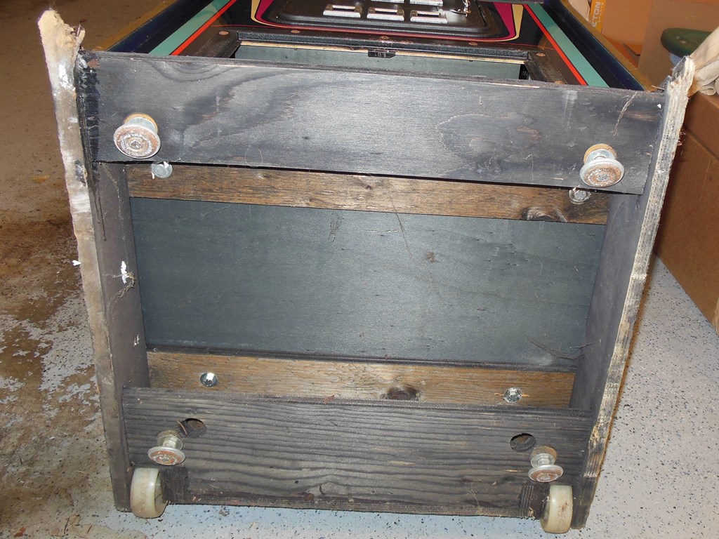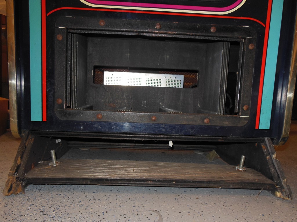 The general exterior condition looked pretty good. Some of the button collars were damaged or missing but the underlying overlay was in good condition. The cash box cover was missing and the foot rest base was damaged but the artwork was in reasonable condition except for scratches and dings here and there. The T-molding didn't fit too well and had a few damaged spots.