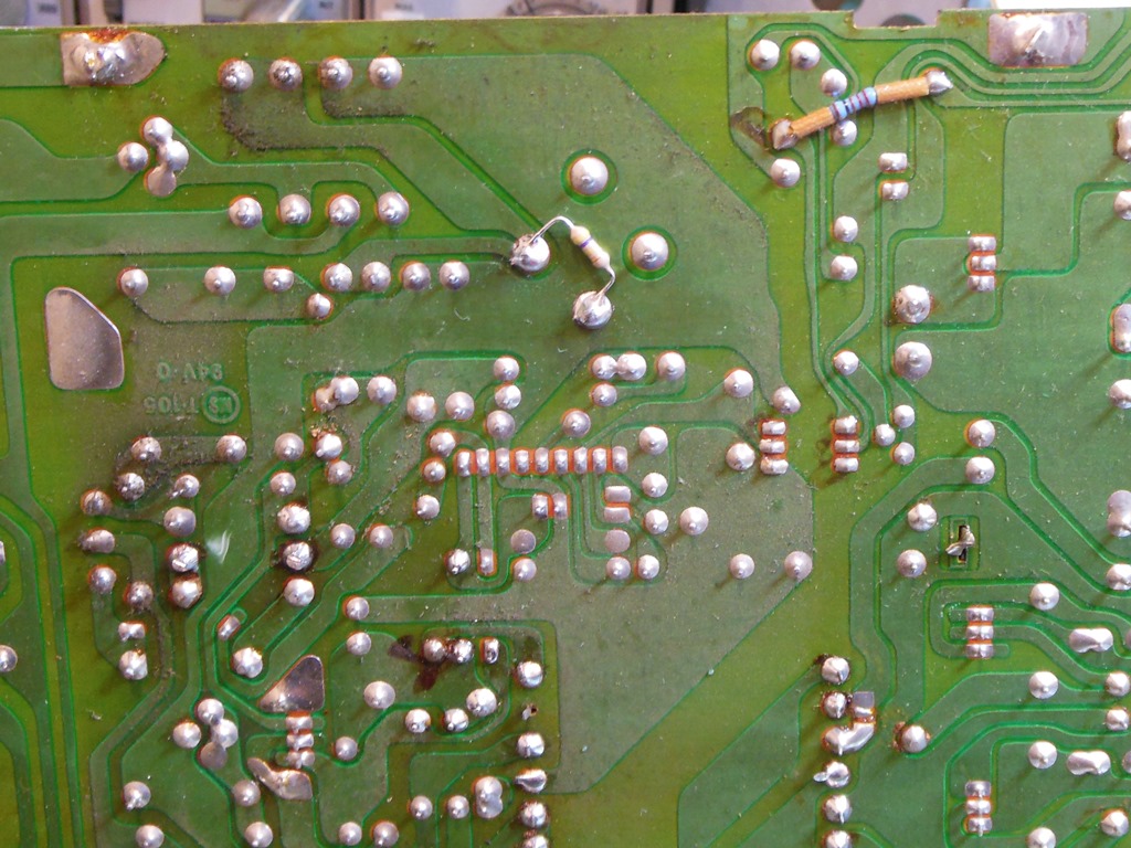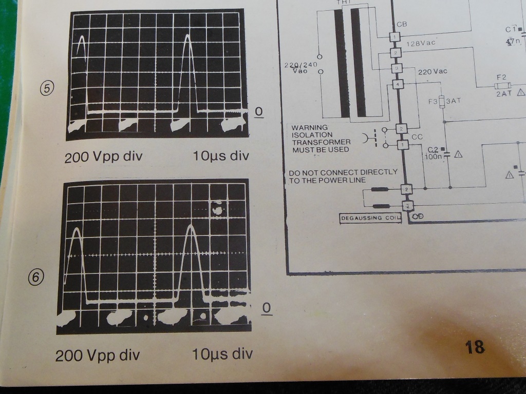 Next up was to address the picture being two small and with noticeable ripple across it. B+ measured 102-105V, both too low and seemingly unregulated. Investigating the power board found the 8.8V feed missing. TR7 was removed and tested bad. On replacement the 8.8V read 2.6V, getting better but still not right. Replacing both the BF871 and BF872 (both of which tested fine on my meter for Hfe but I suspected really were faulty) fixed the power supply, bringing back a full-size ripple-free picture.