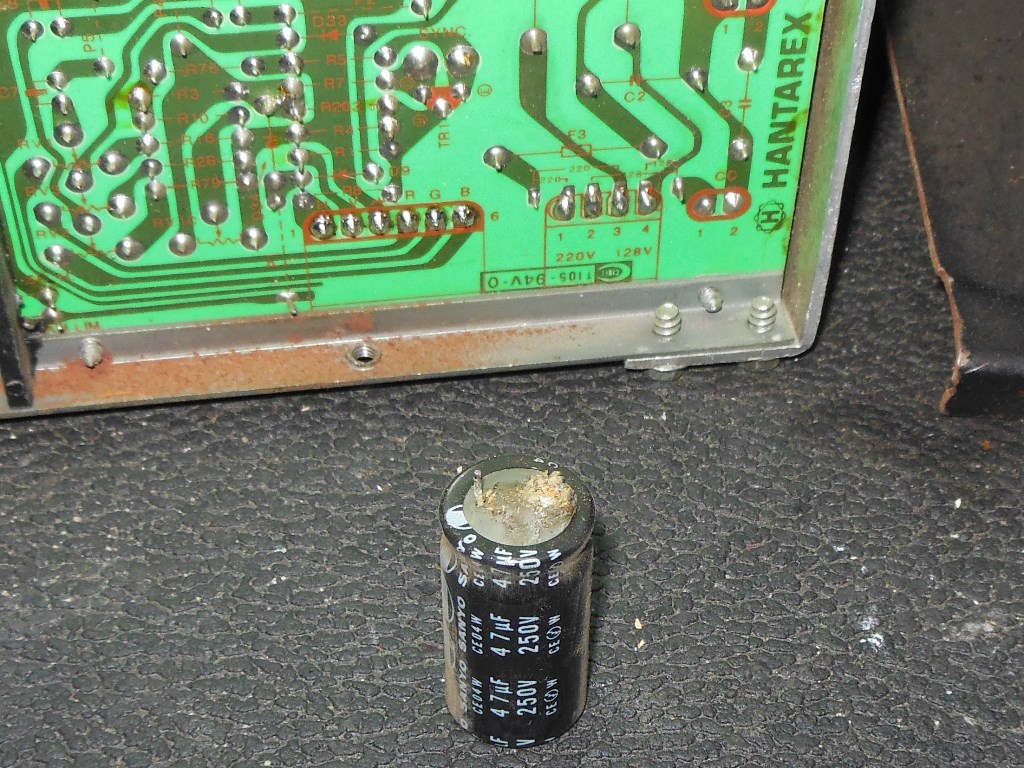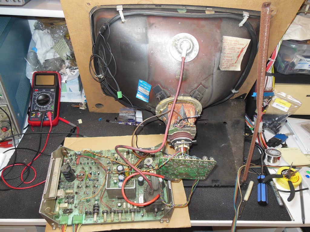 The second Hantarex MTC-900E chassis had some physical damage. Initial testing indicated it was running but the vertical sync wouldn't lock, a capacitor on the neck board vented out and the picture quality was poor. A cap kit took care of the vented capacitor on the neck board but still left no vertical sync and now the red gun was full on. The full on red was a simple dry joint on a drive transistor on the neck board.