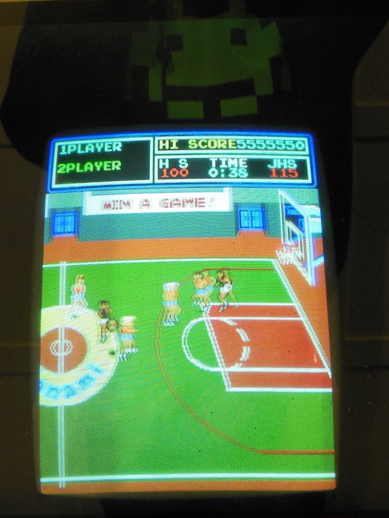 The monitor was adjusted to assess picture quality. With the Konami Super Basketball game PCB the adjusted pictured looked excellent (the second photo looks blurry because the court is scrolling).