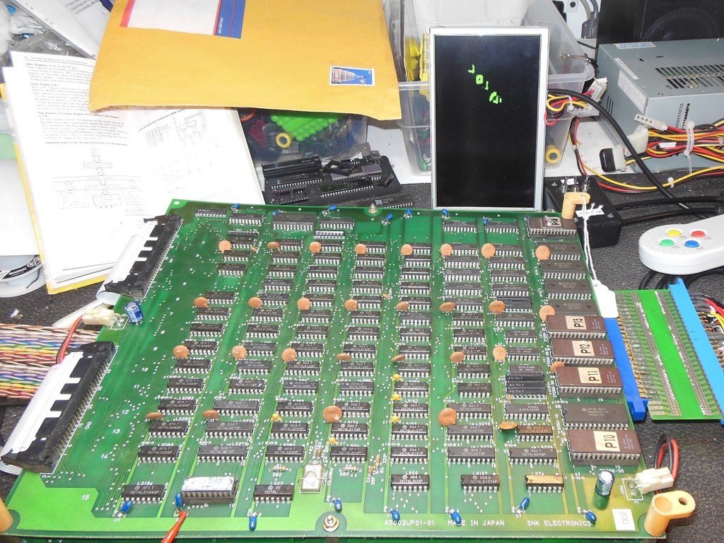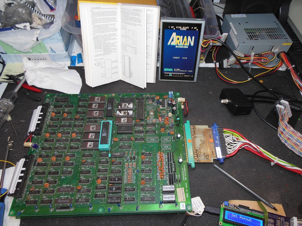 The SNK Arian Mission game PCB (also known under the title Alpha Mission and A.S.O.) seemed relatively rare to find. Luckily a collector in the UK had a couple of untested PCB's to start with. One was in better physical condition than the other but neither were working as is so repairs were needed. I selected the most promising candidate to start with. I also added support for Arian Mission to the Arduino ICT to aide with board repair.
