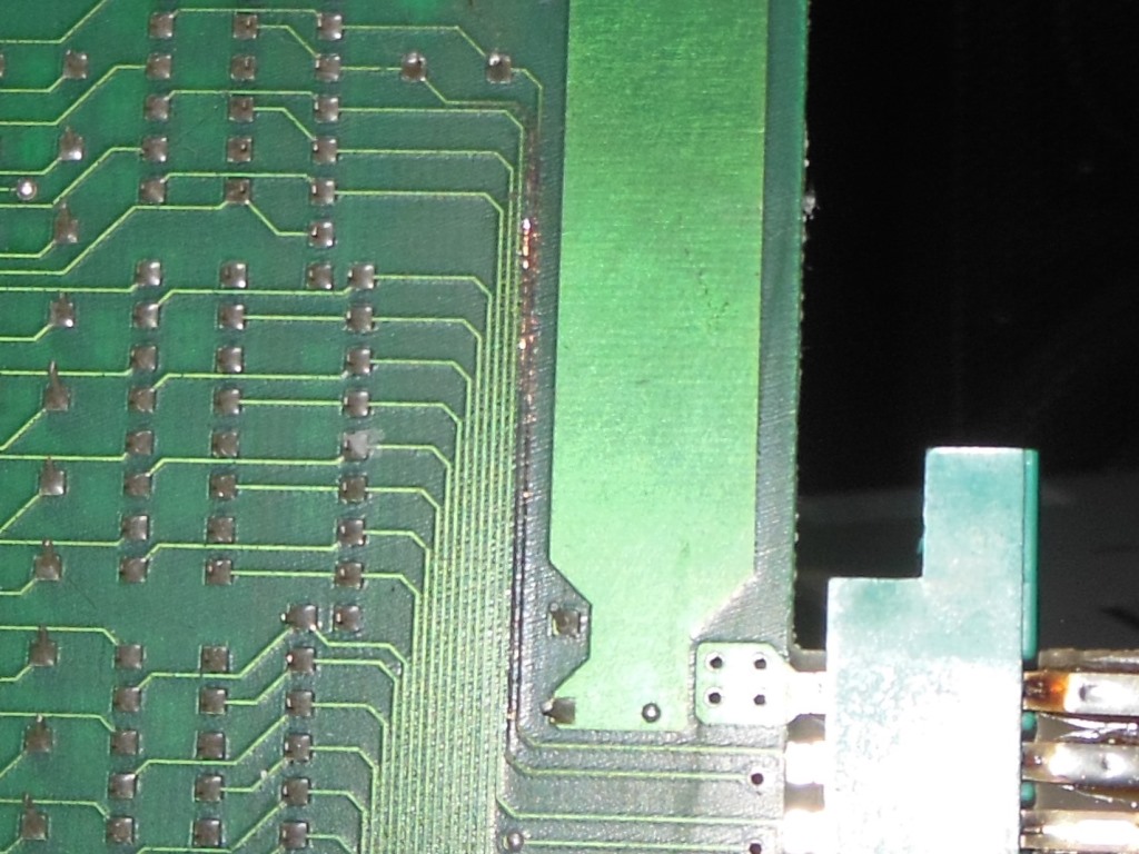 The game ran OK for a short while then went back to reporting errors on CPU B. Inserting the Arduino ICT again showed RAM Check OK but all the RAM was bad. The address pin check flagged intermittent address pin errors for 00040,00080,0100,0200 across all RAM banks. Video IC A4 (LS157) pin 7 was back to looking bad again. This suggested a bad input pulling on pin 7. Sometimes it's possible to discover a problem with a resistance check. Poking around found video A6 pin 4 at 2.2 Ohms to ground and video A7 pin 10 at 28.4 Ohms to ground. On the CPU boards IC A3 pin 9 showed 28 Ohms to video IC A4 pin 7 that cleared when the ribbon cable was unplugged confirming a problem on the video PCB. Going over the PCB did not find any common device that shares both signals - the only remaining cause I could think of was a track to track short. There were a couple of spots where the tracks ran parallel. The first spot didn't show anything with the meter but probing the second spot near the edge connector suddenly caused the resistance to jump to 125 Ohms. There appeared to be some residue near the underside of the edge connector that I cleaned off with flux cleaner. This eliminated all the odd resistances and the game was back working OK with no further boot issues :)