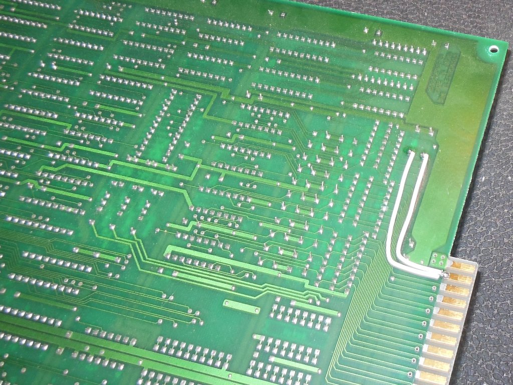Initially the board would fail one of the self-tests or not boot at all. The first step was to replace the inter-board ribbon cables that looked rough. That improved things considerably, with the game coming up most of the time (still crashing/not booting sometimes). The game wouldn't coin up, an issue that was traced to burnt out tracks between the edge connector and the coin input circuit on the PCB. With the tracks repaired the game could be coined and played. There some odd pixel sparkles here and there but aside from that everything appeared to be working fine. The no boot issue I left for now since it cleared on power cycle.