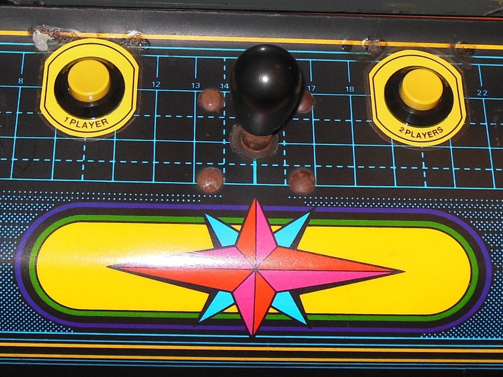It was whilst I was cleaning the control panel that I noticed "shadows" around the fire buttons, left over residue from button collars. No part of them remained except for the residue, but it was clear they must have existed originally.