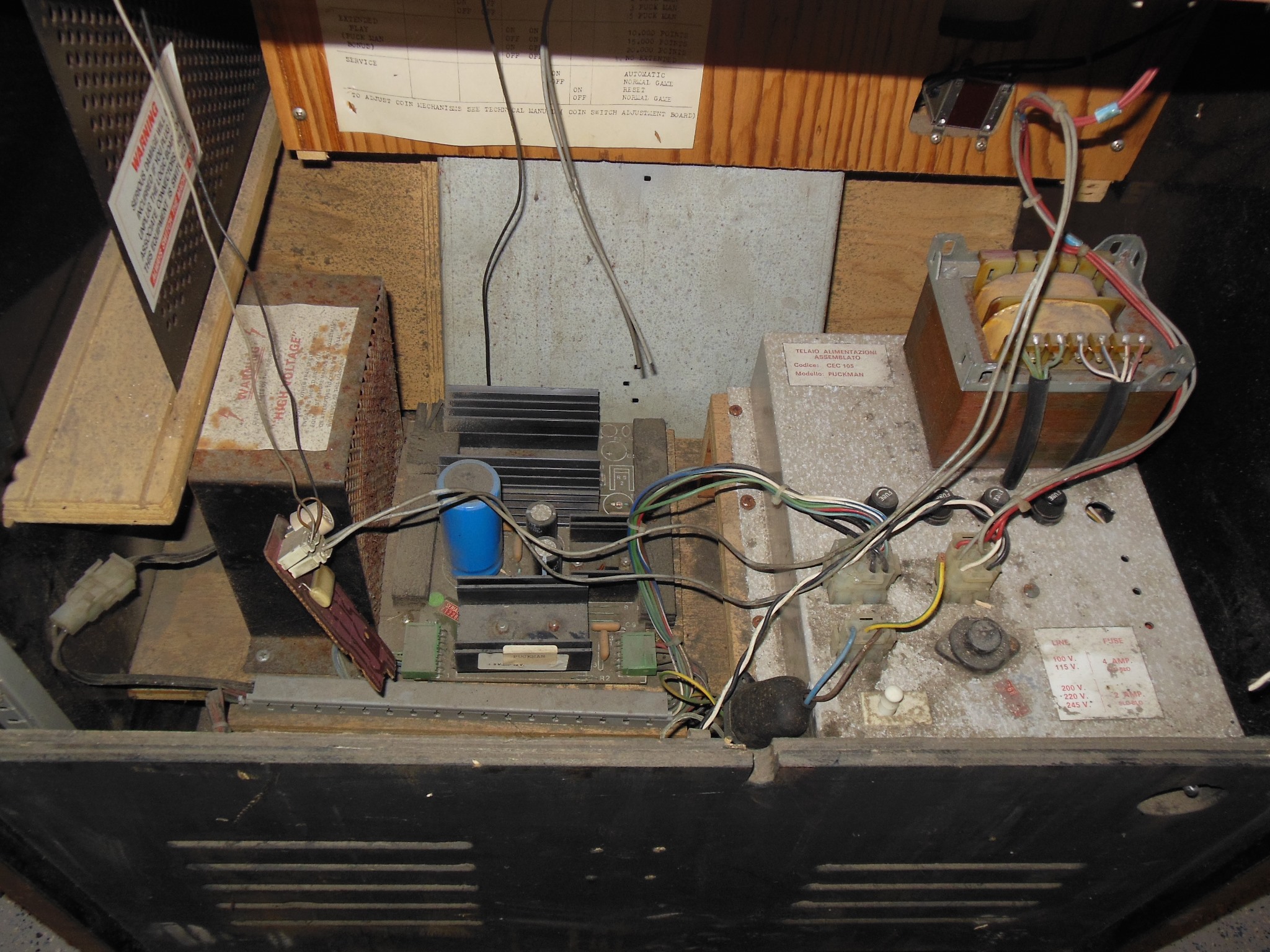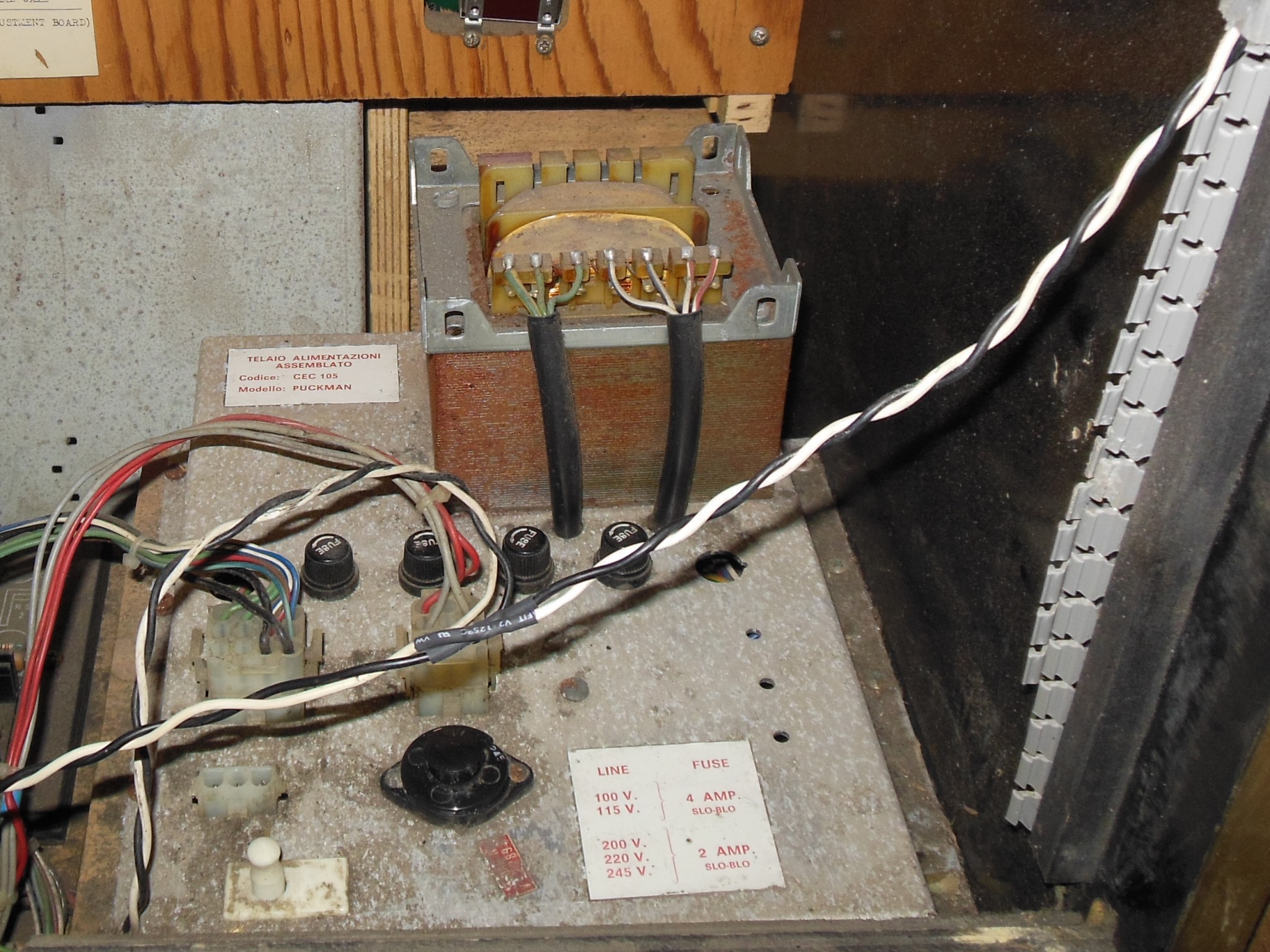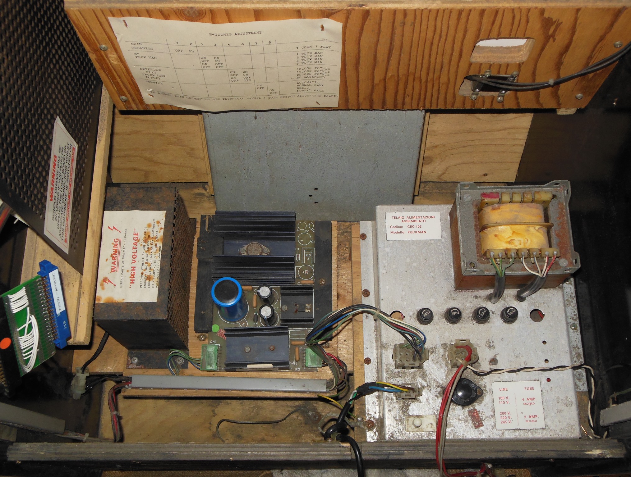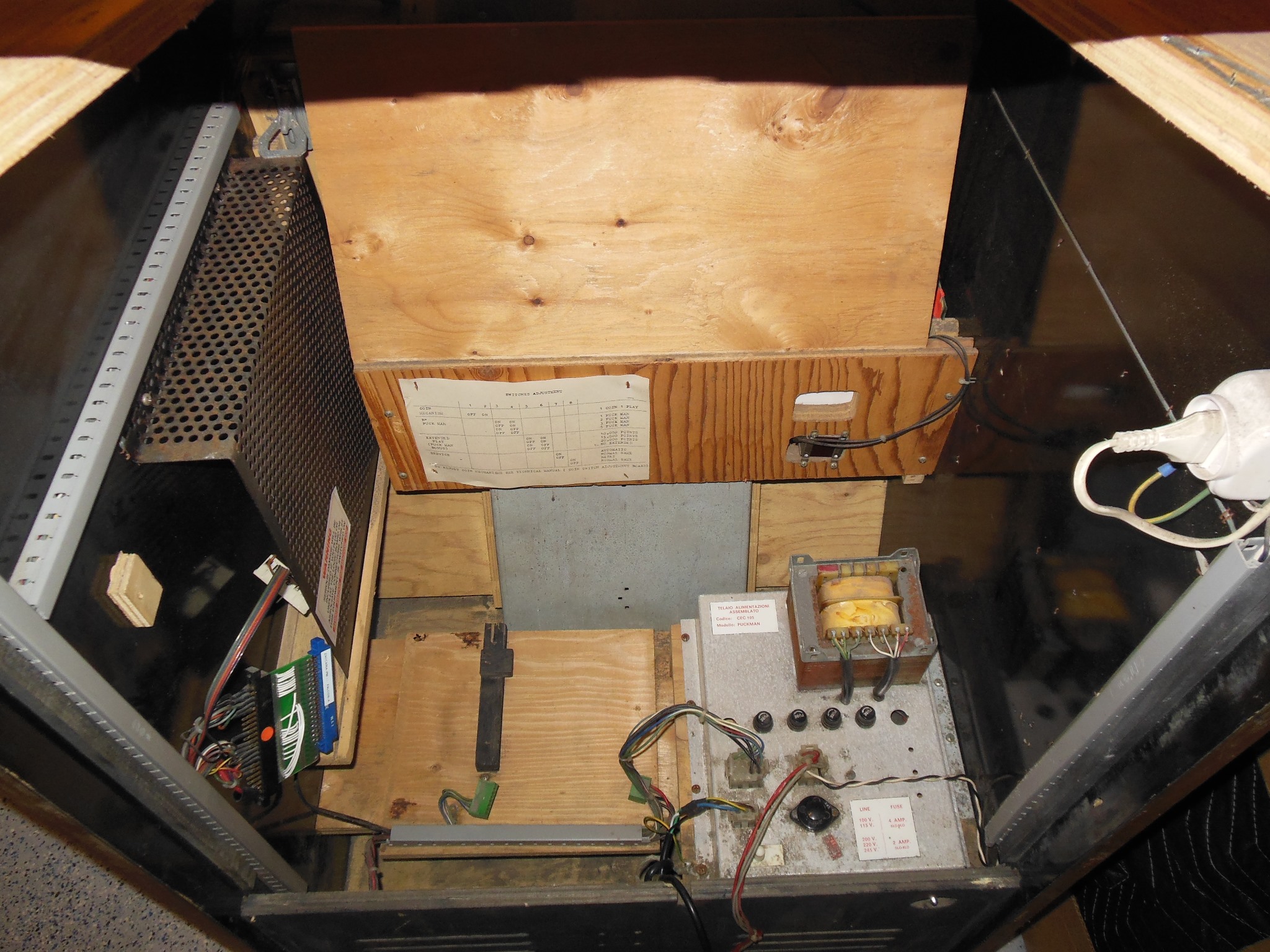 Internally the monitor appeared complete as did all the power supply but the game PCB itself was missing. There were a number of cut wires - the line to the socket for the marque light, one of the monitor ground wires and another pair from the monitor. The power cord itself was missing, replaced by an IEC-14 socket.