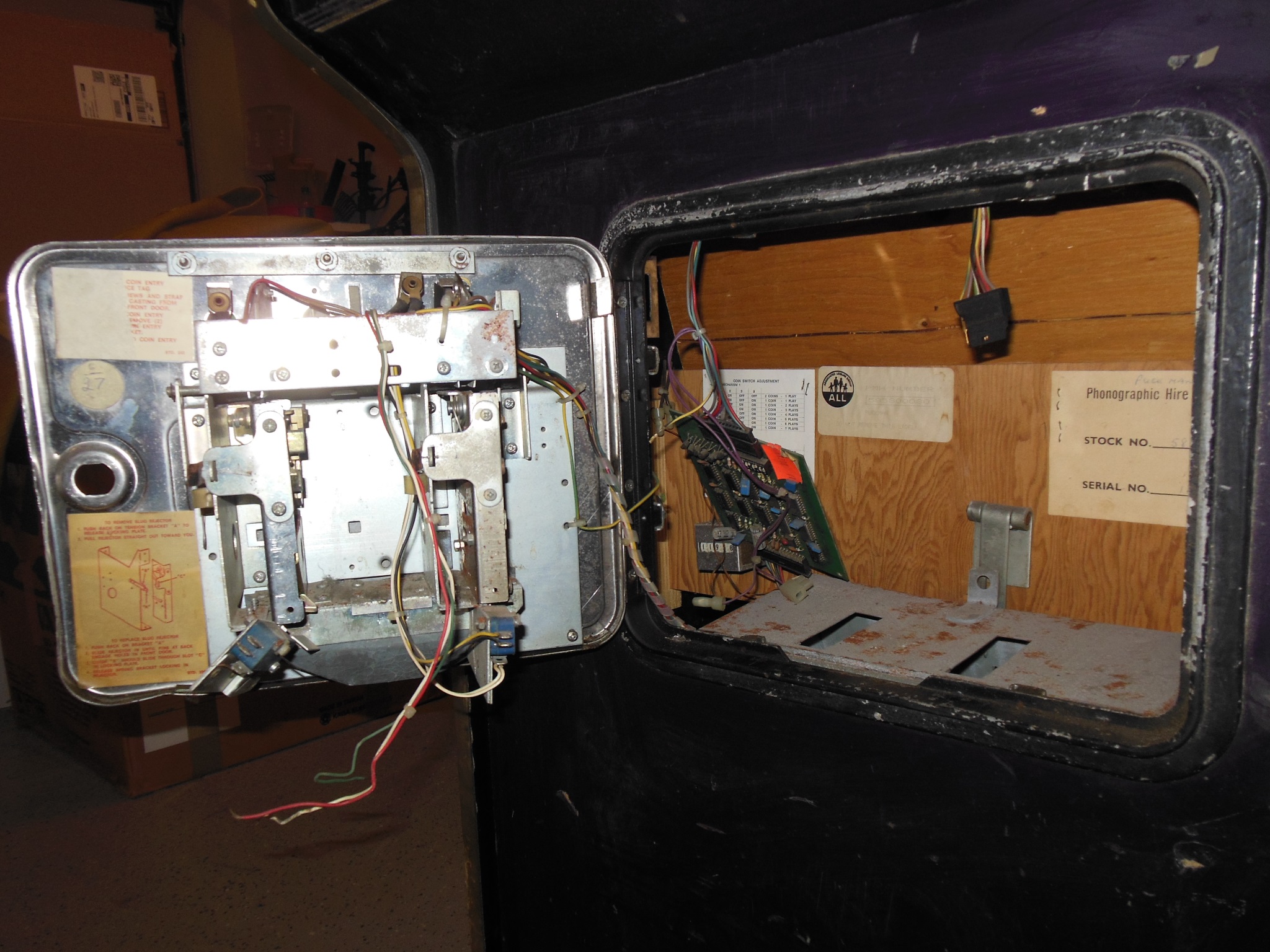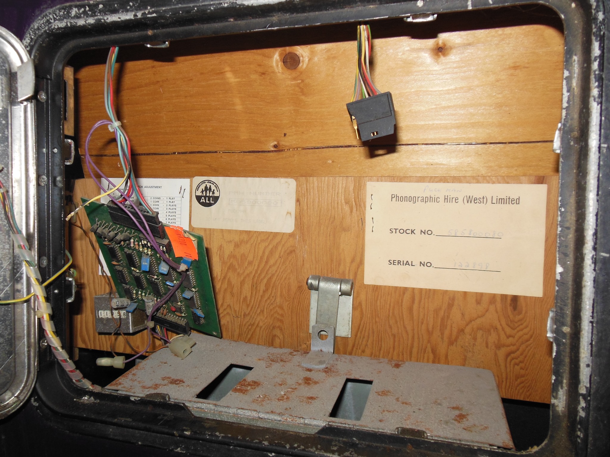One of the switches on the coin door was damaged with wires pulled off though the cabling to the credit PCB appeared complete. The credit PCB itself was loose inside but still connected. Two labels identified Associated Leisure as the distributor and Phonographic Hire West as the operator.