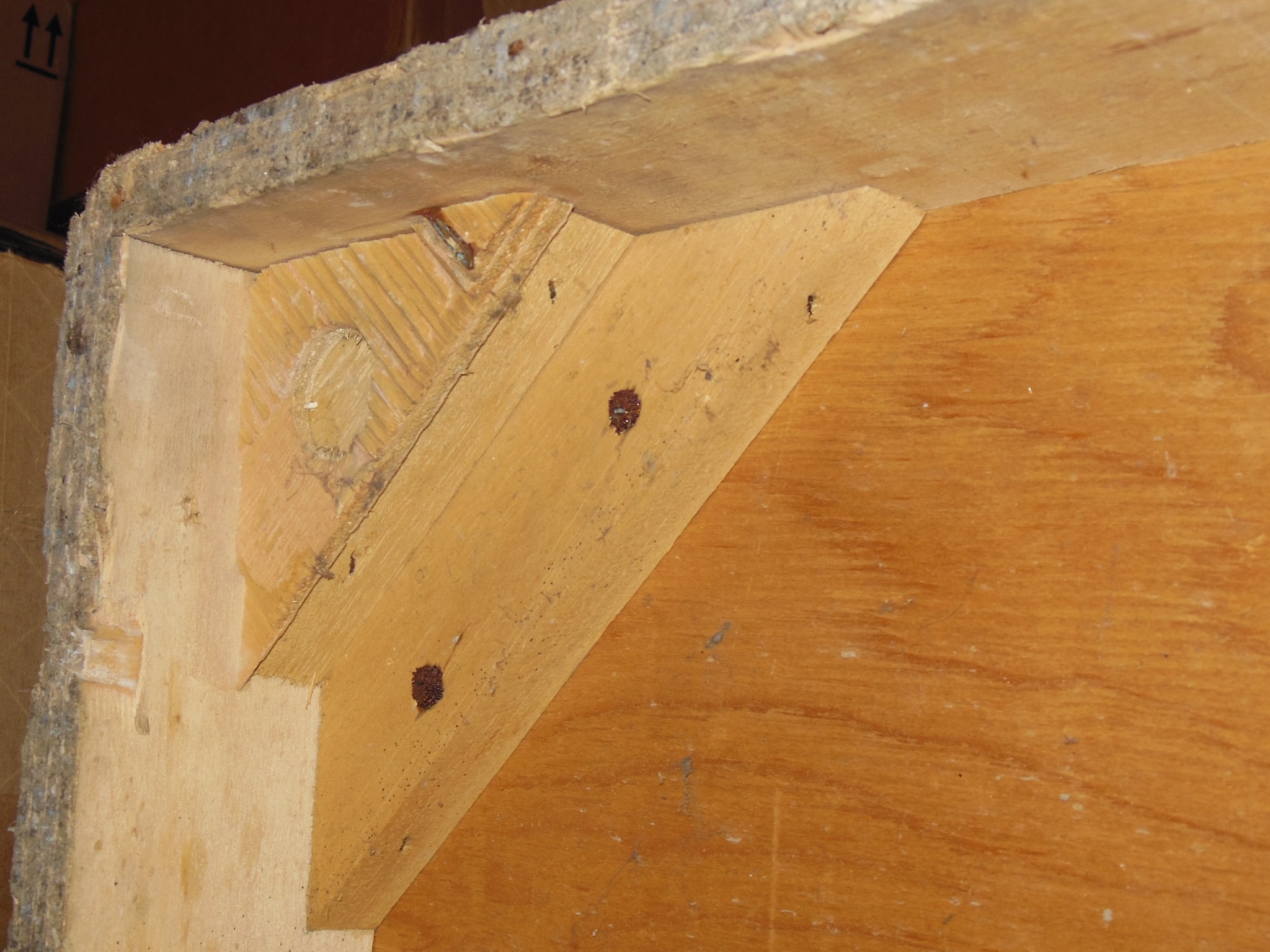 The foot and a portion of the foot block was missing that needed to be repaired before castors could be fitted. In a prior restoration I'd reproduced the wood components used to construct the foot block and had a piece already to hand. The remains of the old triangle piece was chiseled off and the layer underneath sanded down to ensure a good surface for the adhesive. The reproduction replacement piece was then glued & screwed into place.