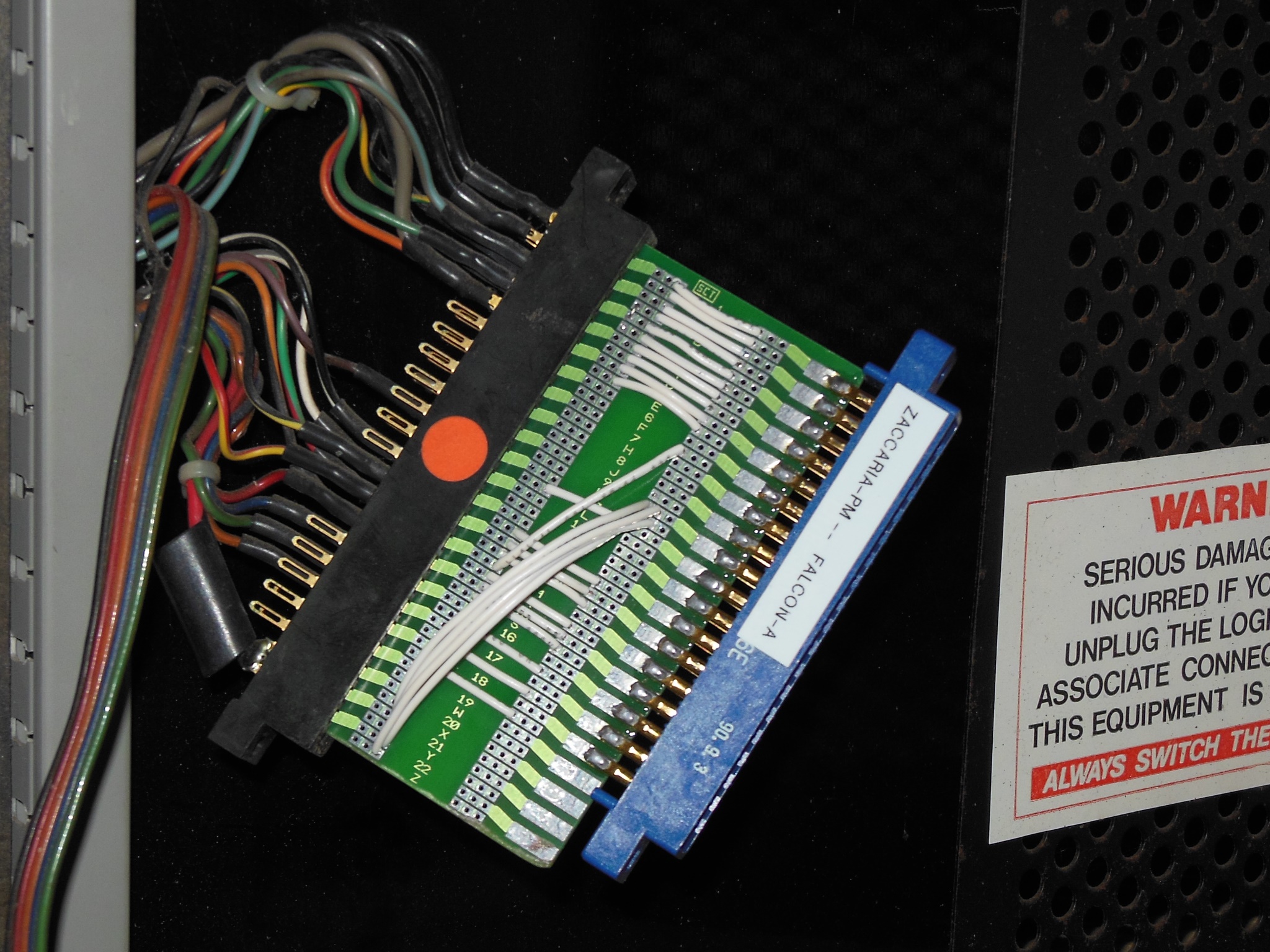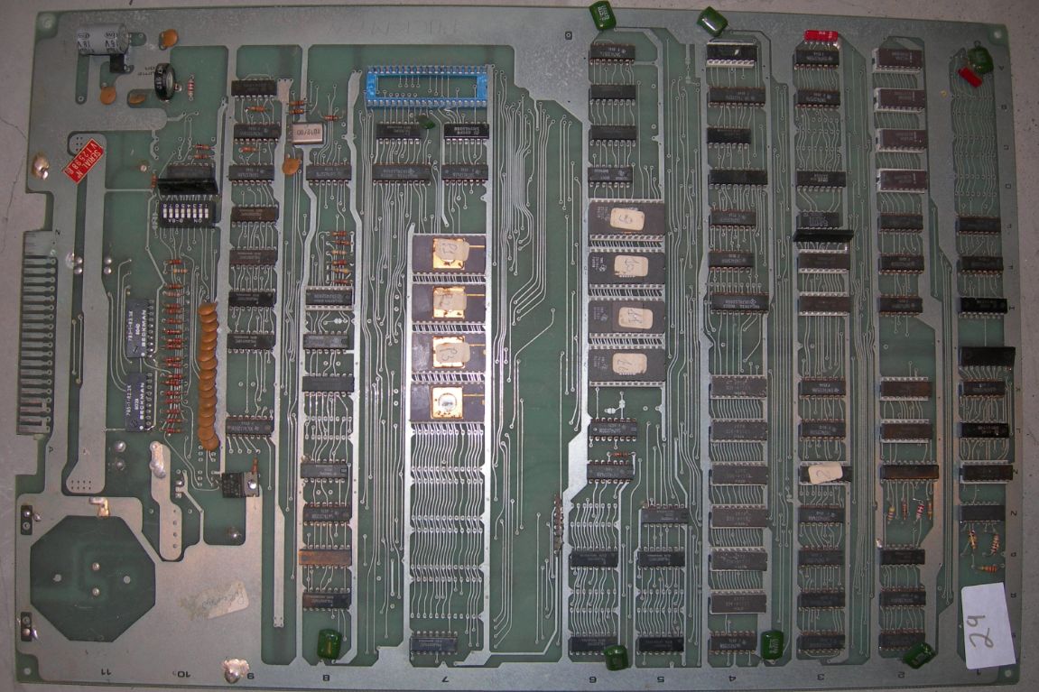 I didn't have any original Zaccaria Puck Man game PCBs for this cabinet. In my picture archive I found only one photo describing a Zaccaria Puck Man PCB with a Zaccaria serial number and an edge connector pinout that appeared to be a possible match for this cabinet. Instead I planned to use a couple of good quality Falcon Ms. Pacman PCBs converted to Puck Man with an adaptor for the cabinet.
